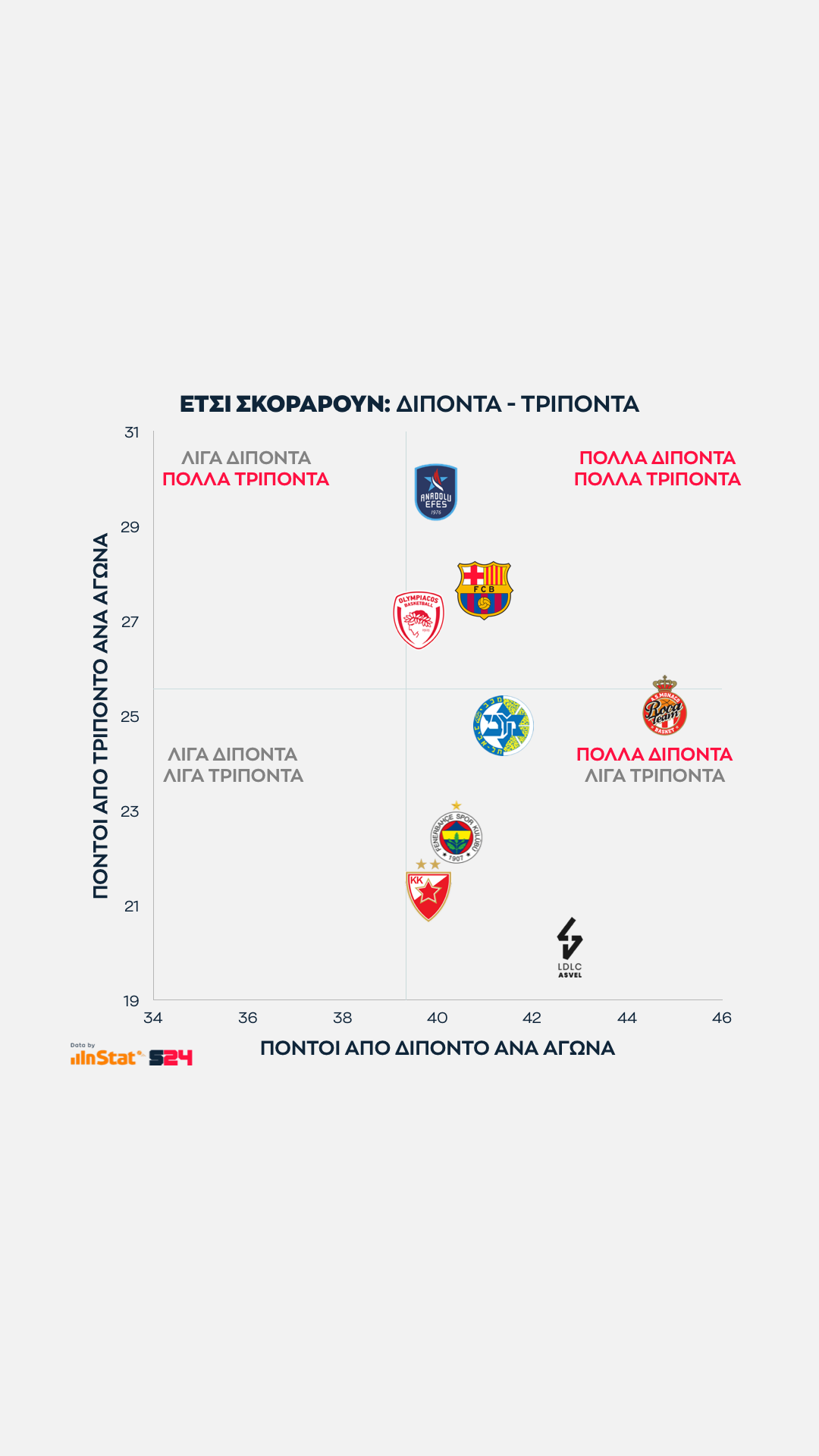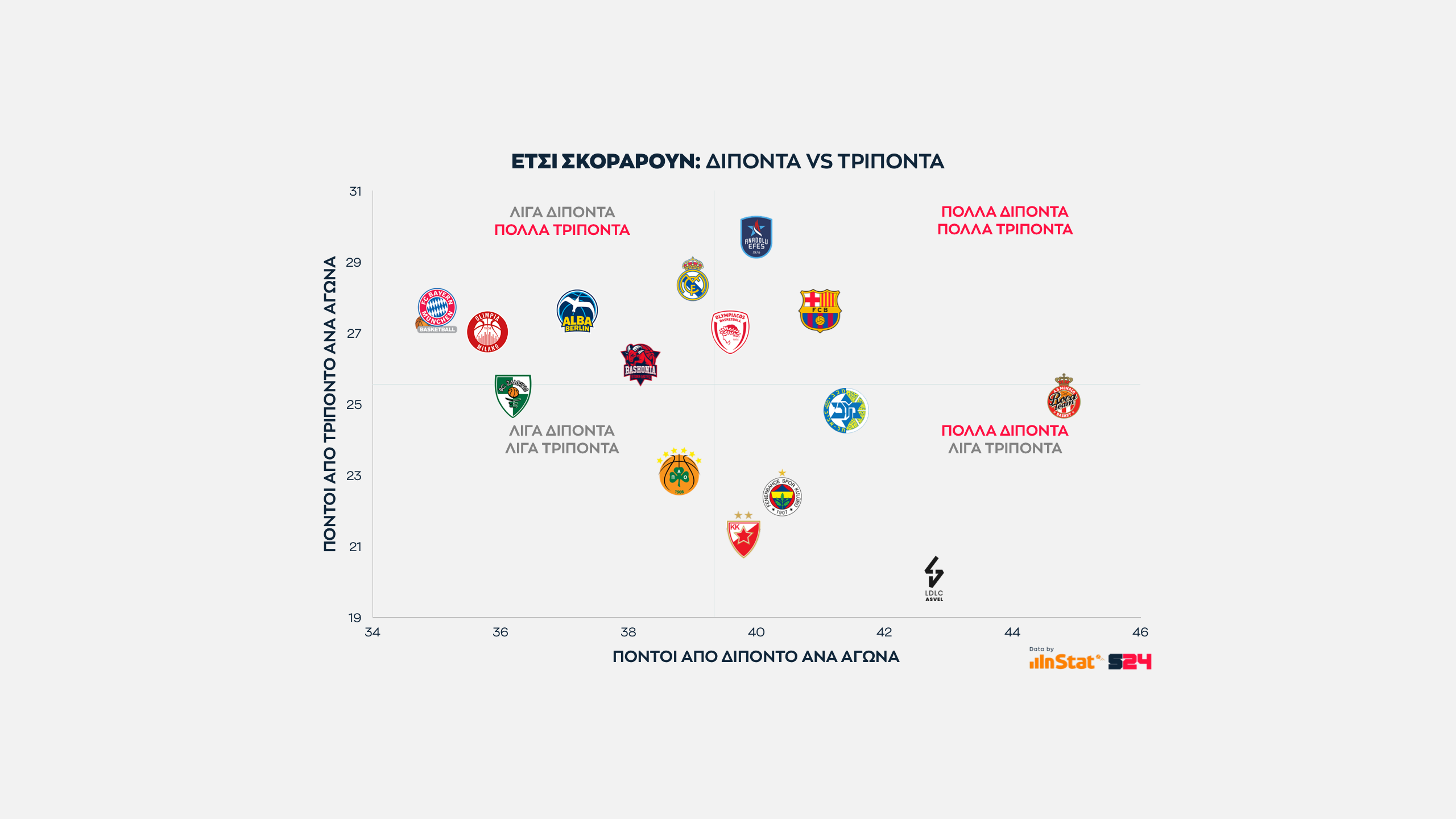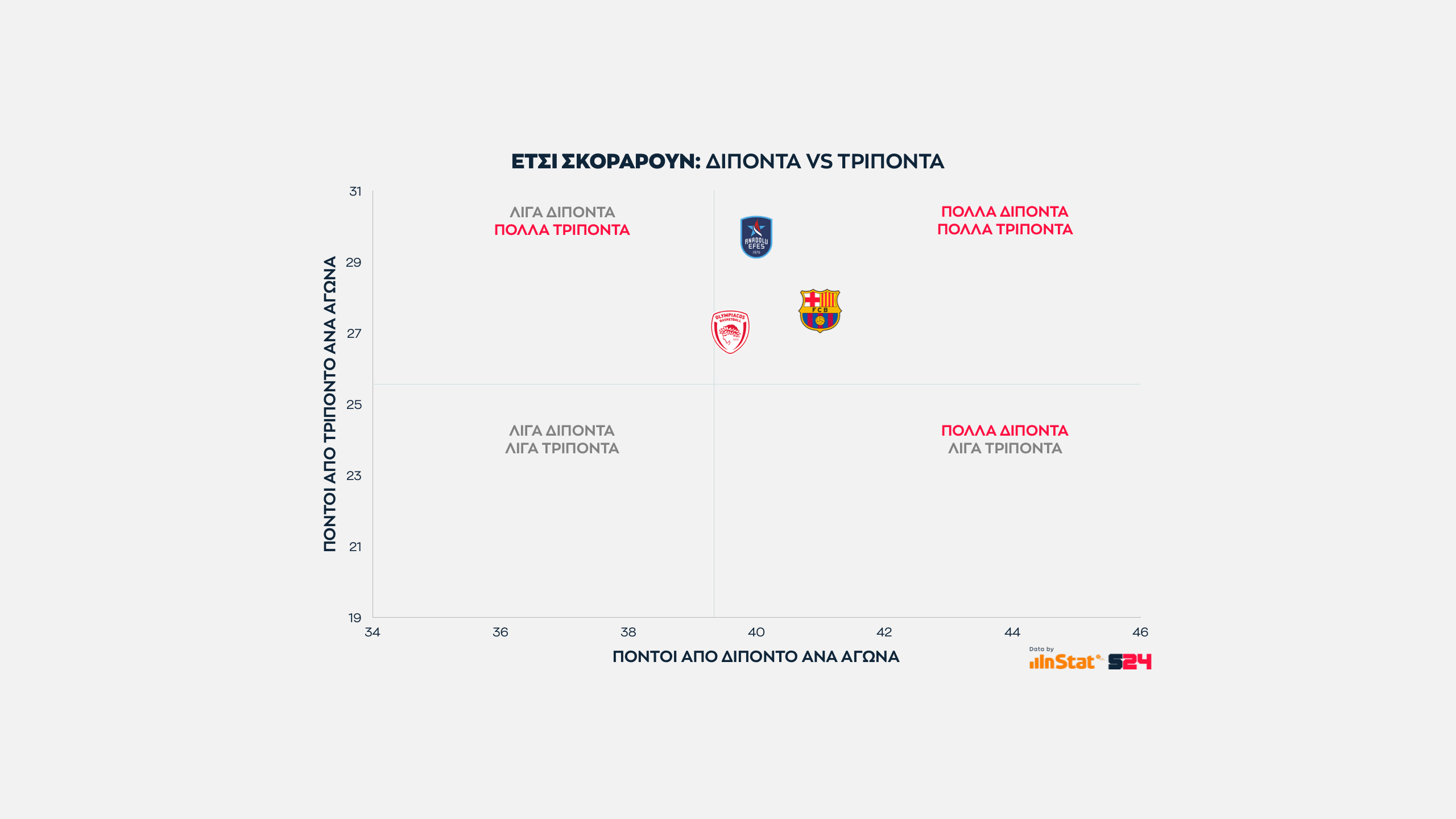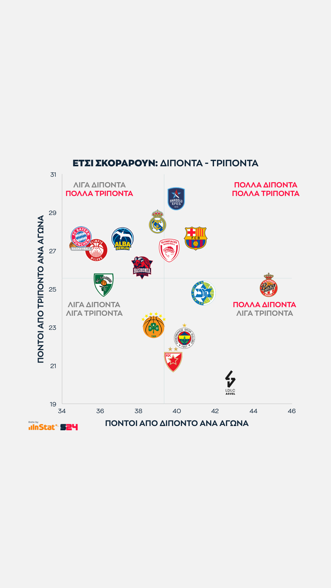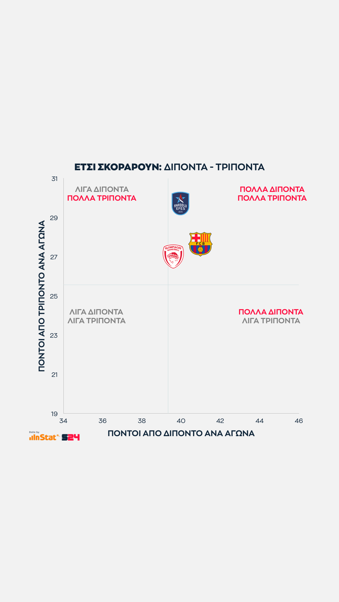 Ψηλότερα βρίσκονται οι ομάδες που παίρνουν περισσότερους από τρίποντα, ενώ δεξιότερα οι ομάδες που βρίσκουν παραπάνω σκορ από μέση ή κοντινή απόσταση.