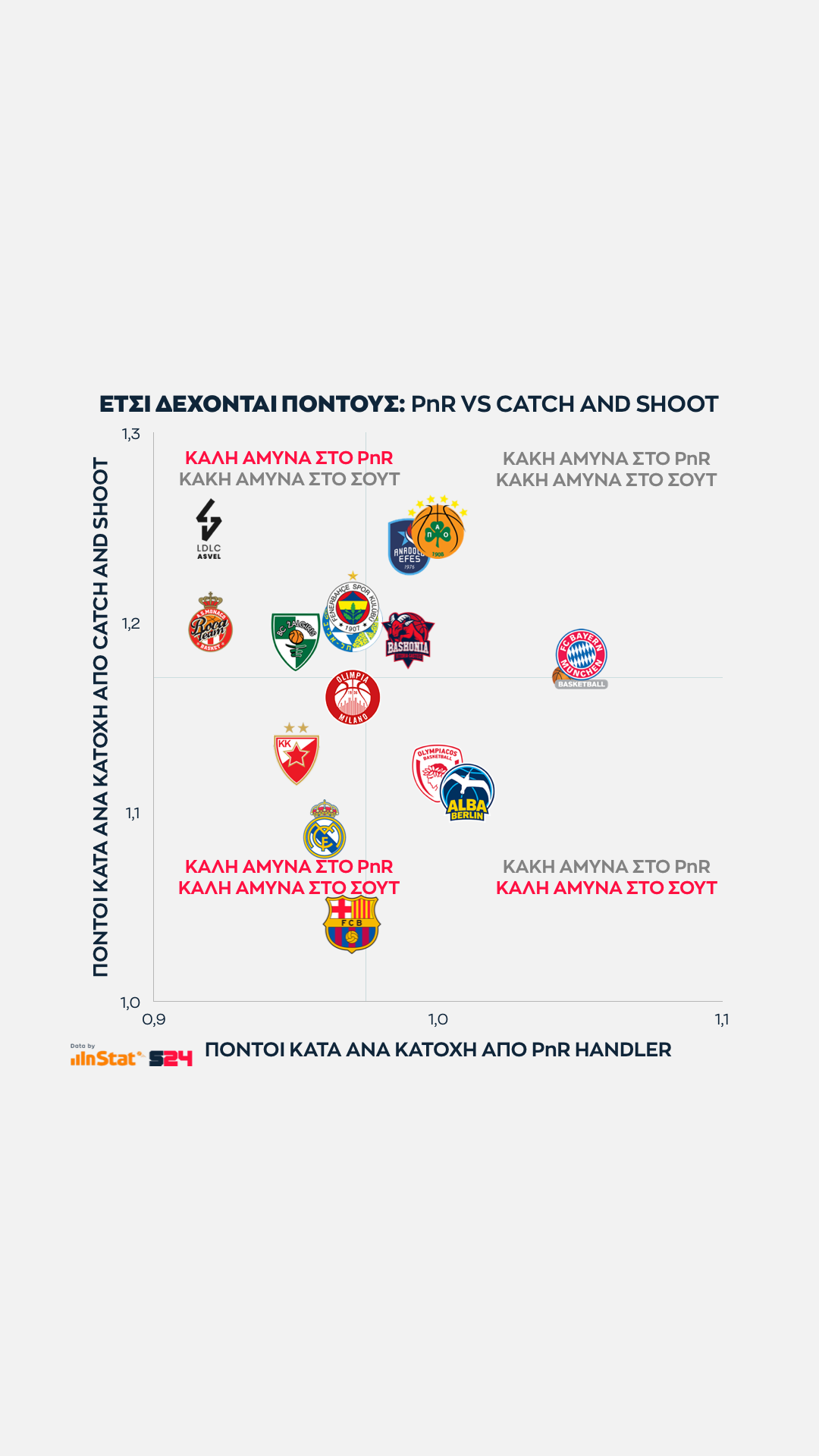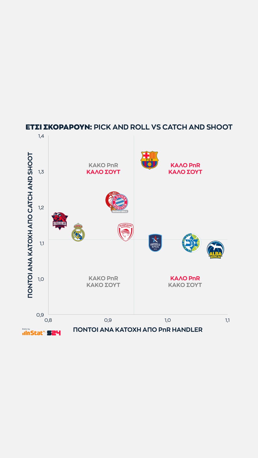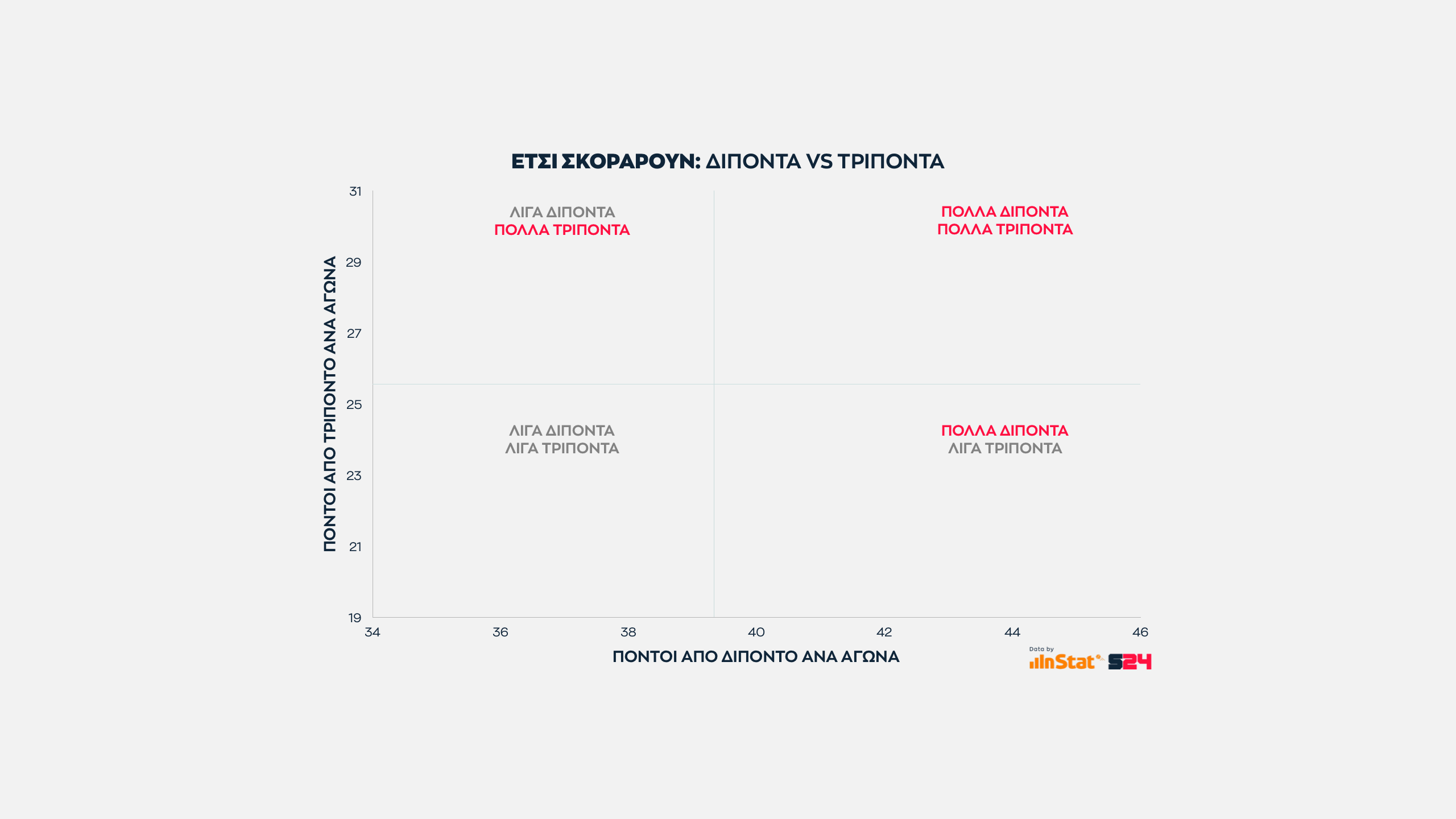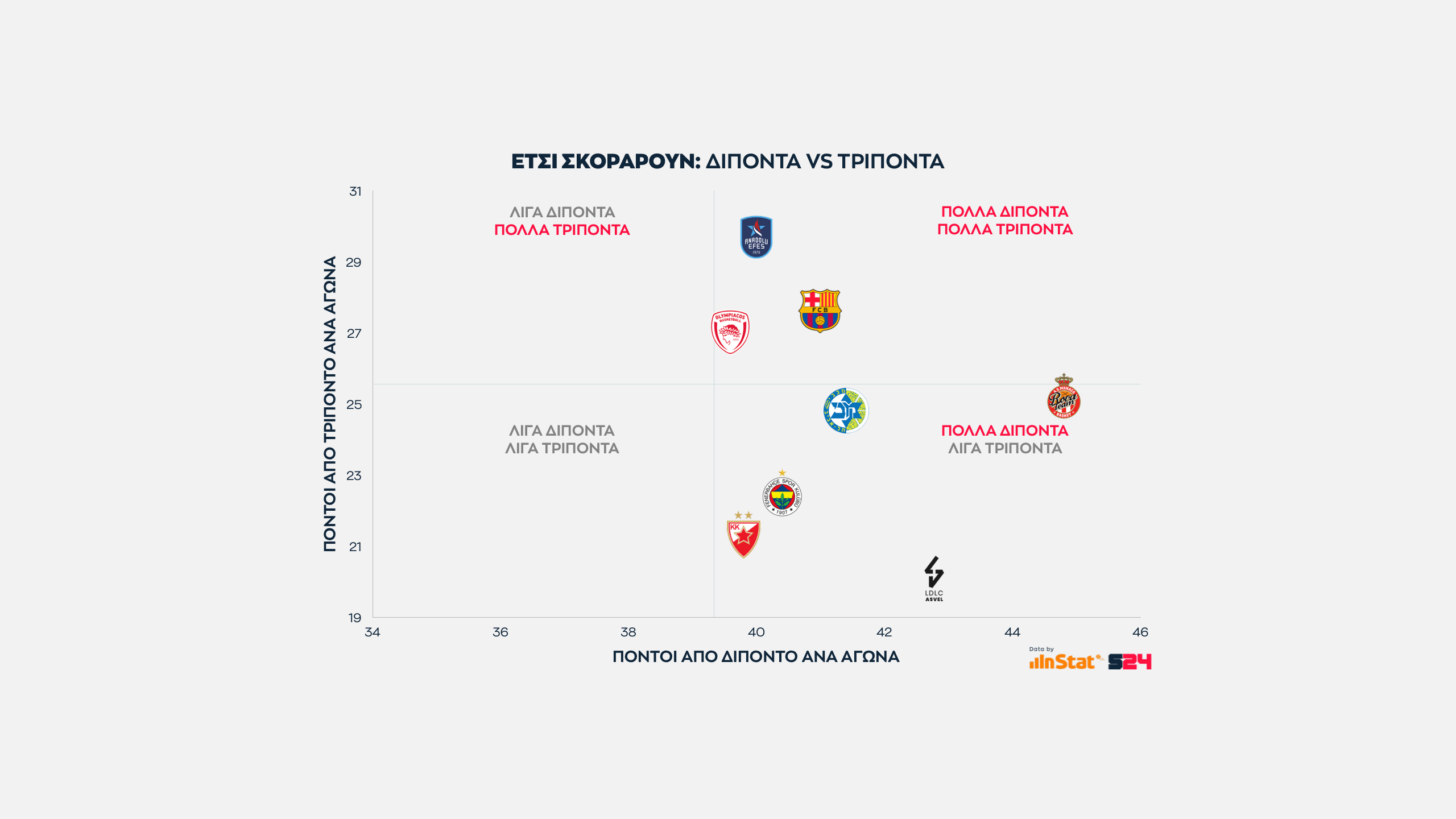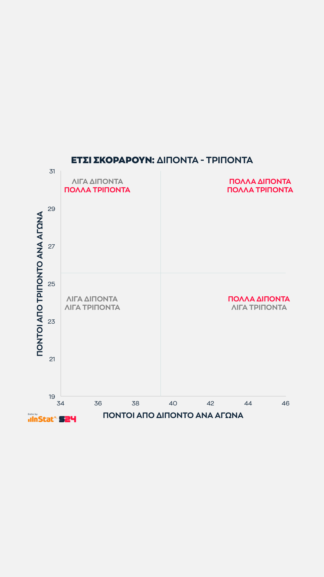 Ψηλότερα βρίσκονται οι ομάδες που παίρνουν περισσότερους από τρίποντα, ενώ δεξιότερα οι ομάδες που βρίσκουν παραπάνω σκορ από μέση ή κοντινή απόσταση.