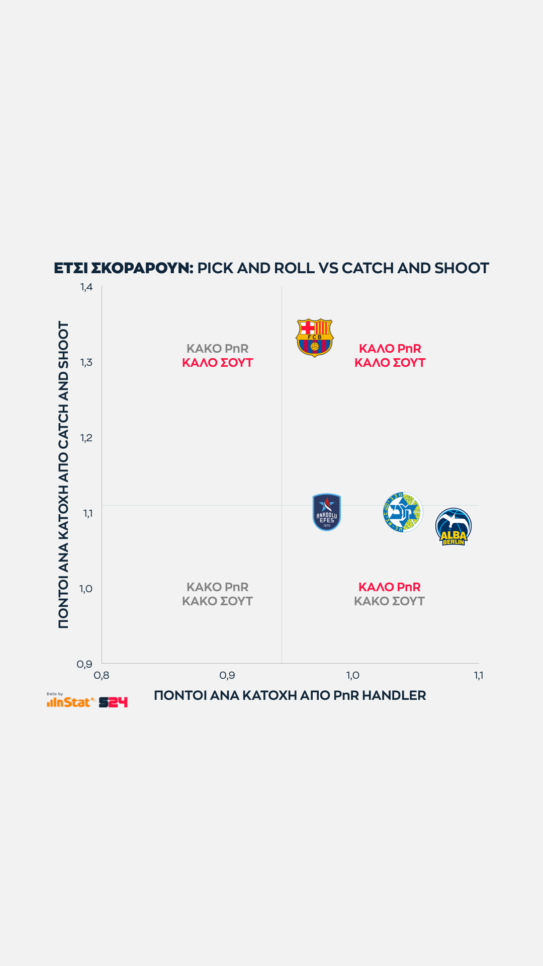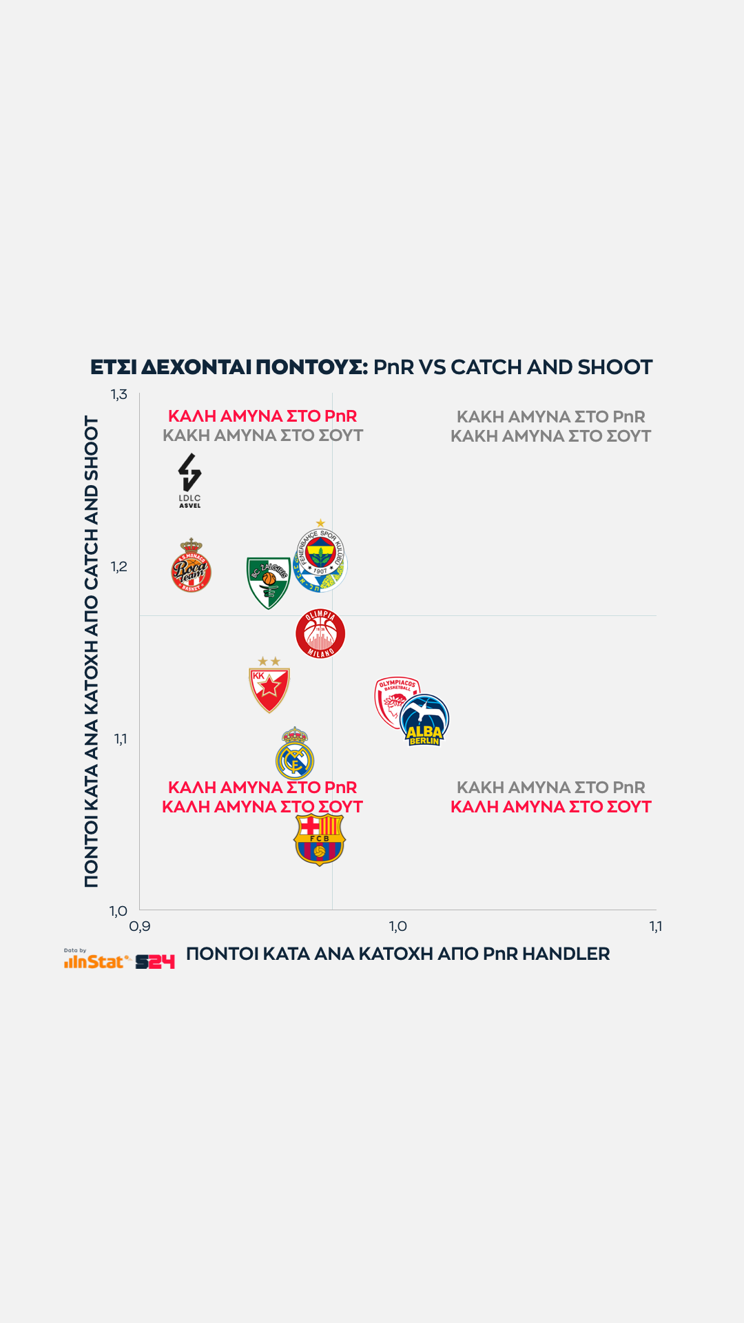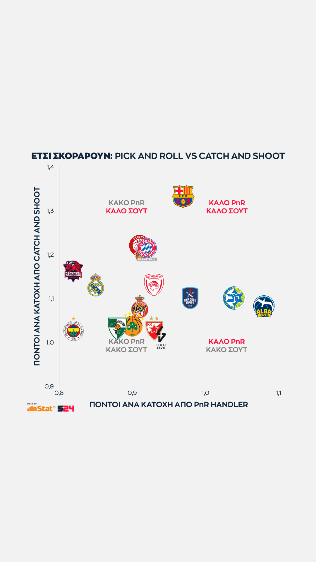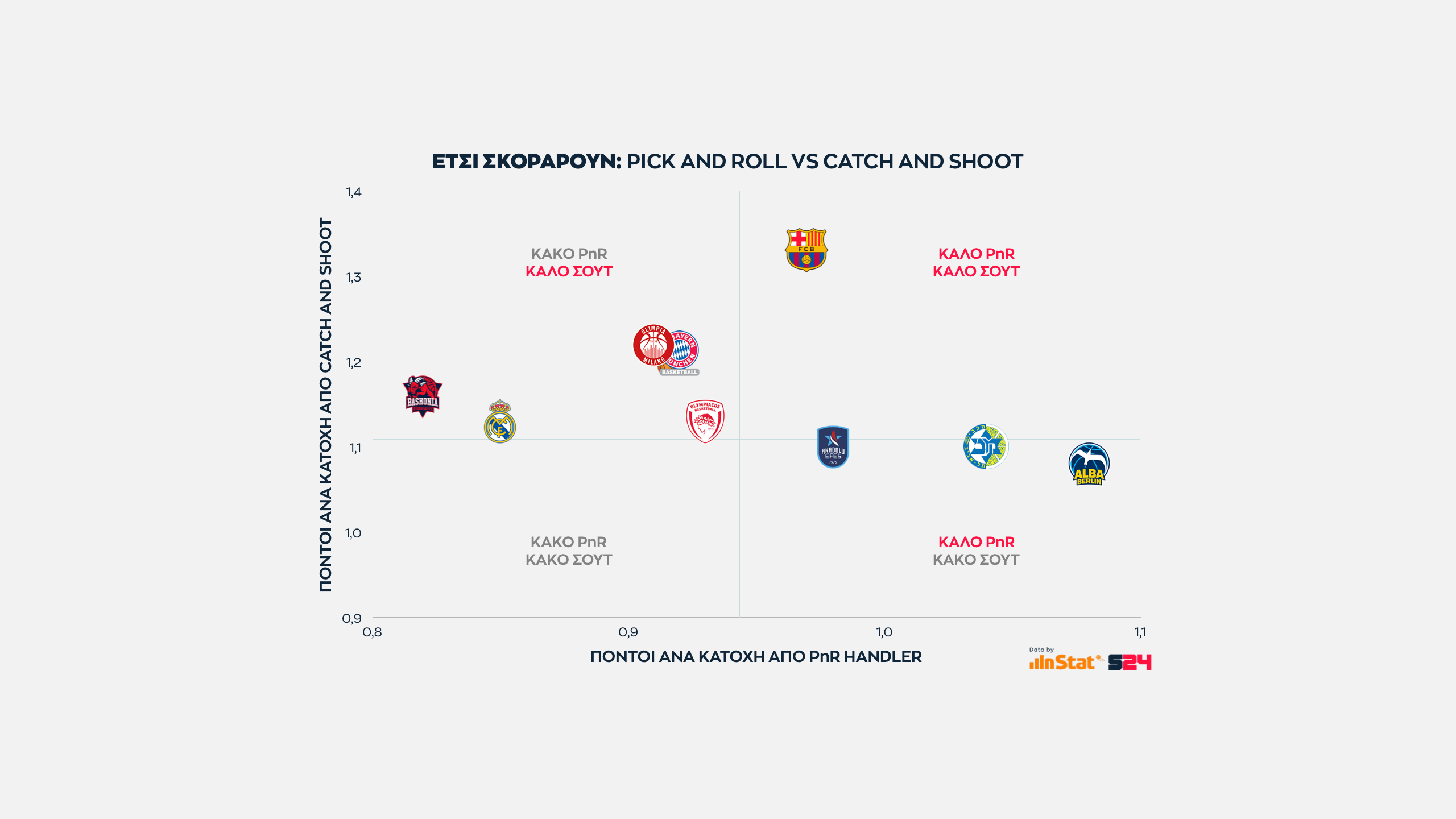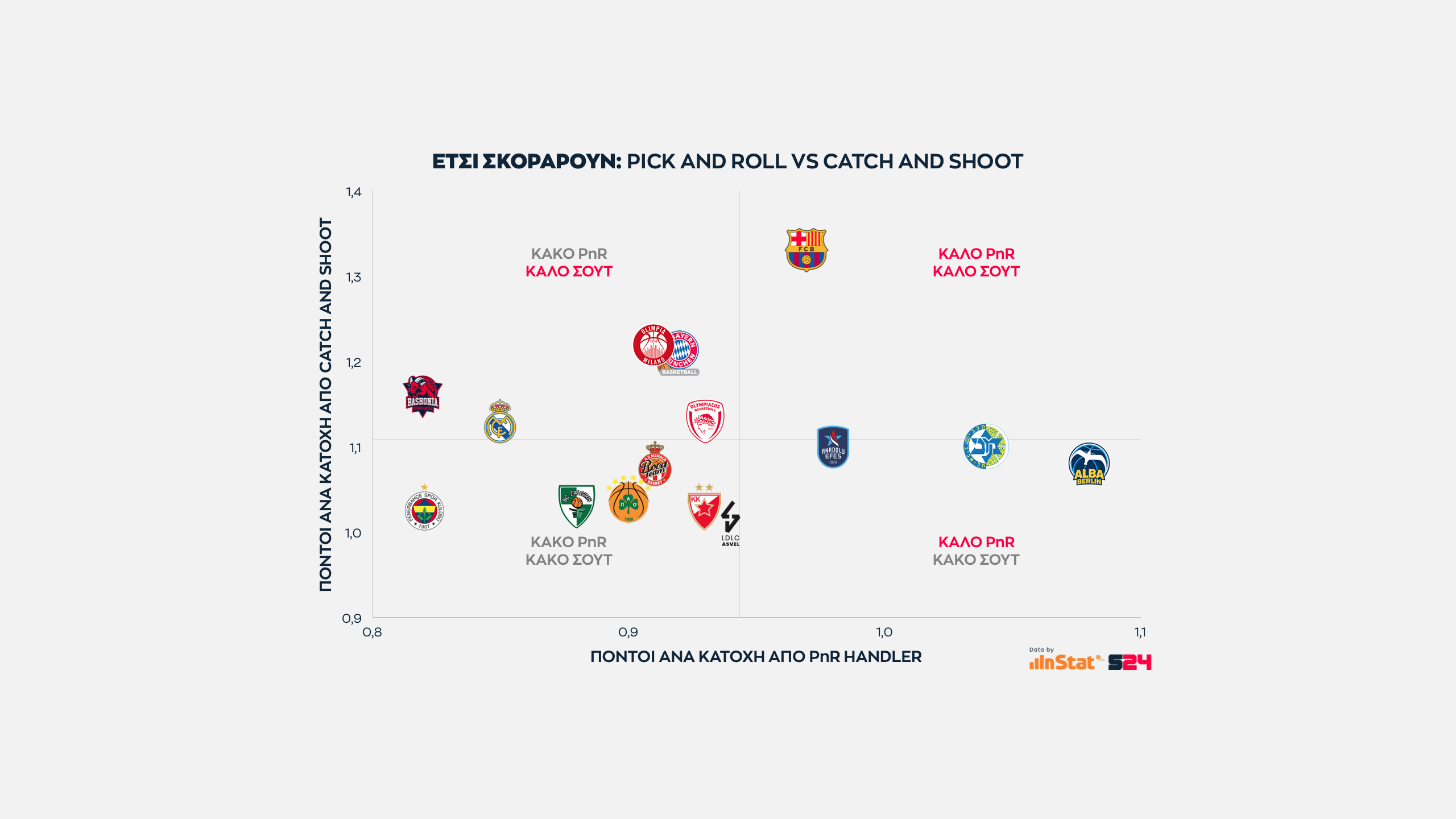 Ψηλότερα βρίσκονται οι ομάδες που παίρνουν περισσότερους από τρίποντα, ενώ δεξιότερα οι ομάδες που βρίσκουν παραπάνω σκορ από μέση ή κοντινή απόσταση.