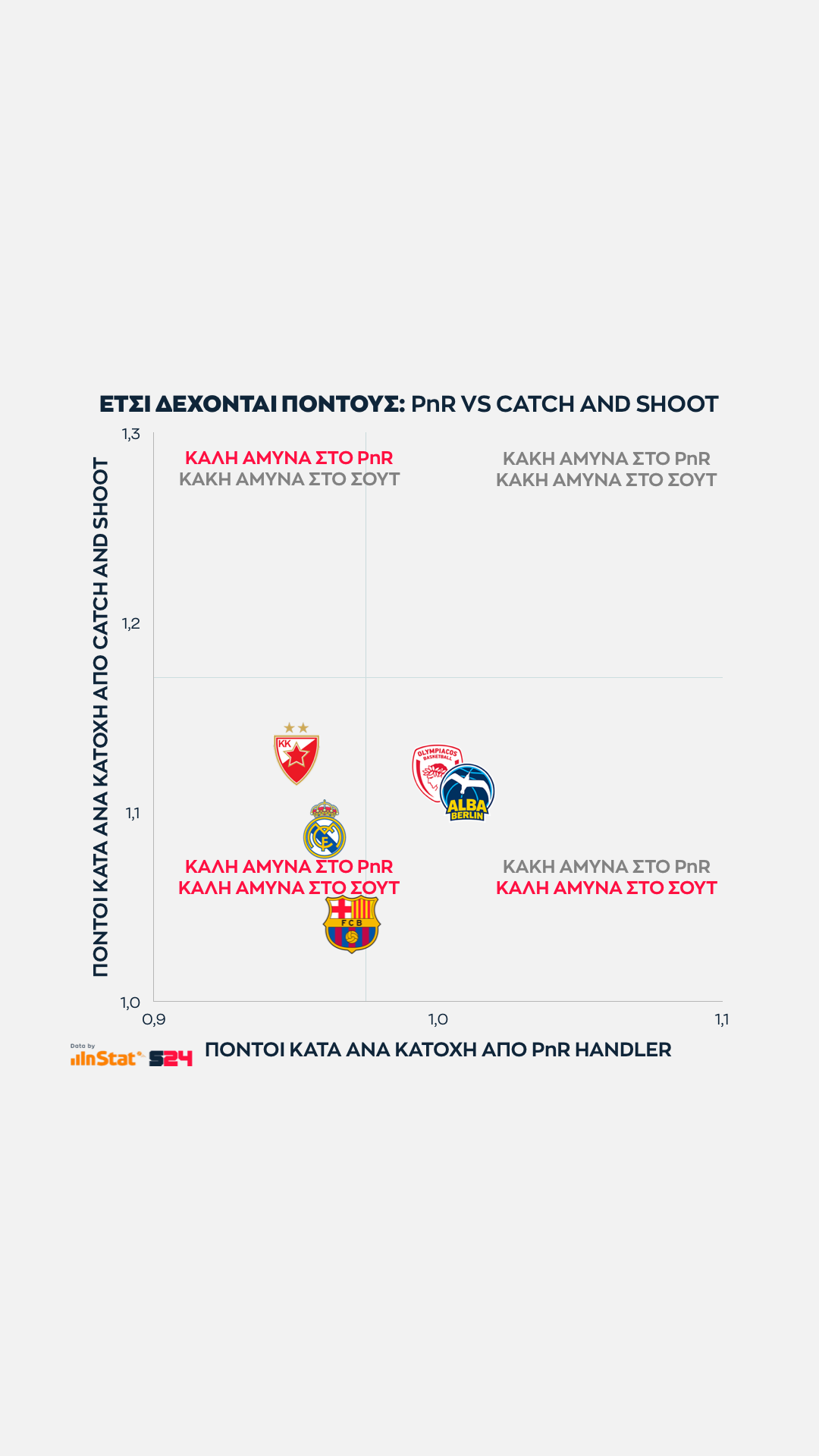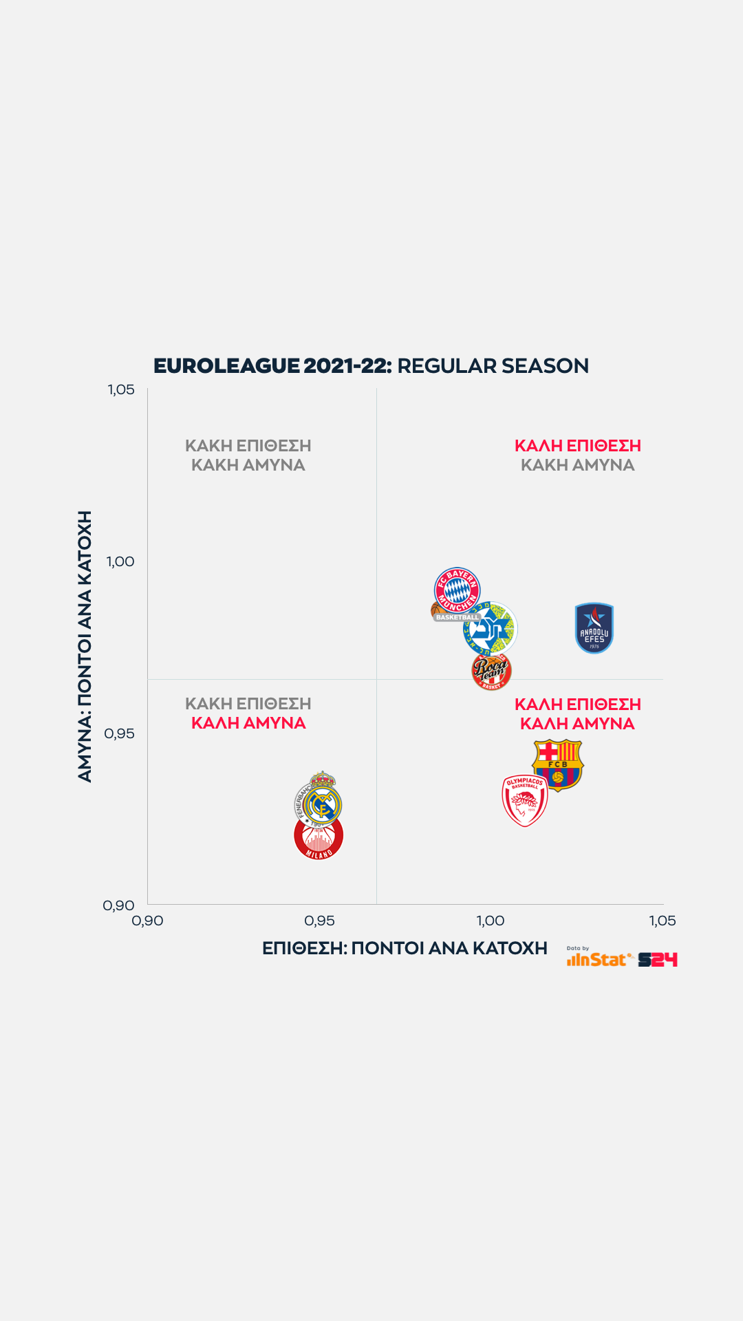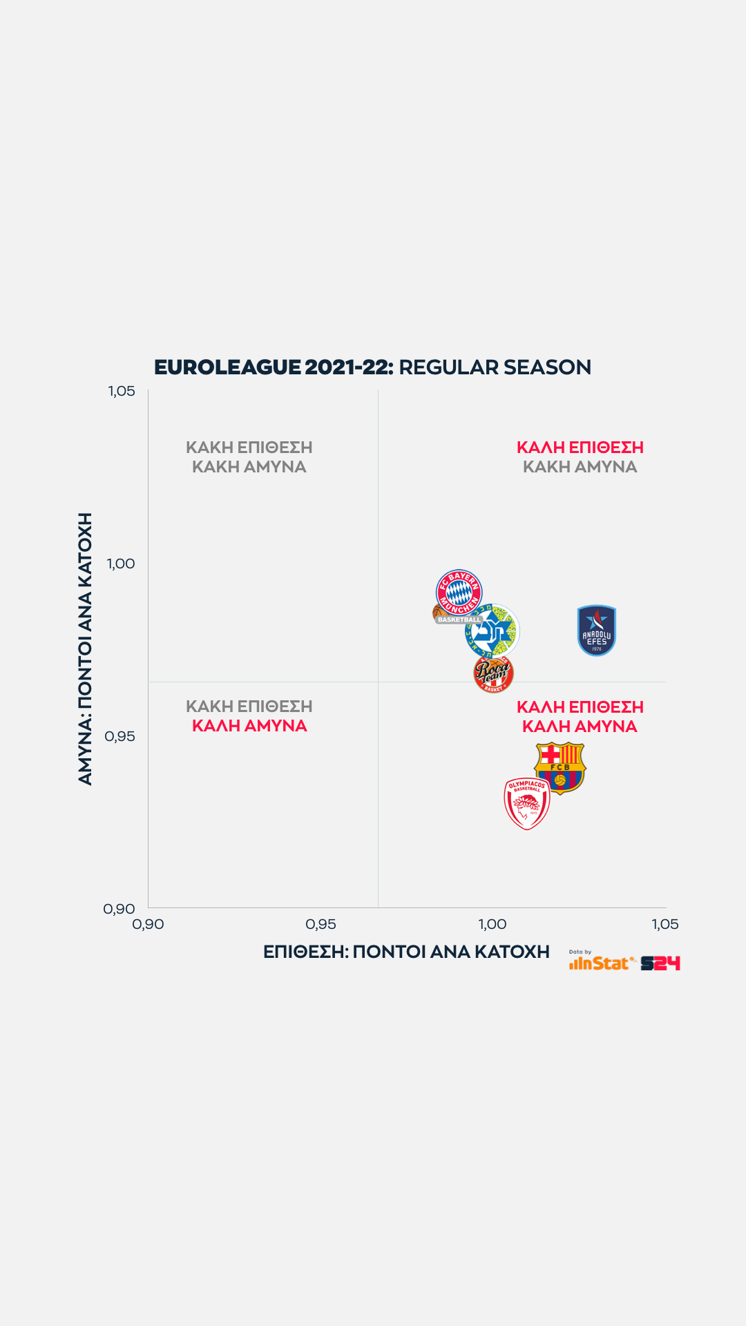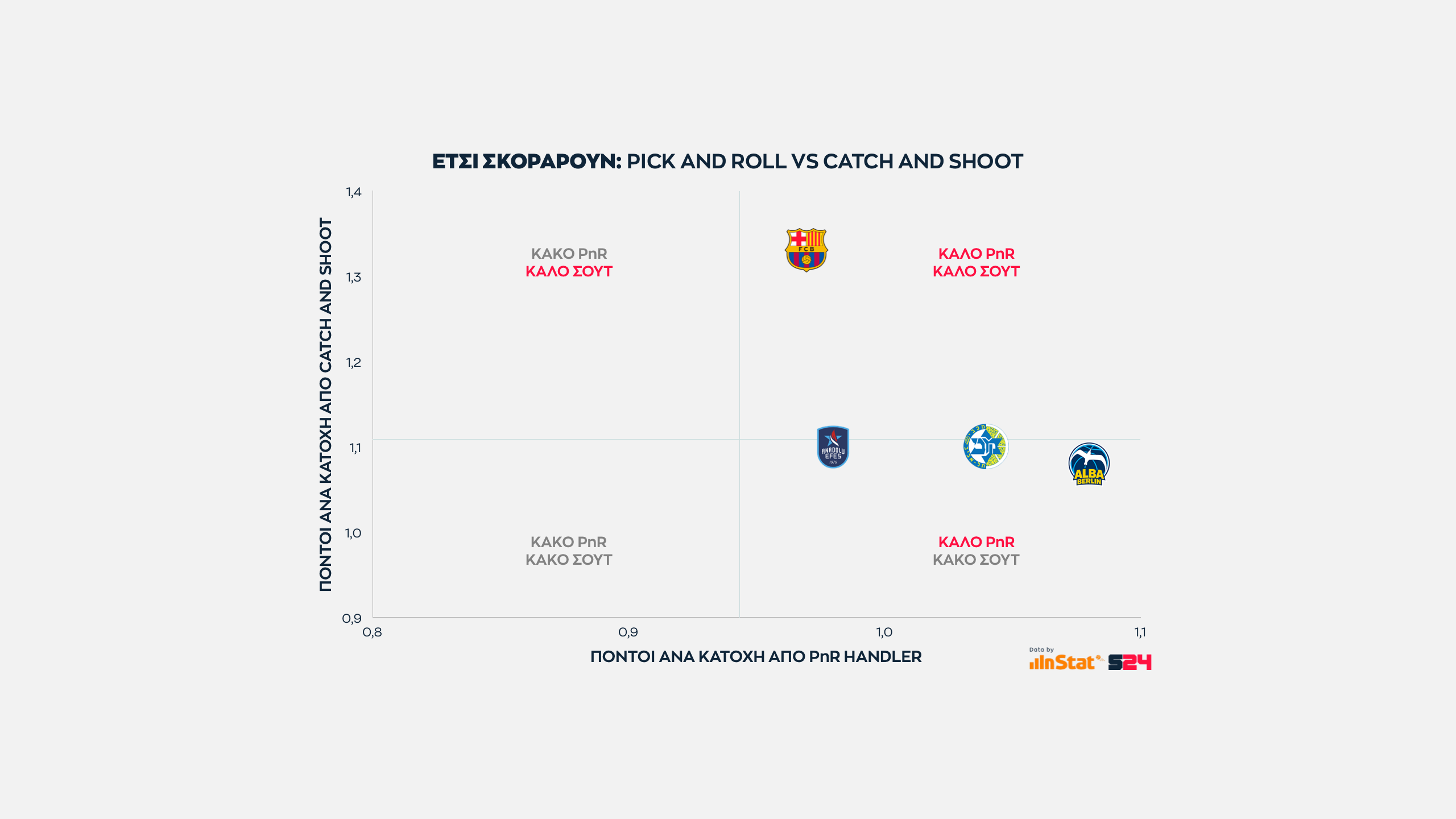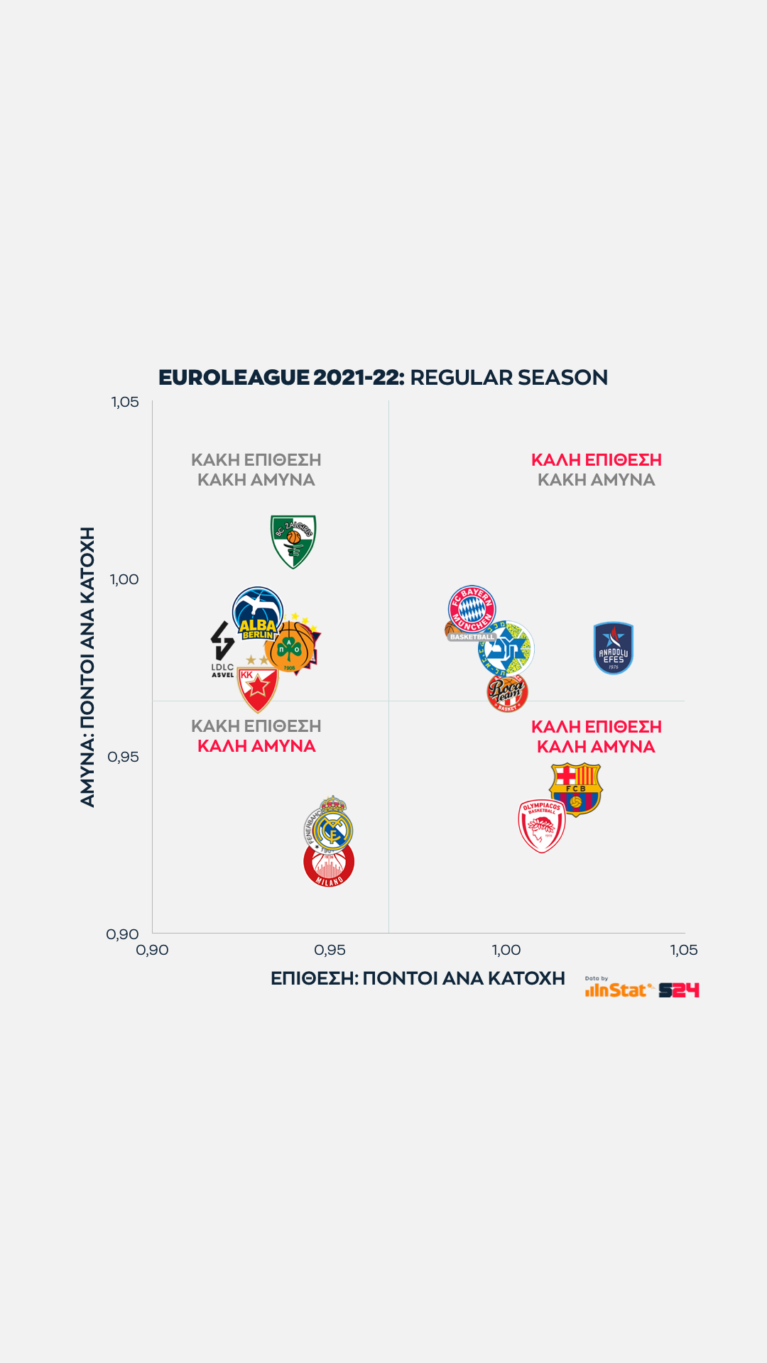Ψηλότερα βρίσκονται οι ομάδες που παίρνουν περισσότερους από τρίποντα, ενώ δεξιότερα οι ομάδες που βρίσκουν παραπάνω σκορ από μέση ή κοντινή απόσταση.