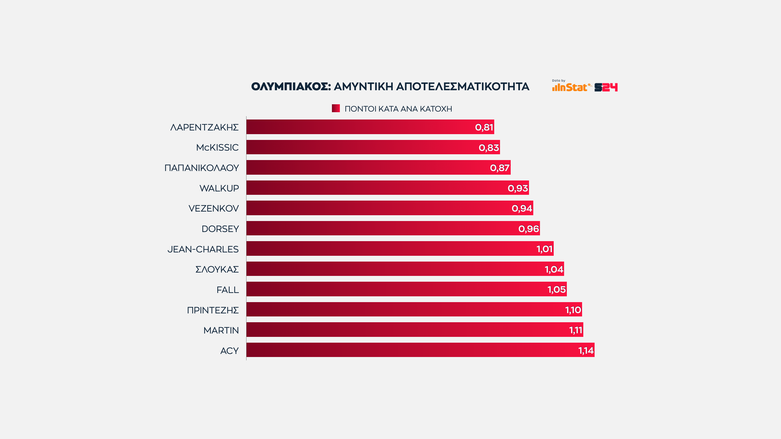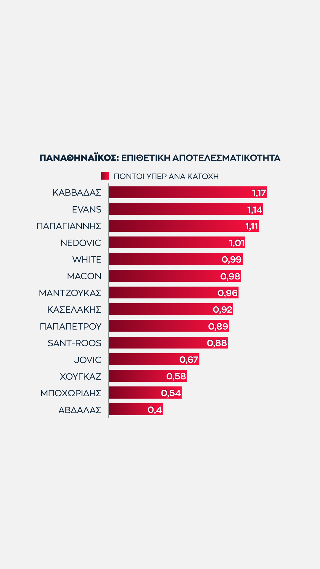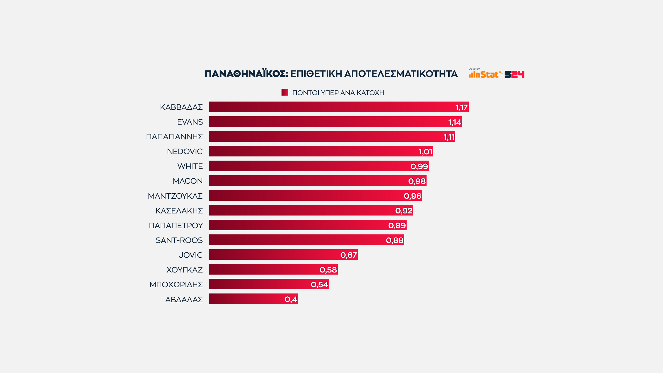Είναι ξεκάθαρο ότι η 2η θέση που κατέκτησαν οι "ερυθρόλευκοι" και η 13η που κατέκτησαν οι "πράσινοι" δημιουργούν συγκεκριμένες συμπεράσματα σχετικά με την απόδοση των παικτών τους.