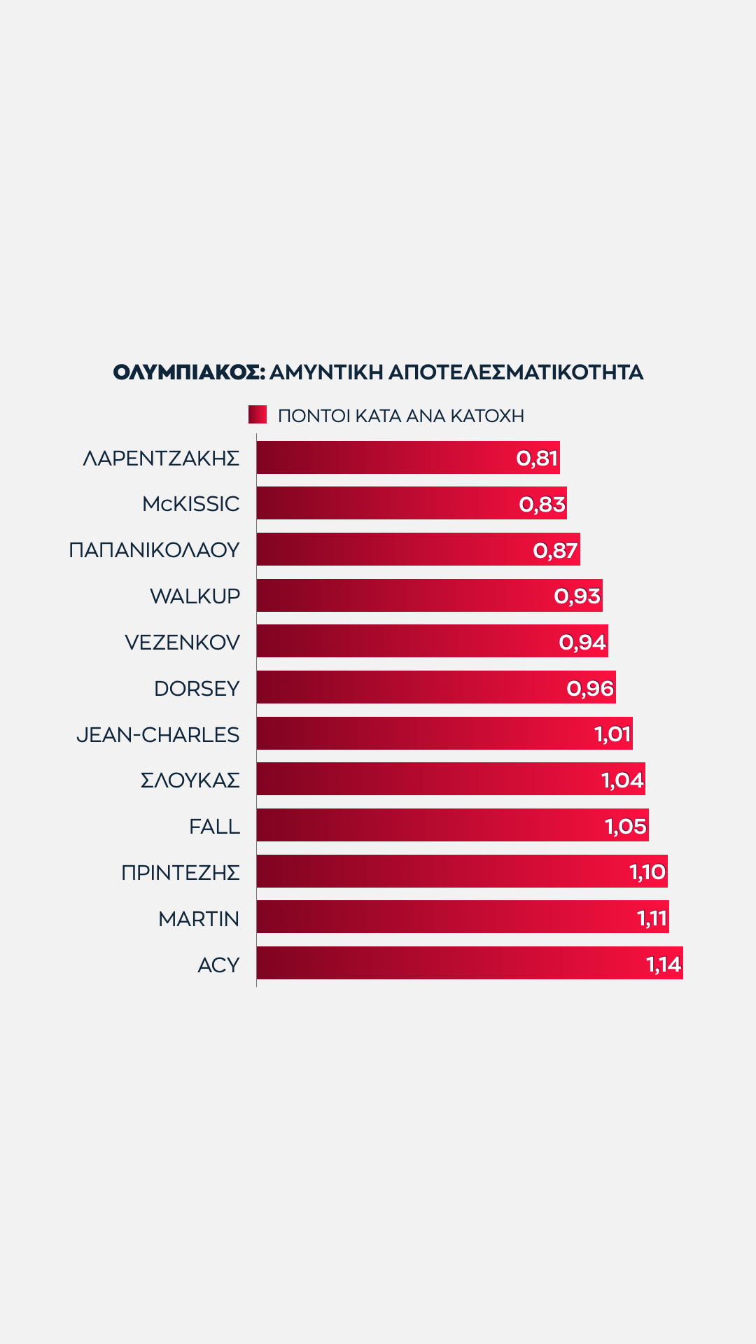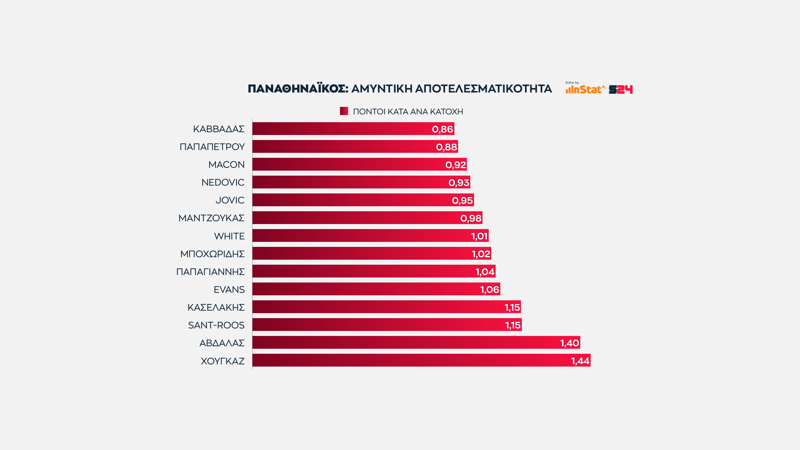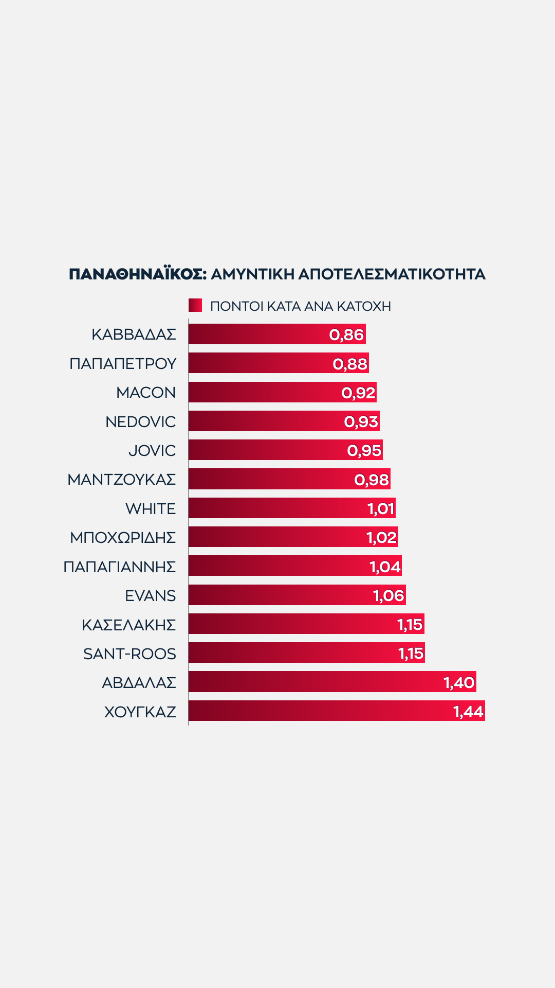 Είναι ξεκάθαρο ότι η 2η θέση που κατέκτησαν οι "ερυθρόλευκοι" και η 13η που κατέκτησαν οι "πράσινοι" δημιουργούν συγκεκριμένες συμπεράσματα σχετικά με την απόδοση των παικτών τους.