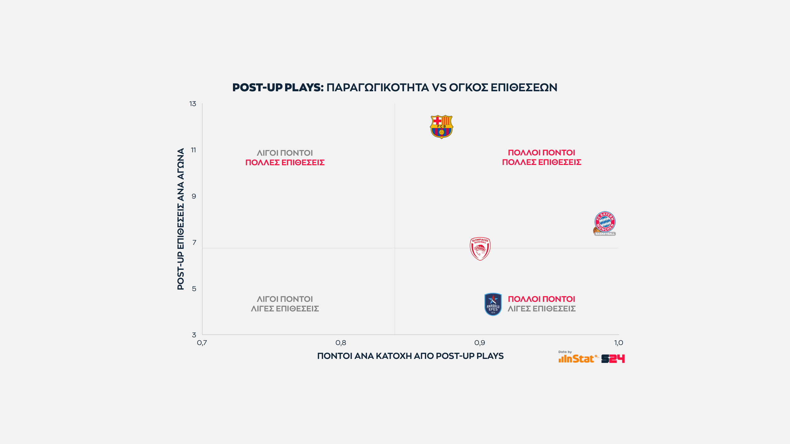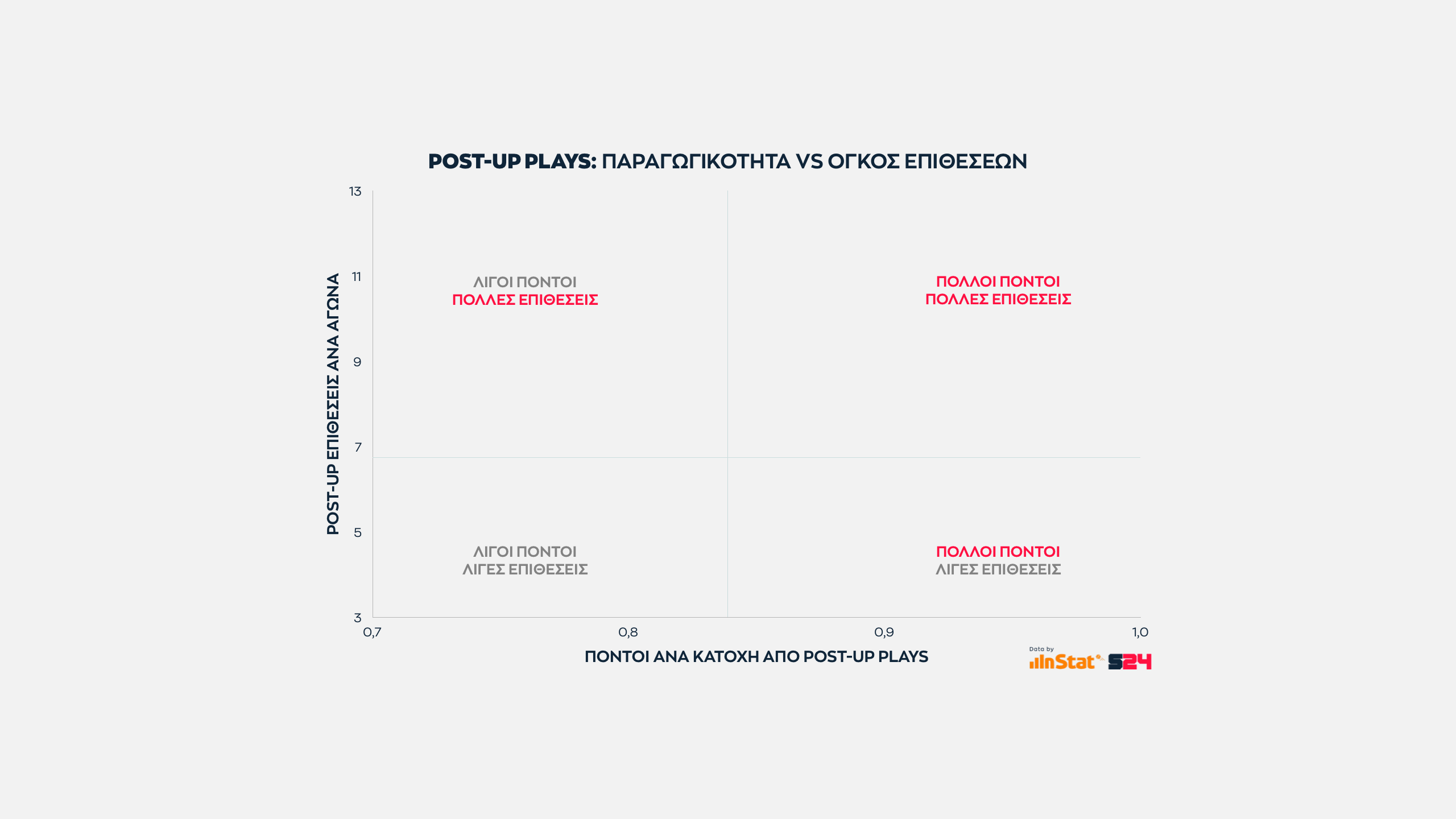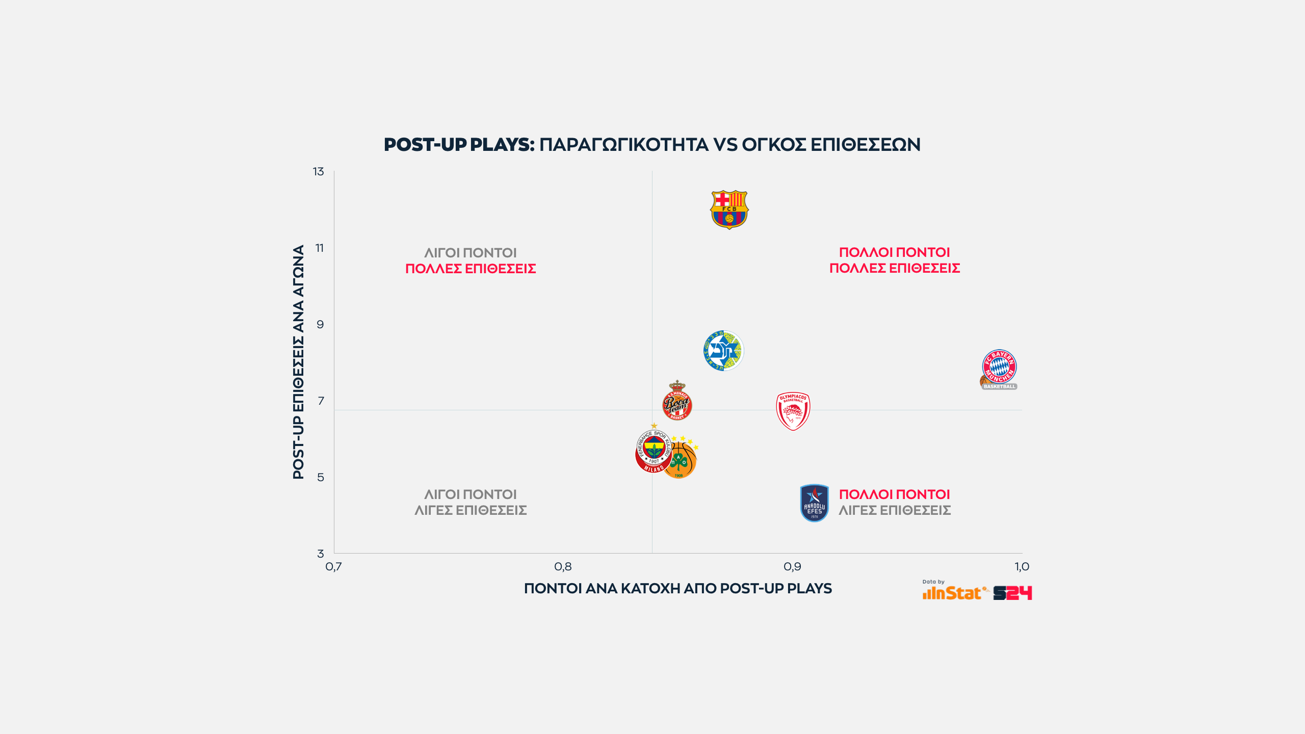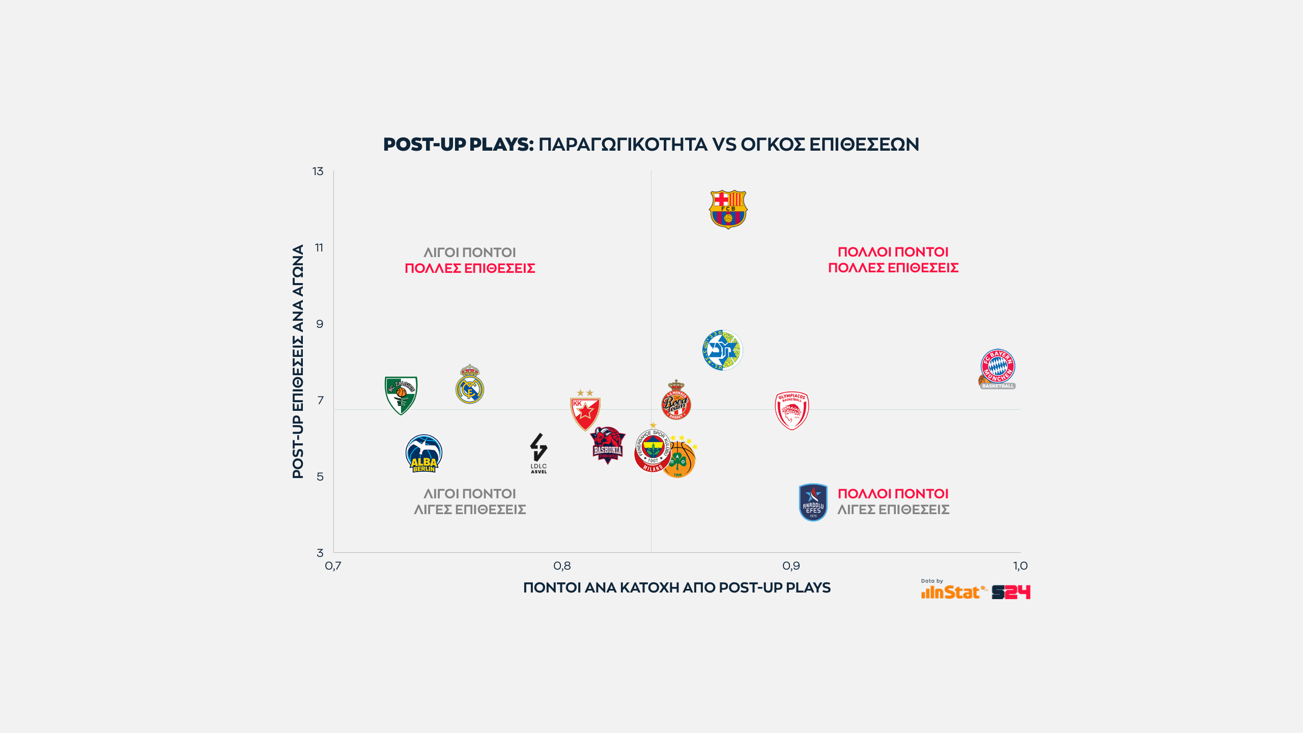 Εδώ όσο πιο ψηλά βρίσκεται μία ομάδα στον ένα άξονα τόσες περισσότερες επιθέσεις εκδηλώσει σε Post Up καταστάσεις. Eνώ όσο πιο δεξιά βρίσκεται, τόσο πιο παραγωγική είναι ανά κατοχή.