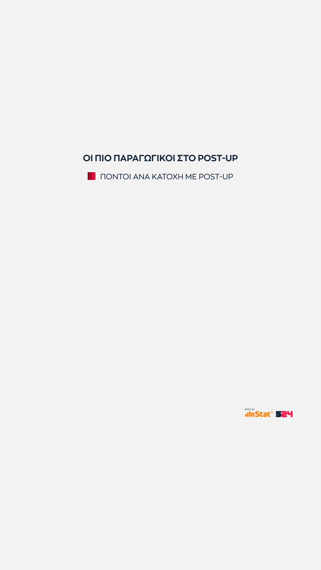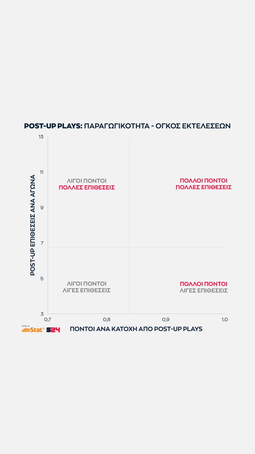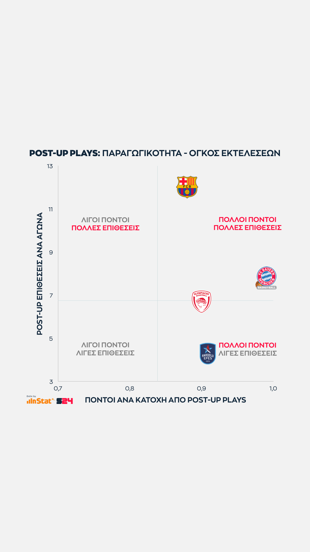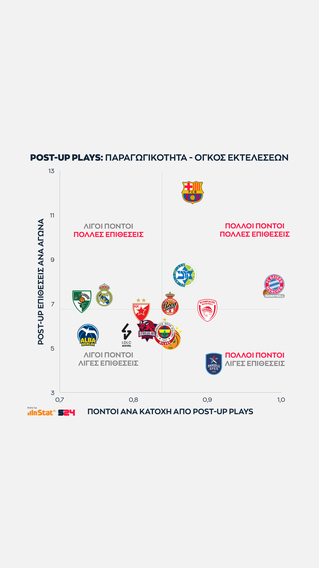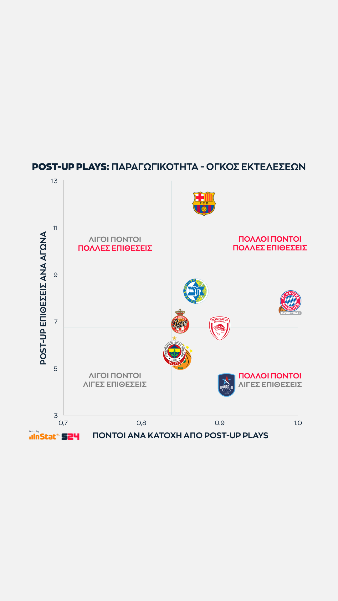 Εδώ όσο πιο ψηλά βρίσκεται μία ομάδα στον ένα άξονα τόσες περισσότερες επιθέσεις εκδηλώσει σε Post Up καταστάσεις. Eνώ όσο πιο δεξιά βρίσκεται, τόσο πιο παραγωγική είναι ανά κατοχή.