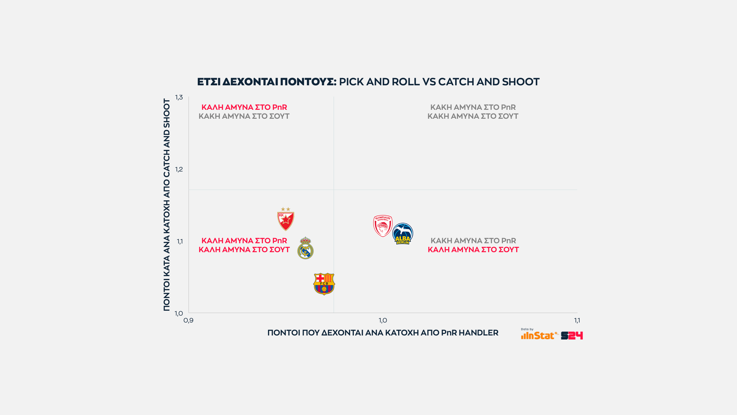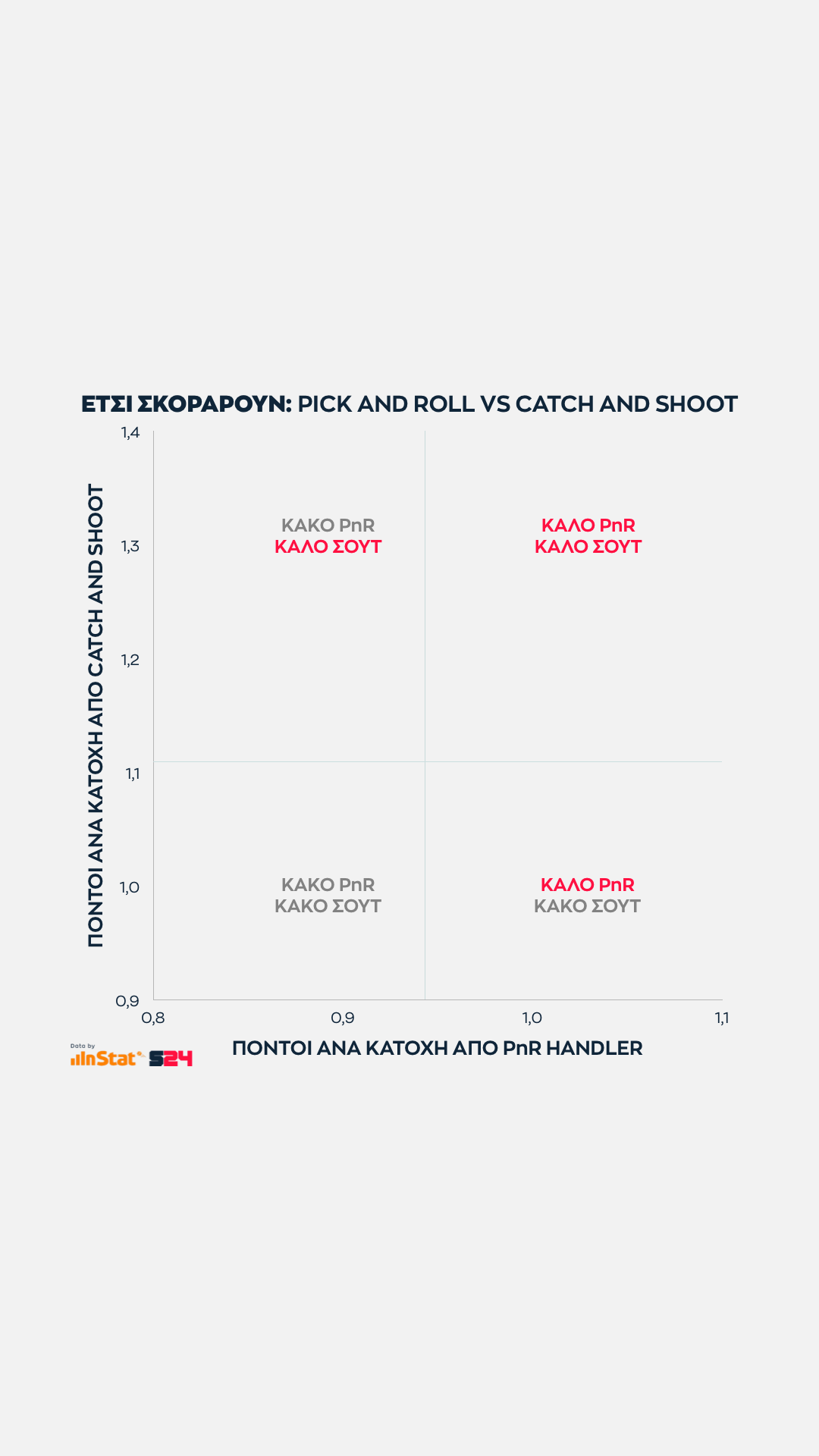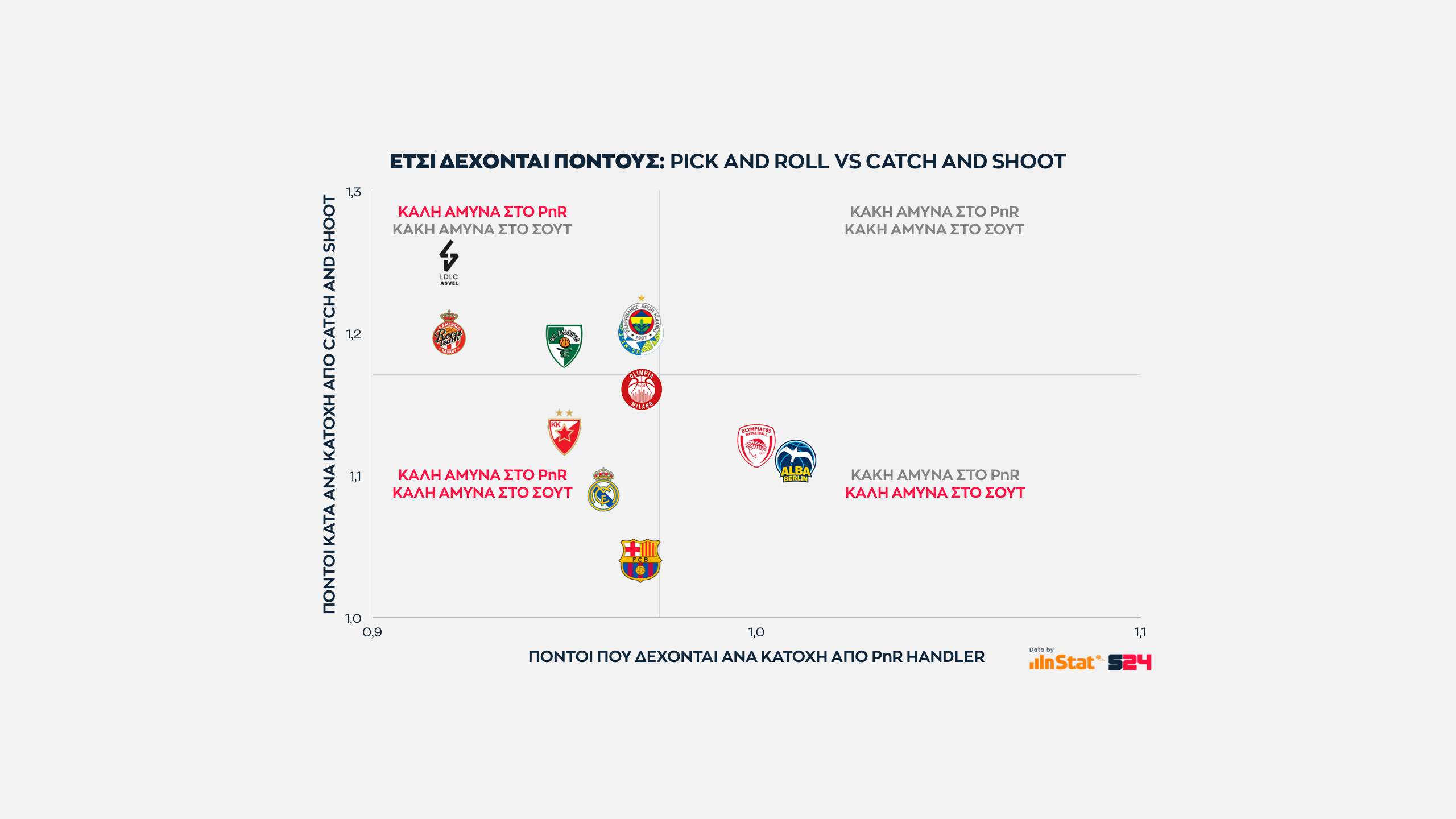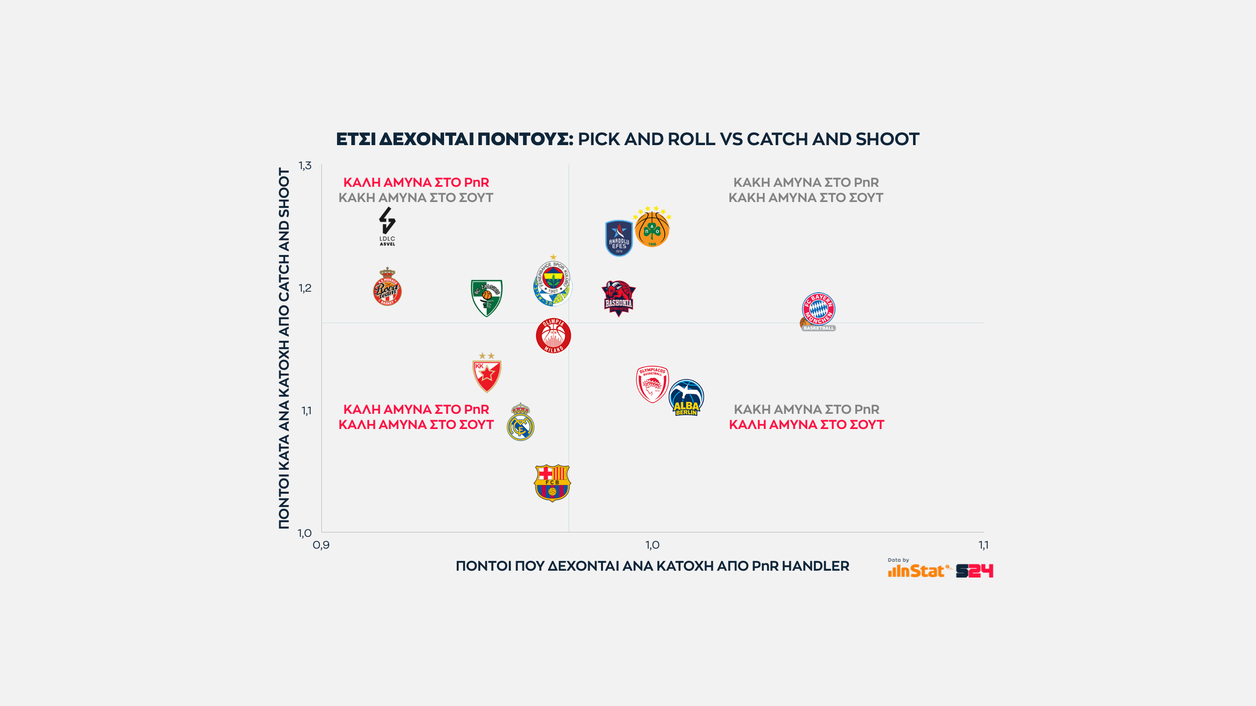 Εδώ όσο πιο ψηλά βρίσκεται μία ομάδα στον ένα άξονα τόσες περισσότερες επιθέσεις εκδηλώσει σε Post Up καταστάσεις. Eνώ όσο πιο δεξιά βρίσκεται, τόσο πιο παραγωγική είναι ανά κατοχή.