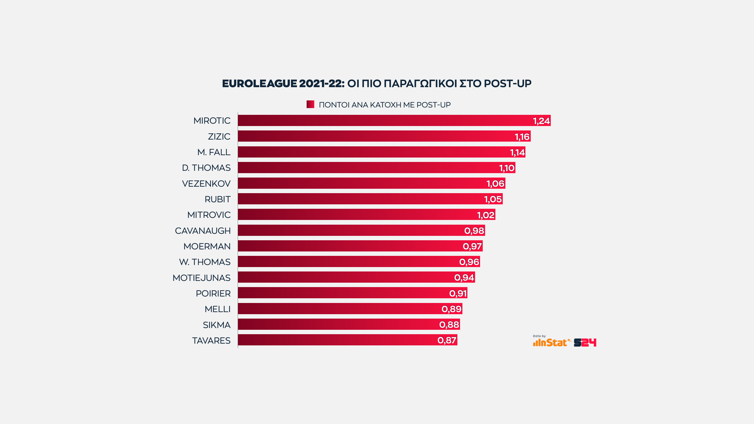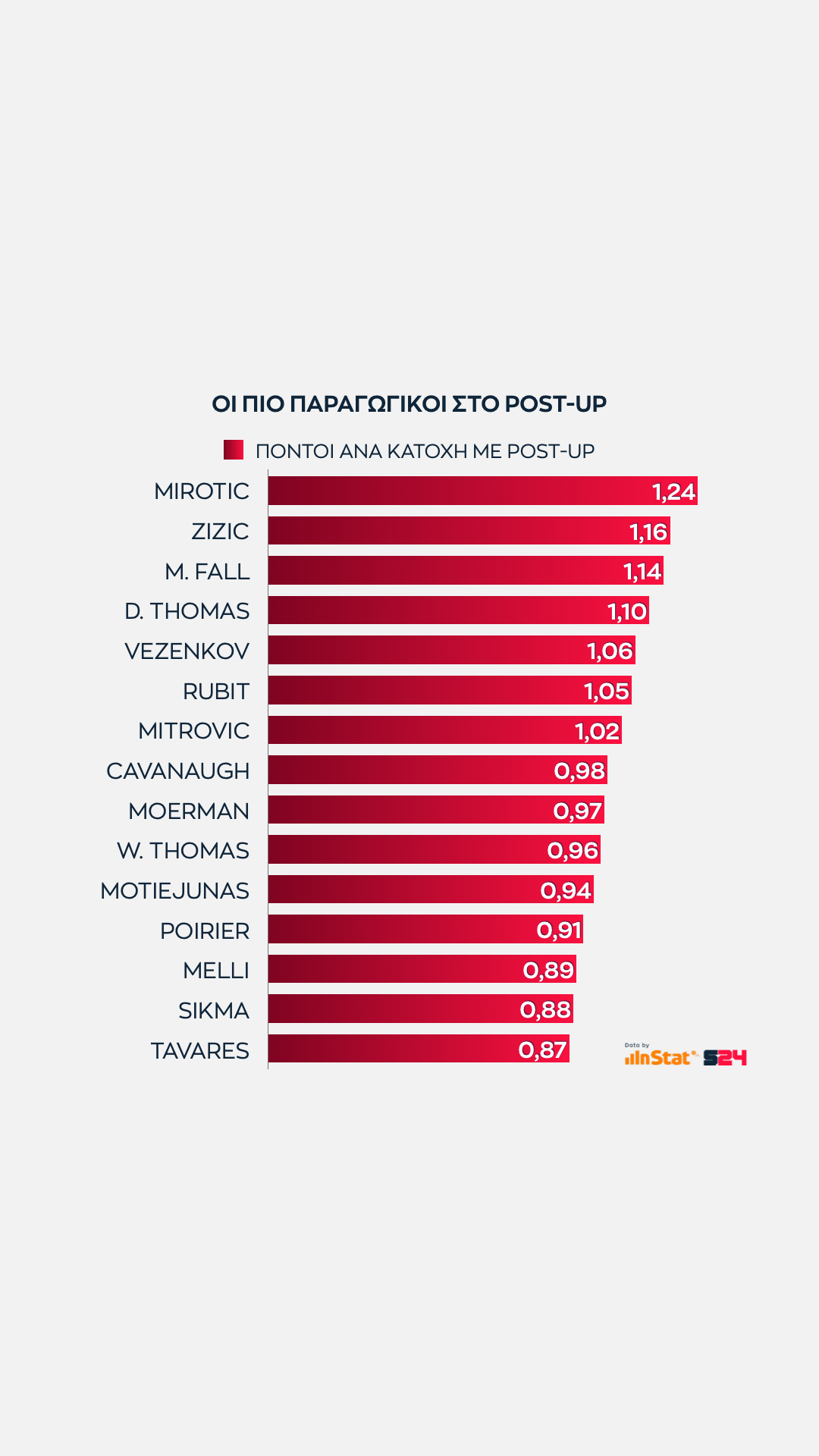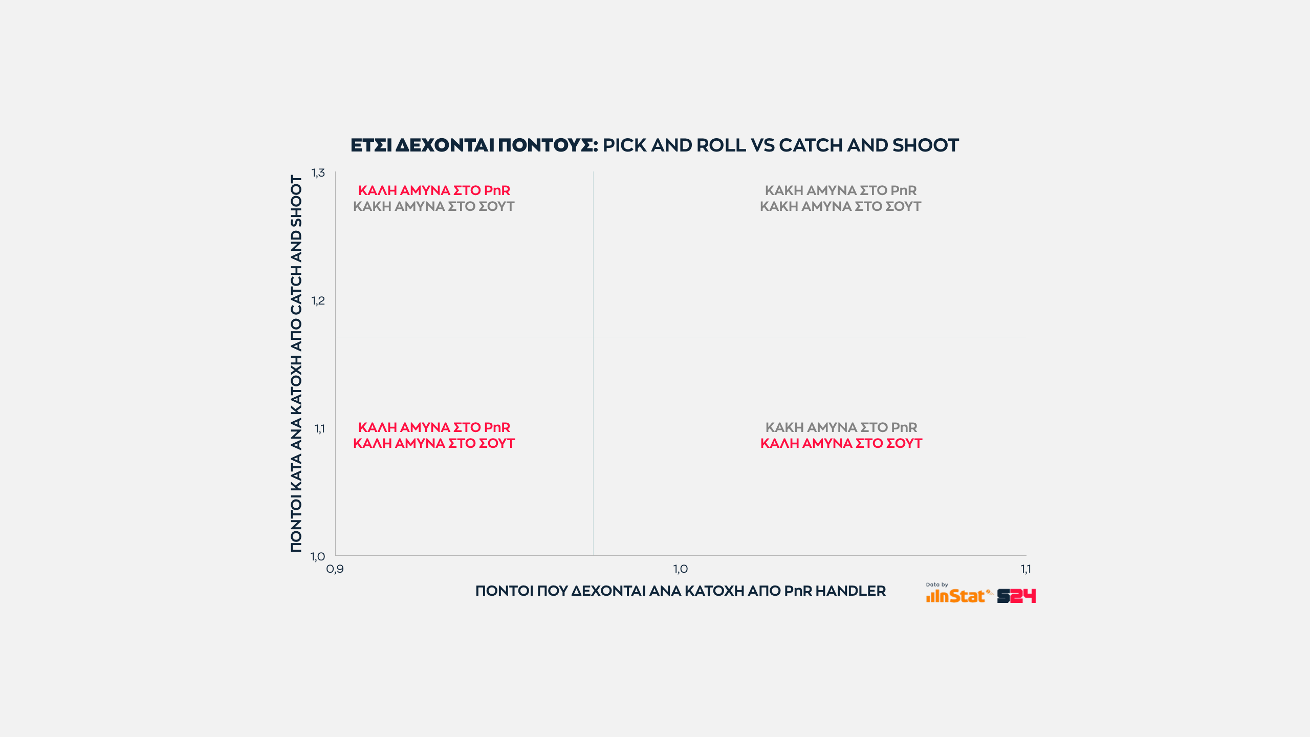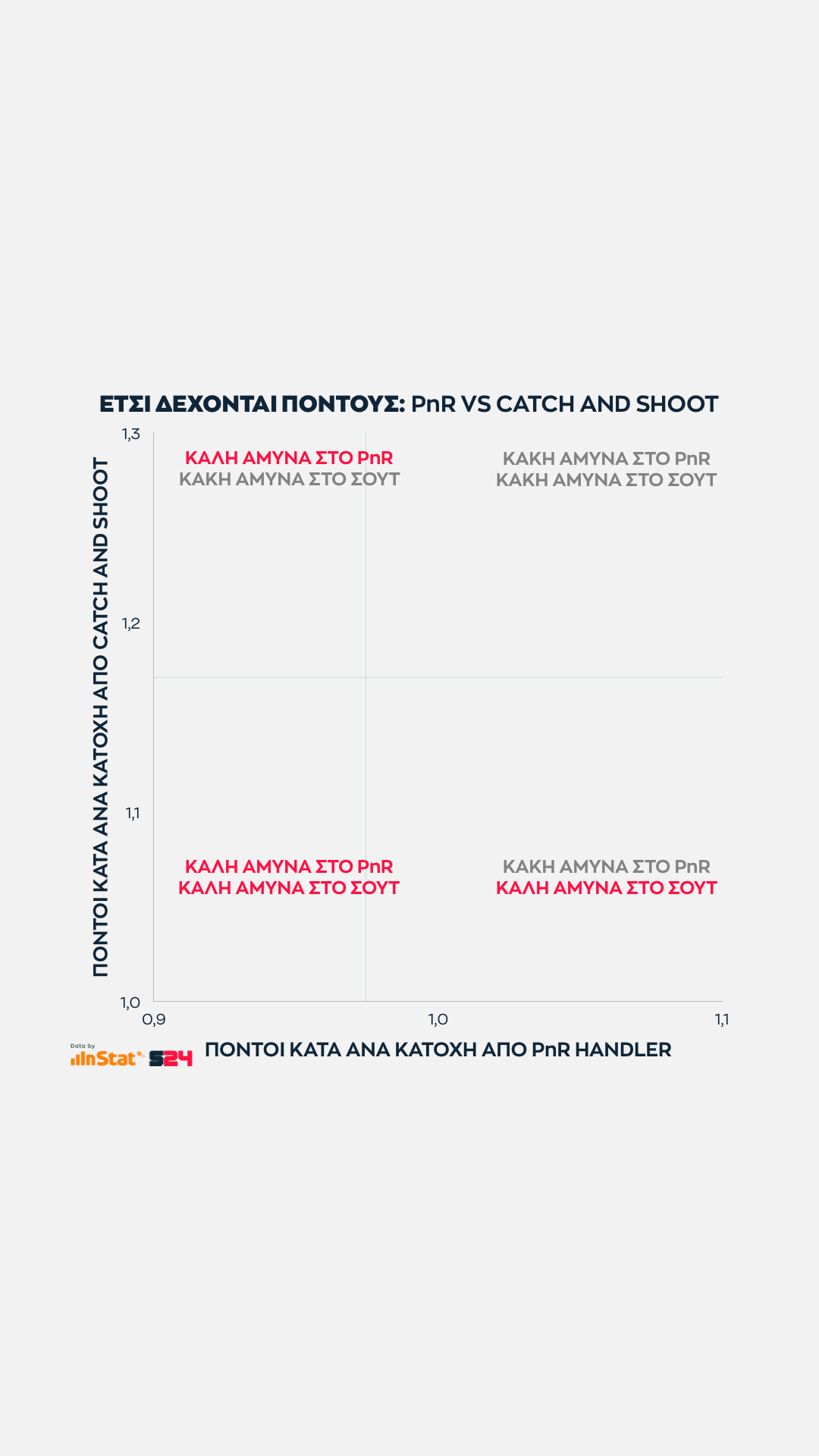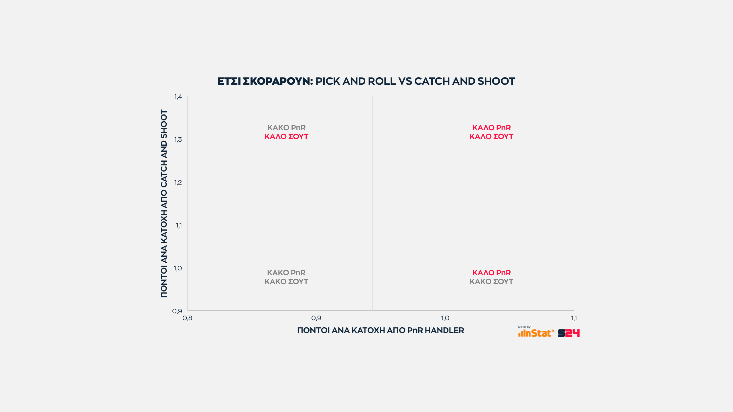Εδώ όσο πιο ψηλά βρίσκεται μία ομάδα στον ένα άξονα τόσες περισσότερες επιθέσεις εκδηλώσει σε Post Up καταστάσεις. Eνώ όσο πιο δεξιά βρίσκεται, τόσο πιο παραγωγική είναι ανά κατοχή.