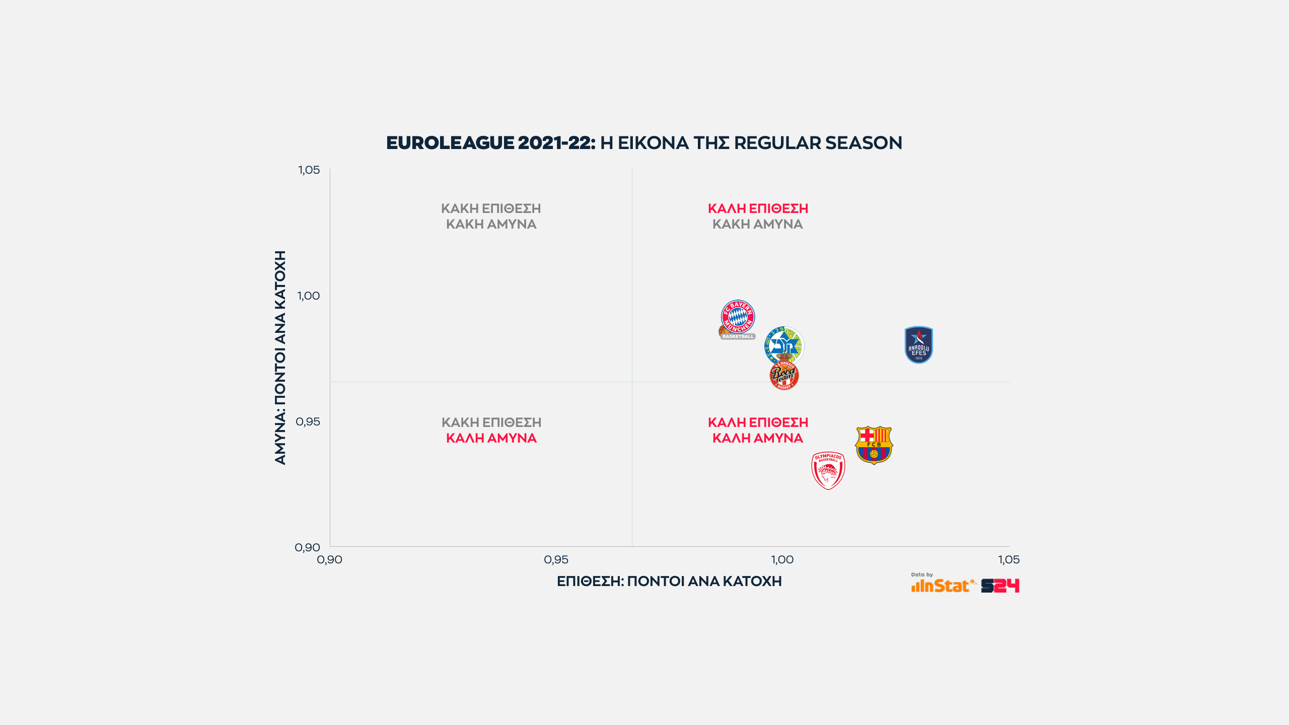 Άλλες ομάδες, βέβαια, είχαν ήδη ξεχωρίσει και όχι μόνο βαθμολογικά. Διότι η αποτίμηση της κανονικής περιόδου, που ολοκληρώθηκε με καθυστέρηση έξι ημερών, δεν αφορά τις νίκες, τα ποσοστά στα σουτ, ριμπάουντ και ασίστ. Συμβατικούς αριθμούς που εντοπίζονται γρήγορα και εύκολα.
