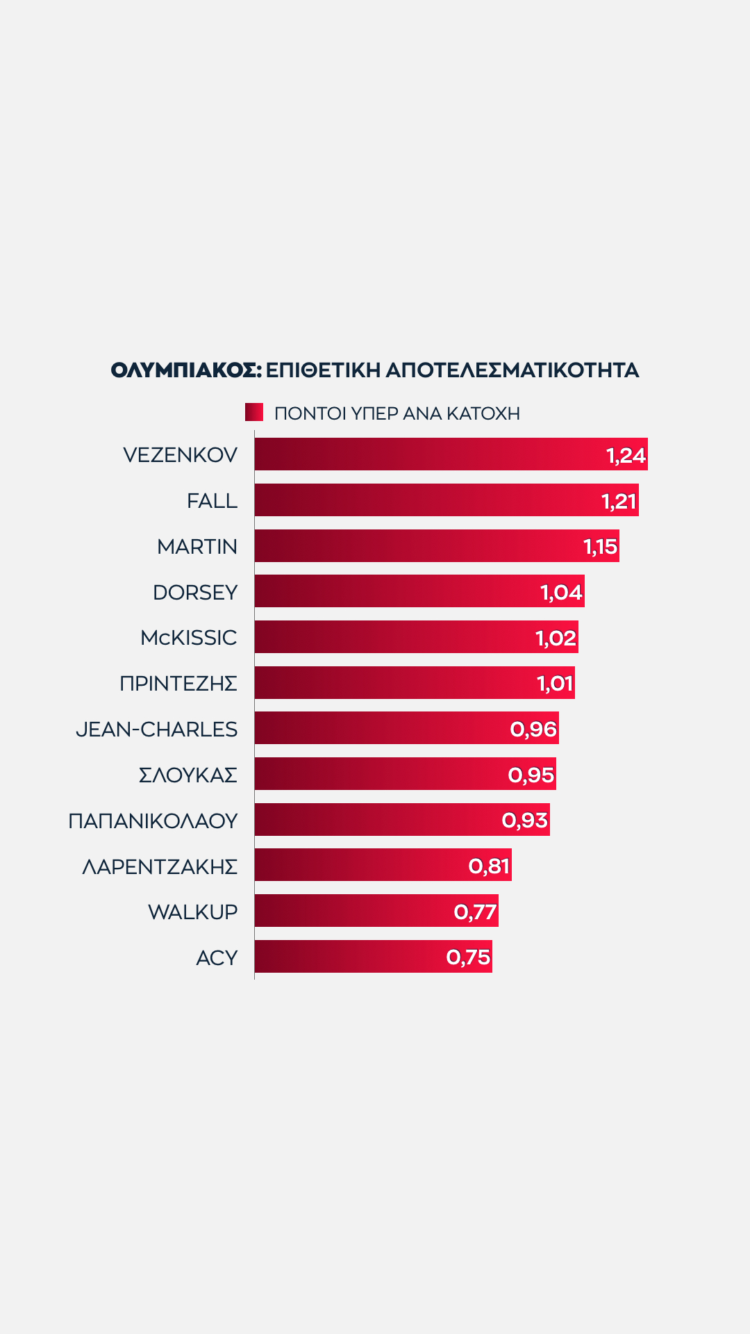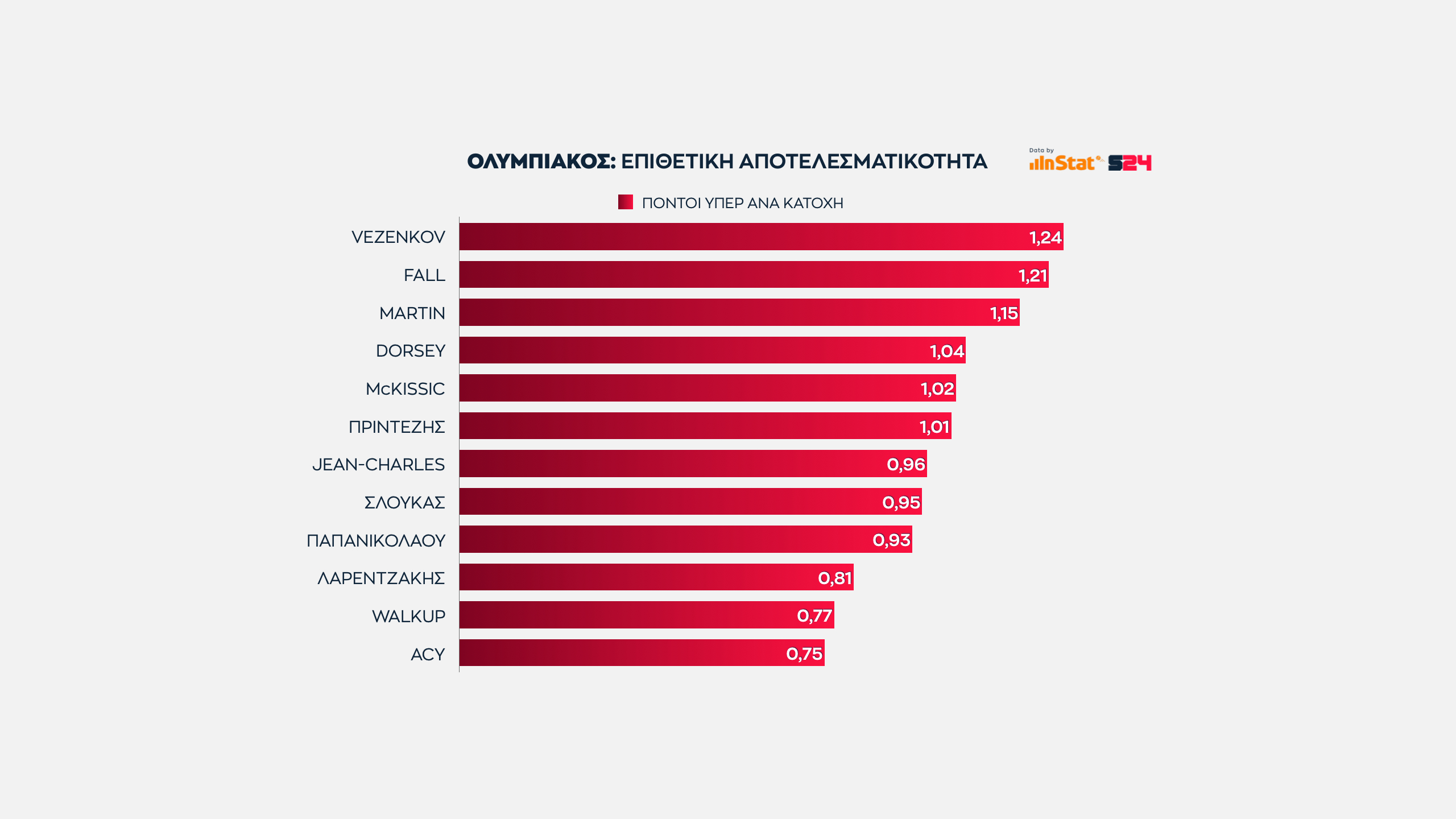 Ο Βεζένκοβ ήταν όλη τη σεζόν ο πιο σταθερός παίκτης του Ολυμπιακού. Οι αριθμοί το επαληθεύουν με την καλύτερη αναλογία πόντων ανά κατοχή.