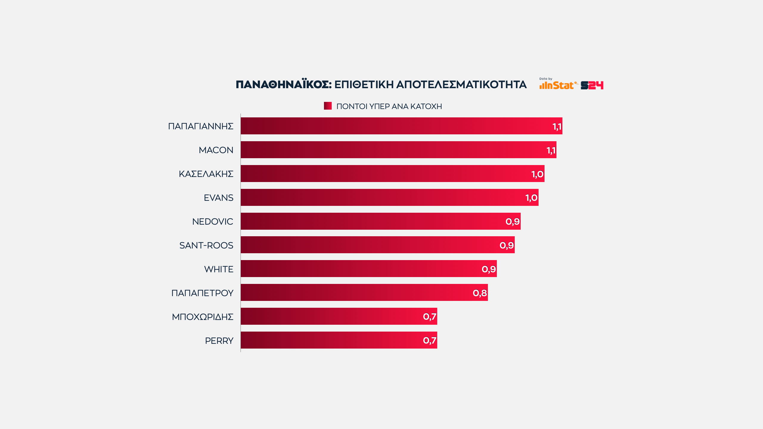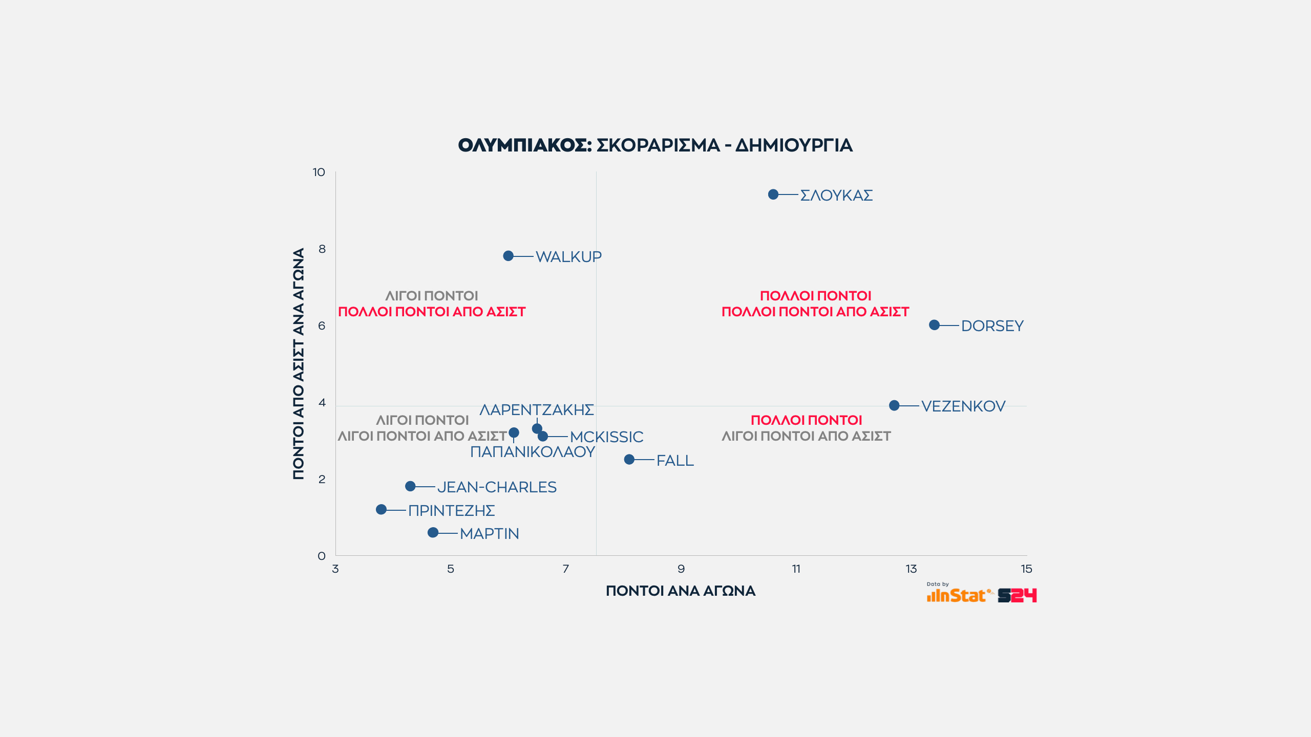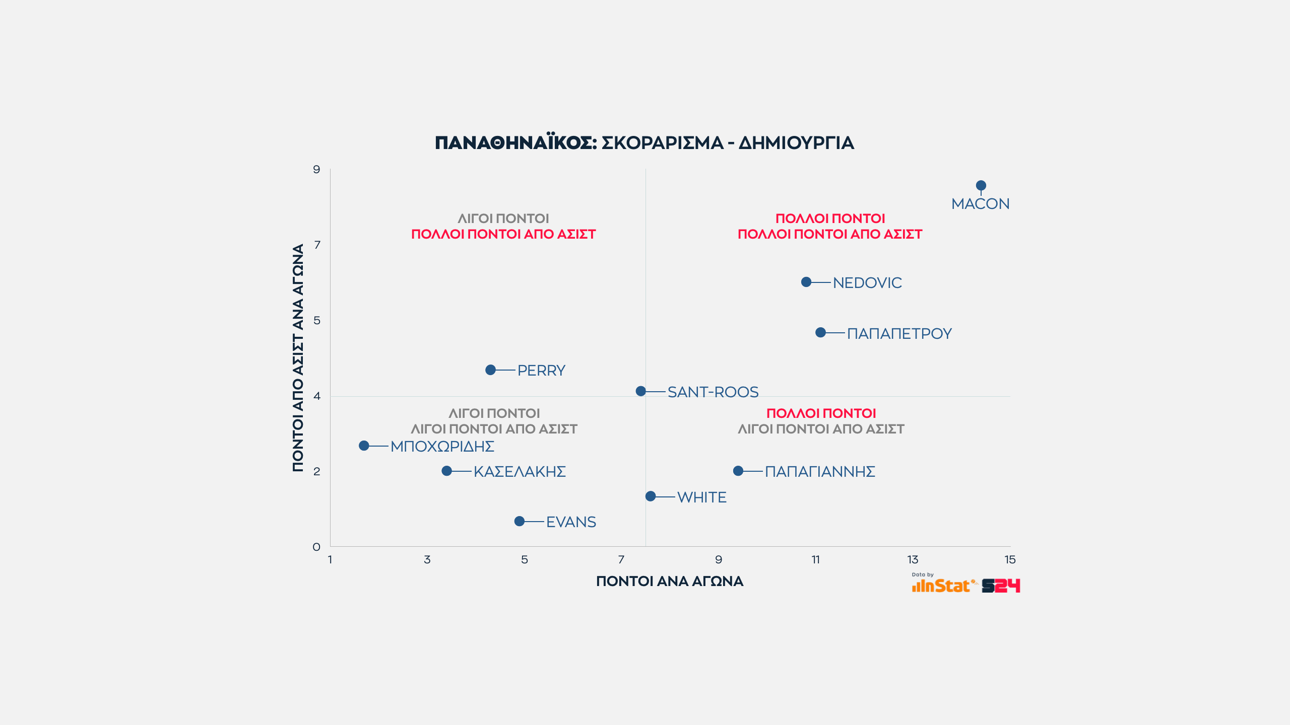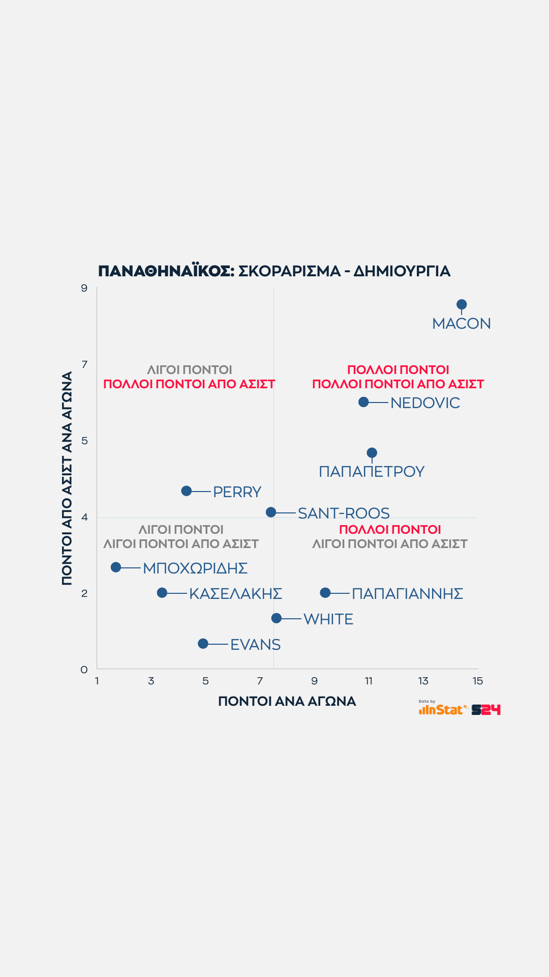 Άλλος δεν αγγίζει αυτό τος ύψος, με τους Νέντοβιτς και Παπαπέτρου πάντως ν' ανήκουν στο ίδιο γκρουπ. Ο Σέρβος ξεπερνά οριακά τους 17 όταν συνδυάζονται οι πόντοι που σημειώνει με τους πόντους που προσφέρει στους συμπαίκτες του ως ο δεύτερος πιο αξιόπιστος πόλος δημιουργίας.