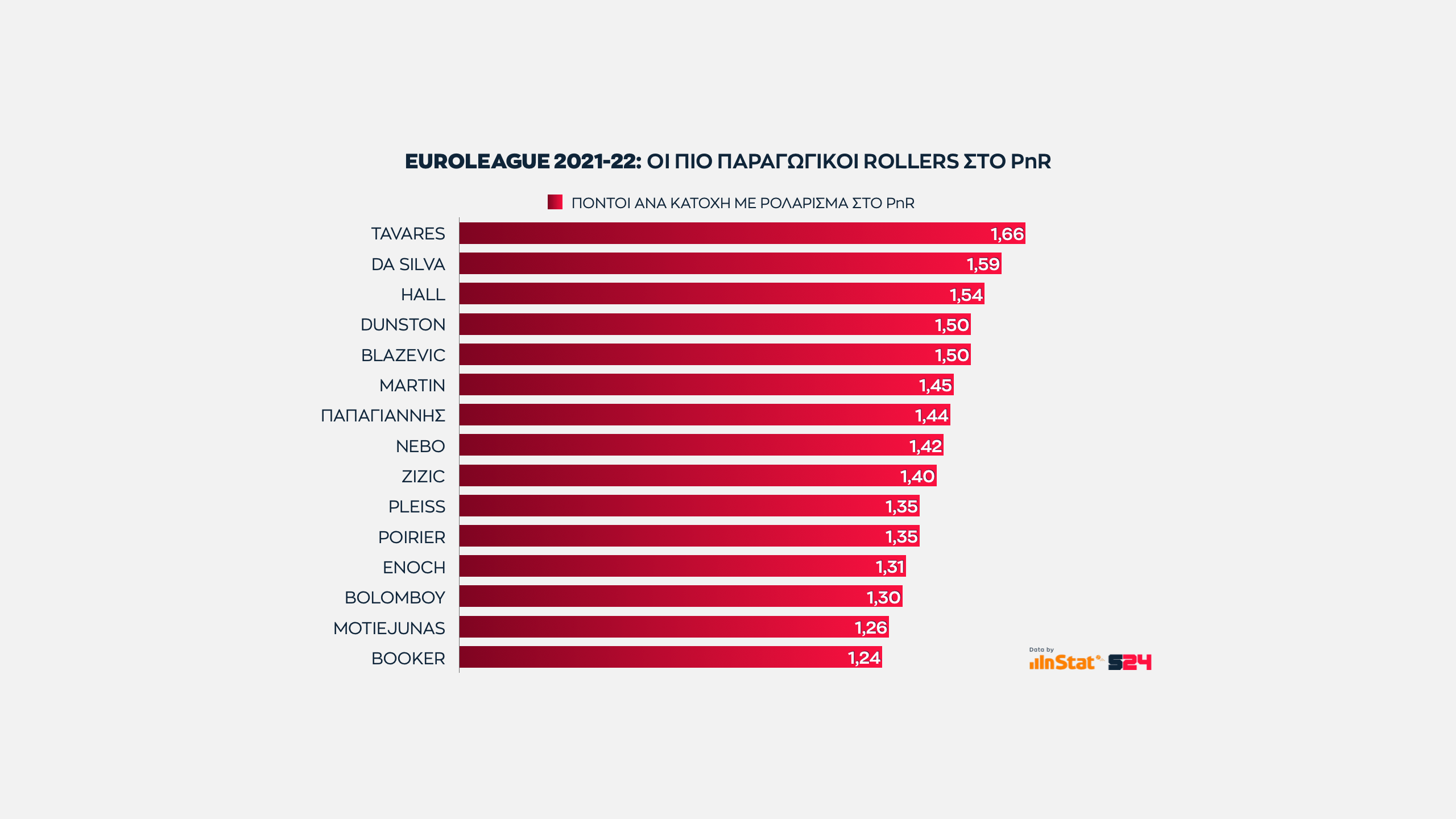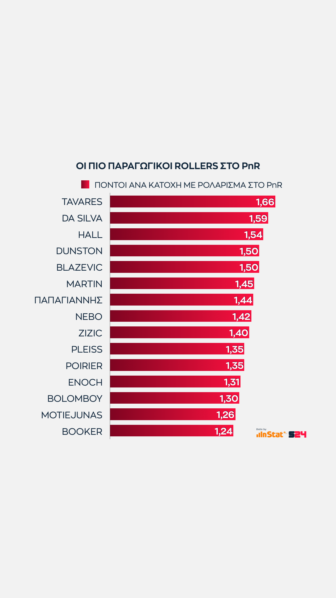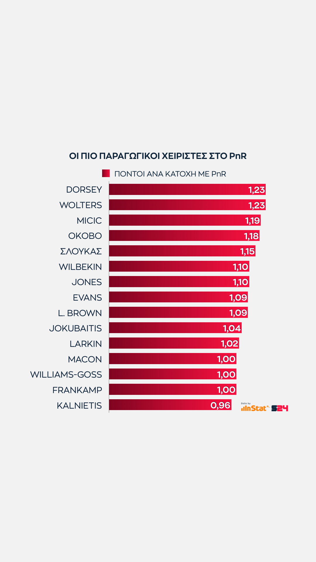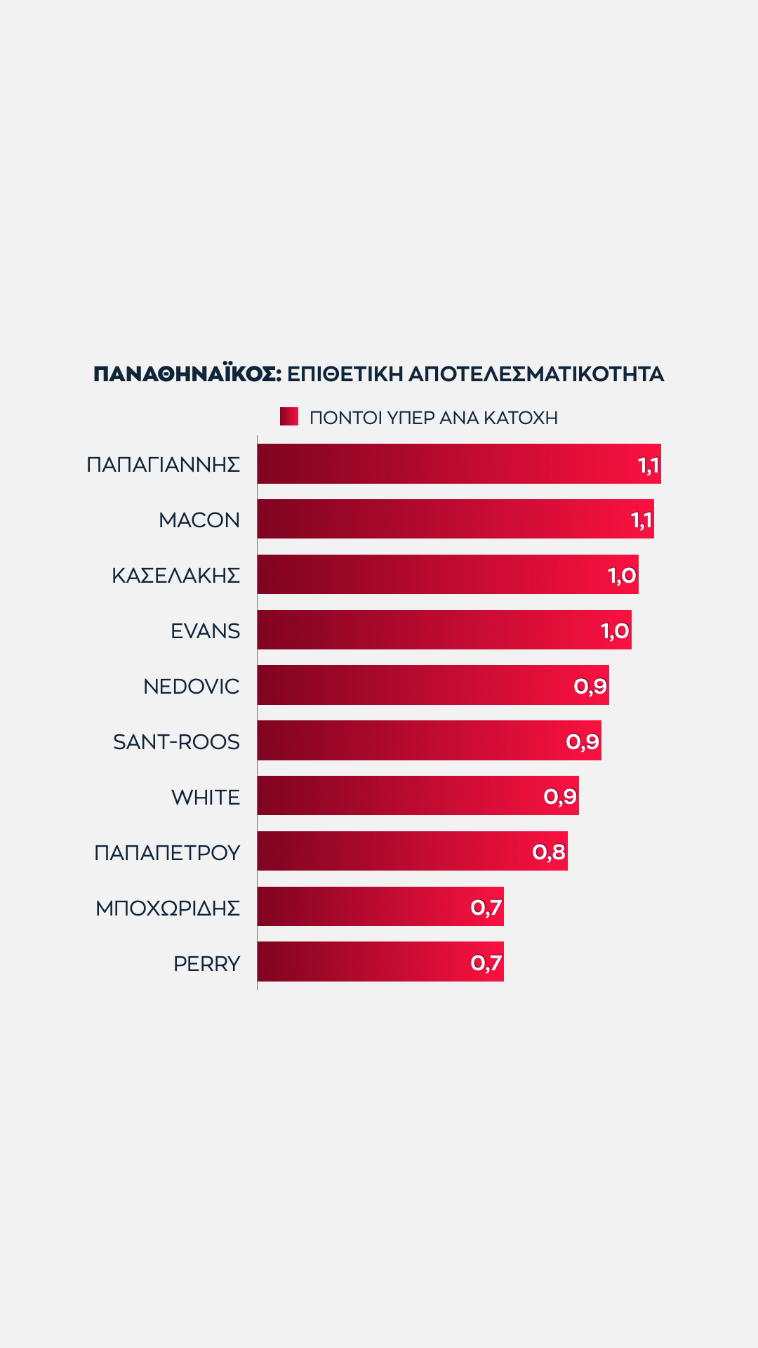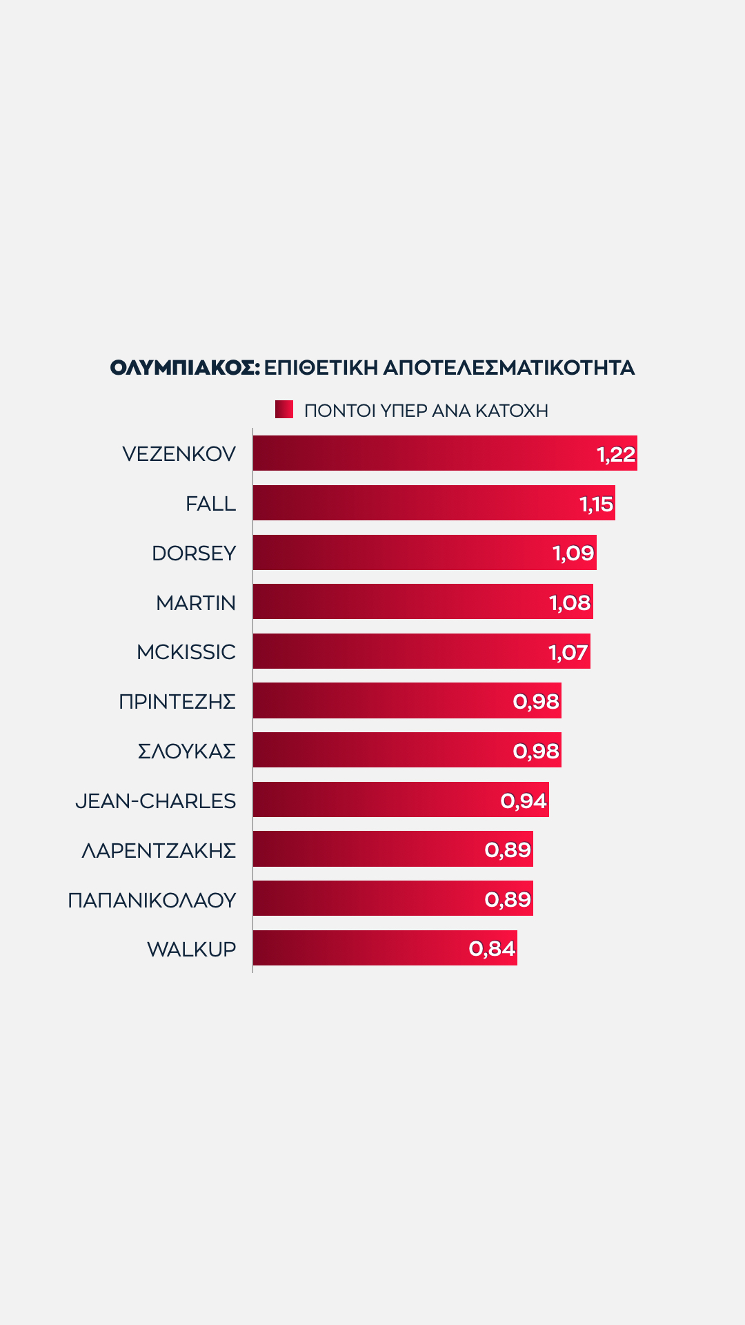 Άλλος δεν αγγίζει αυτό τος ύψος, με τους Νέντοβιτς και Παπαπέτρου πάντως ν' ανήκουν στο ίδιο γκρουπ. Ο Σέρβος ξεπερνά οριακά τους 17 όταν συνδυάζονται οι πόντοι που σημειώνει με τους πόντους που προσφέρει στους συμπαίκτες του ως ο δεύτερος πιο αξιόπιστος πόλος δημιουργίας.