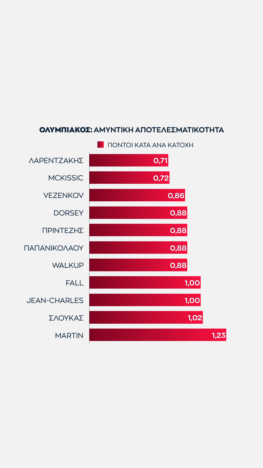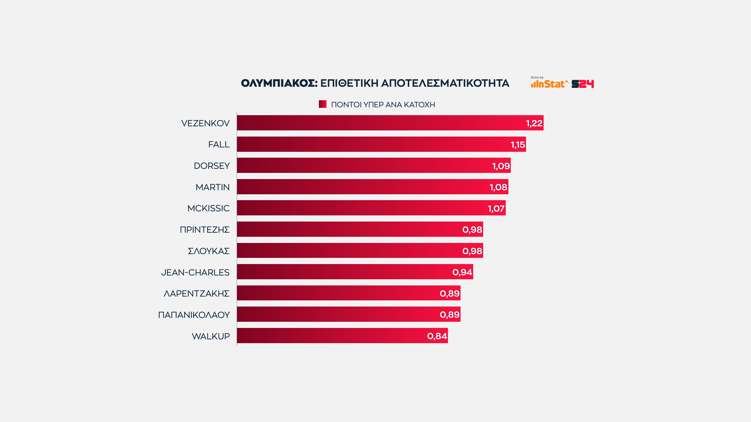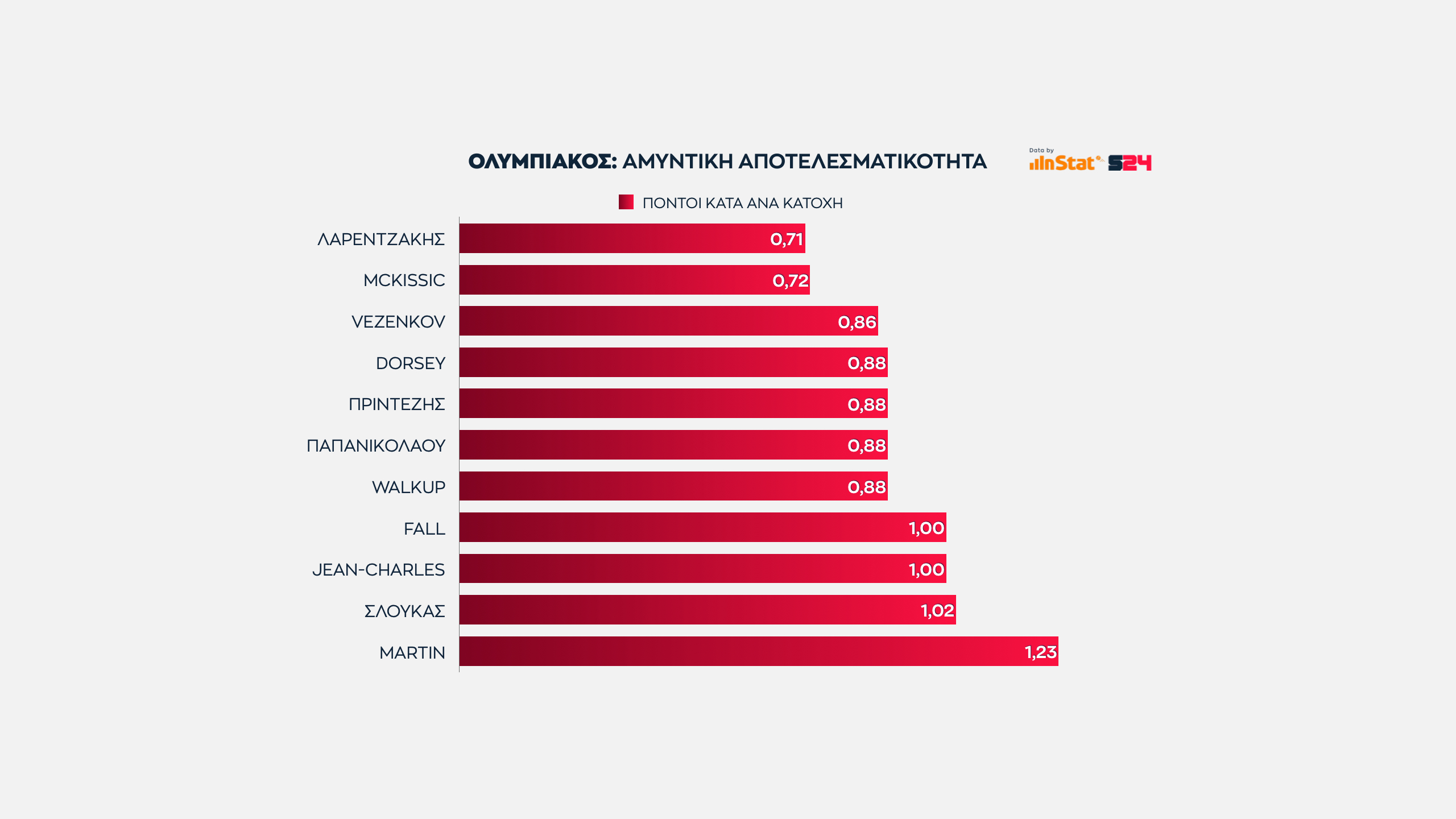 Ο Μουστάφα Φαλ δίνει 0.95 πόντους ανά κατοχή στον Ολυμπιακό, σ' ένα καλό νούμερο. Το γεγονός πως βρίσκεται στο ίδιο επίπεδο με τον Βέσελι και πάνω από τον Σενγκέλια δείχνει πολλά.