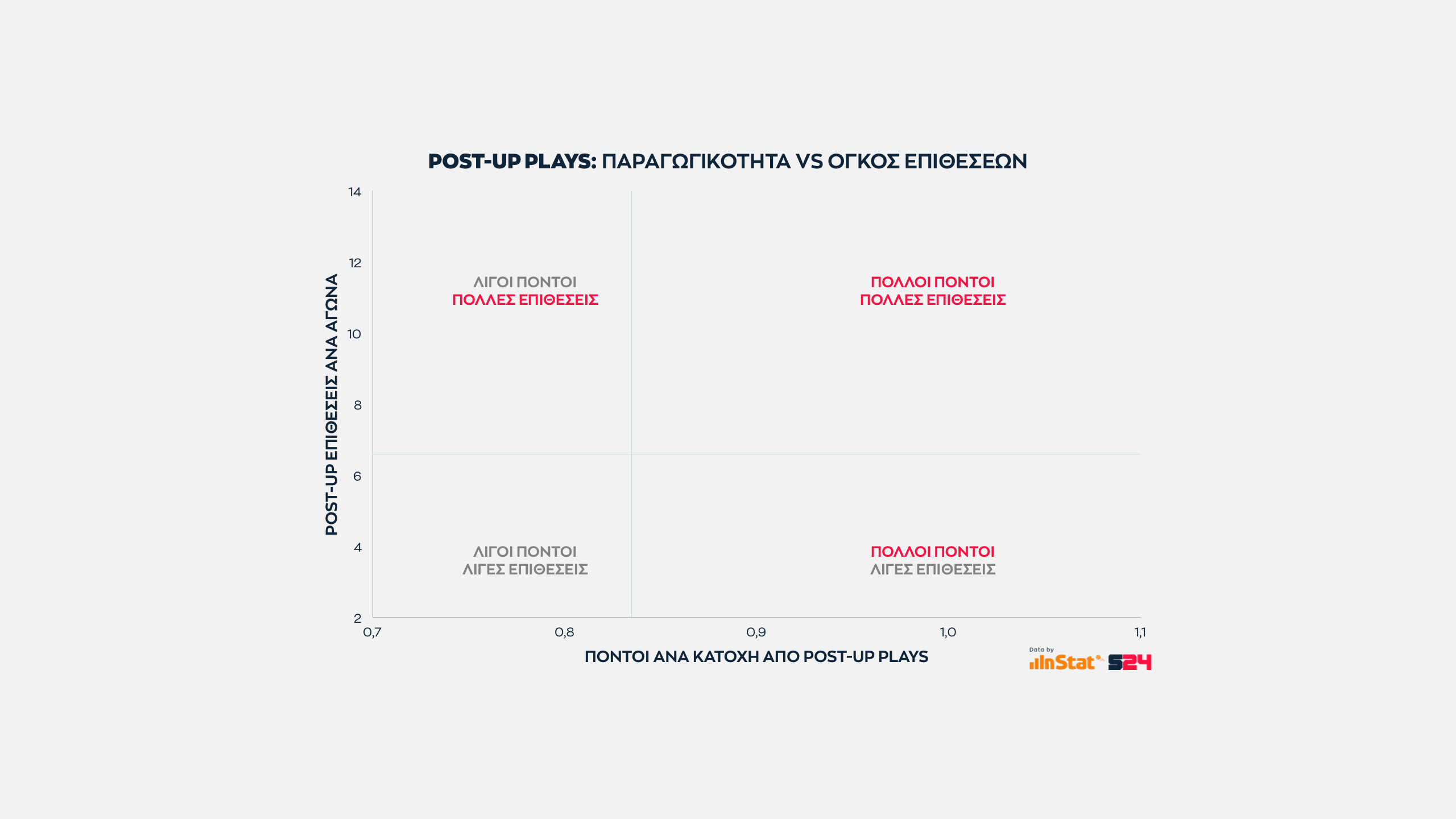 Όσο πιο δεξιά και ταυτόχρονα χαμηλά κινείται μια ομάδα τόσο καλύτερη είναι η γενική συμπεριφορά της στο παρκέ. Βγάζει ισορροπία σε ανώτατο επίπεδο, στοιχείο που ζητούν οι προπονητές. Δεξιά, γιατί παράγει περισσότερους πόντους και χαμηλά γιατί δέχεται λιγότερους.