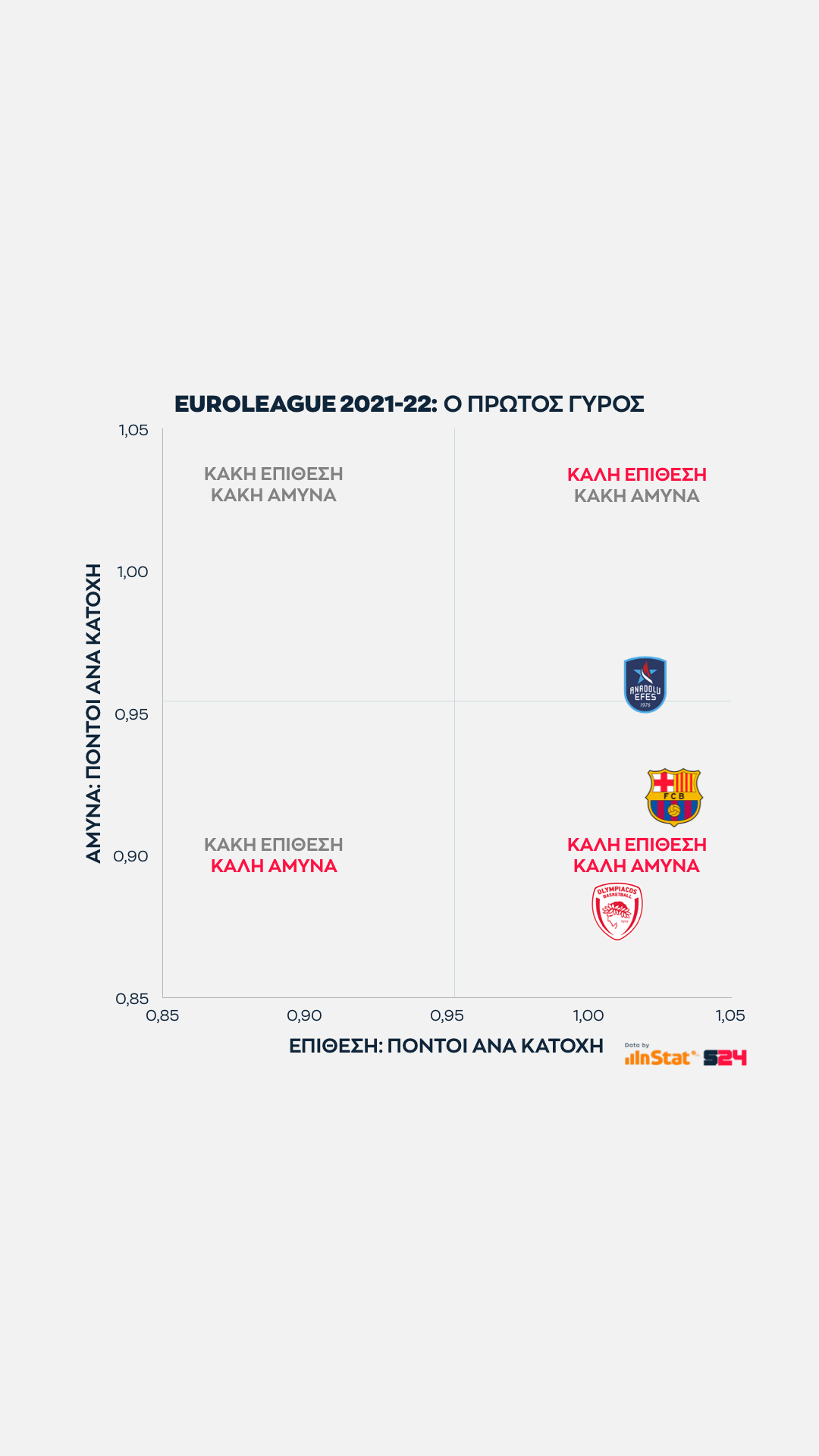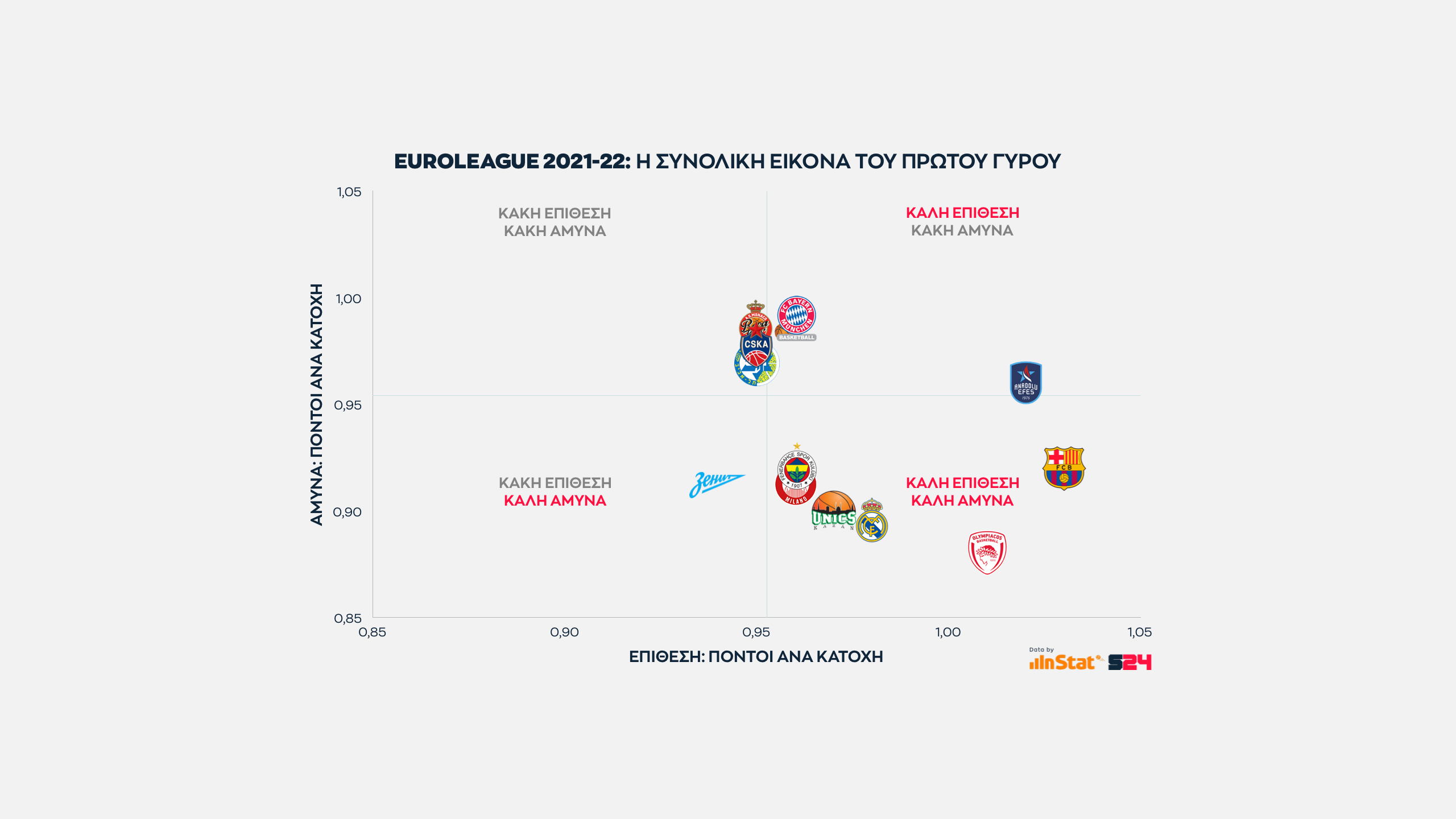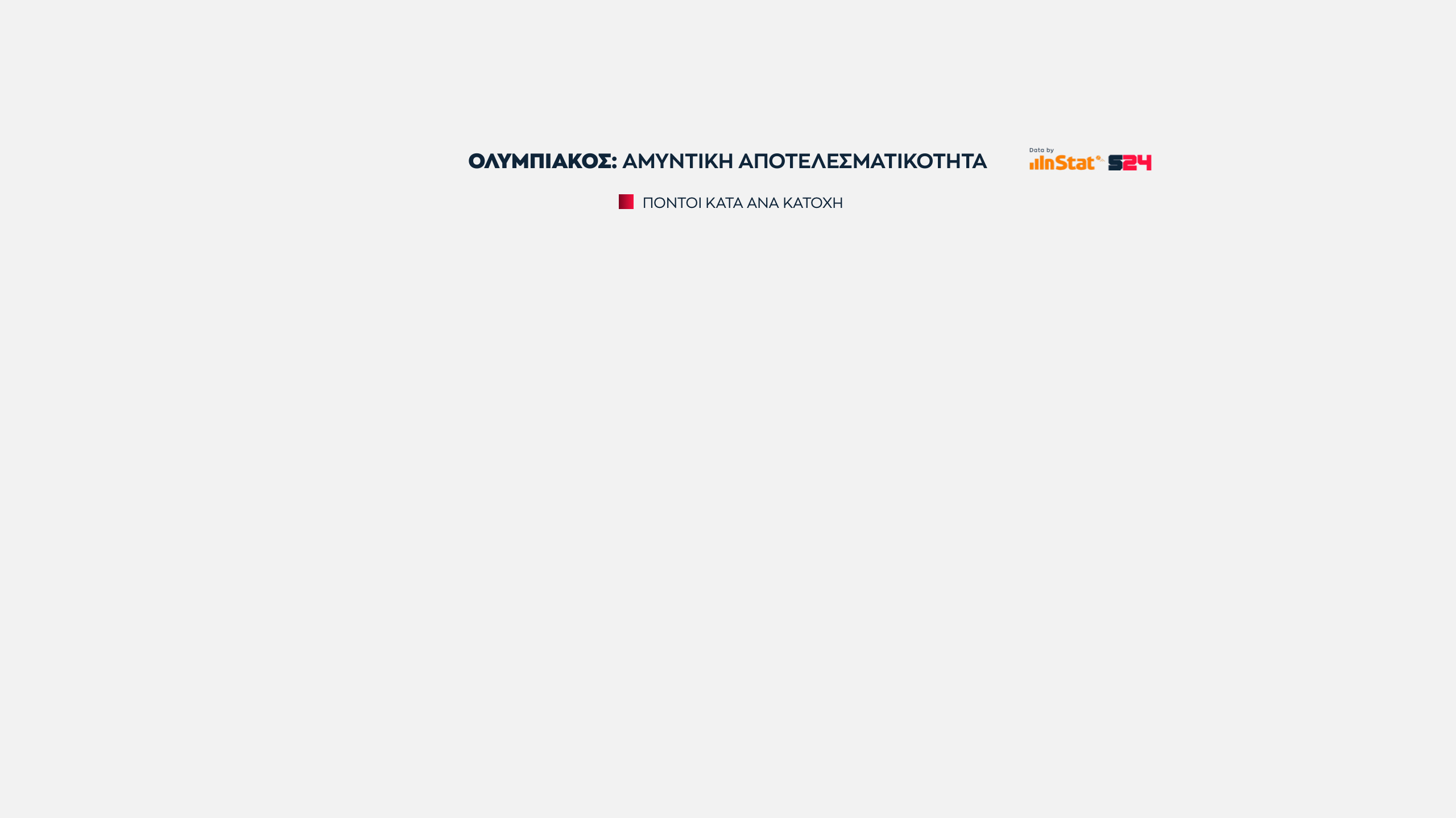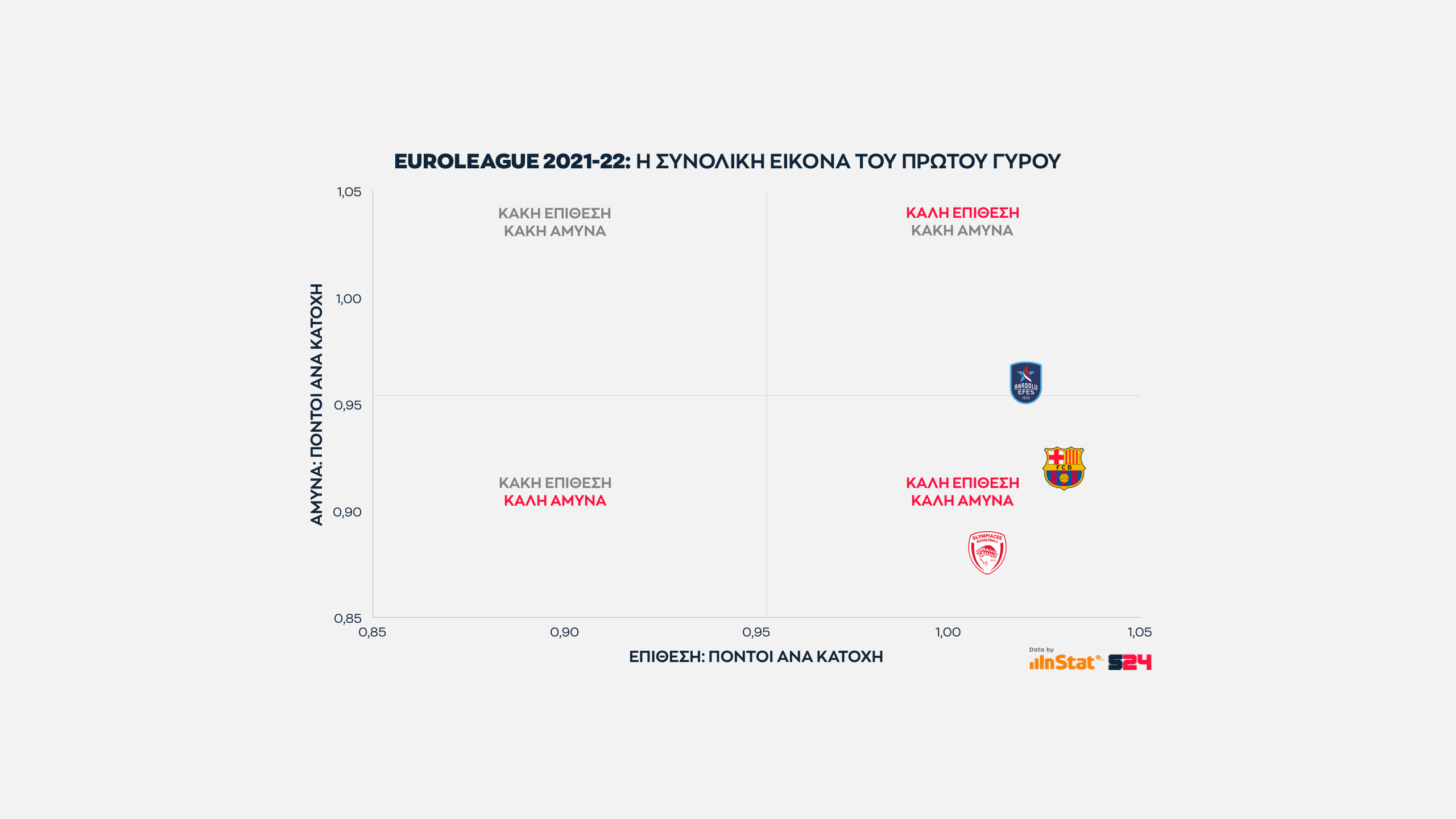 Η ομάδα που προσεγγίζει τις επιδόσεις της Μπαρτσελόνα είναι ο Ολυμπιακός, αφού είναι η τρίτη (και τελευταία) ομάδα που σημειώνει πάνω από 1 πόντο ανά κατοχή στην επίθεση, ενώ παράλληλα εμφανίζει την κορυφαία αμυντική επίδοσή σε πόντους που δέχεται ανά κατοχή.