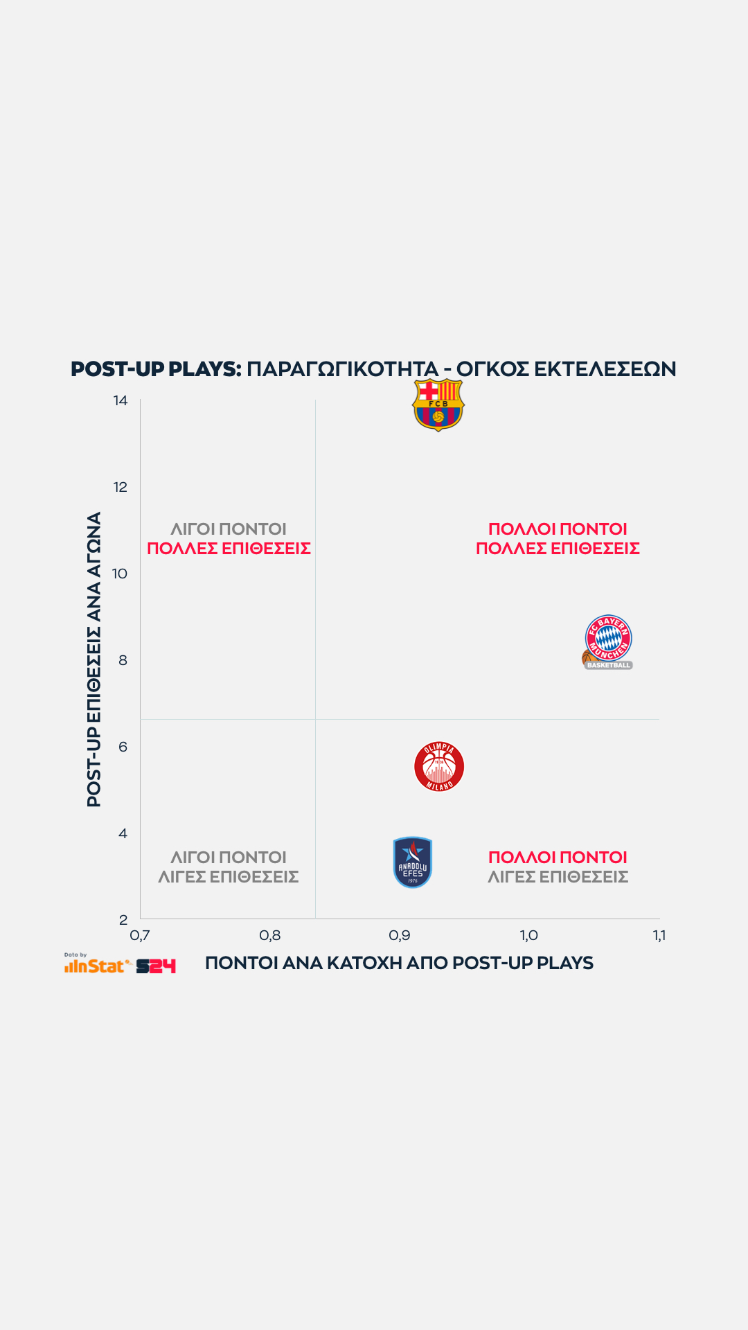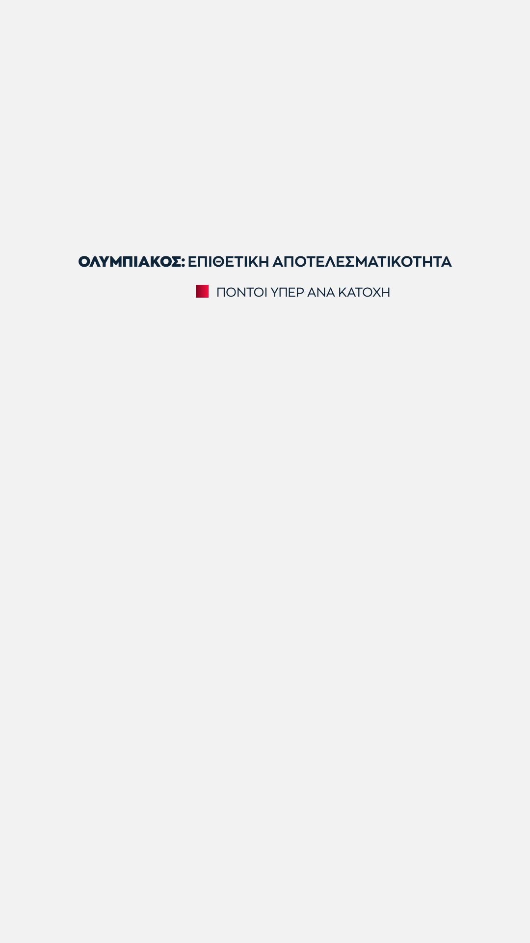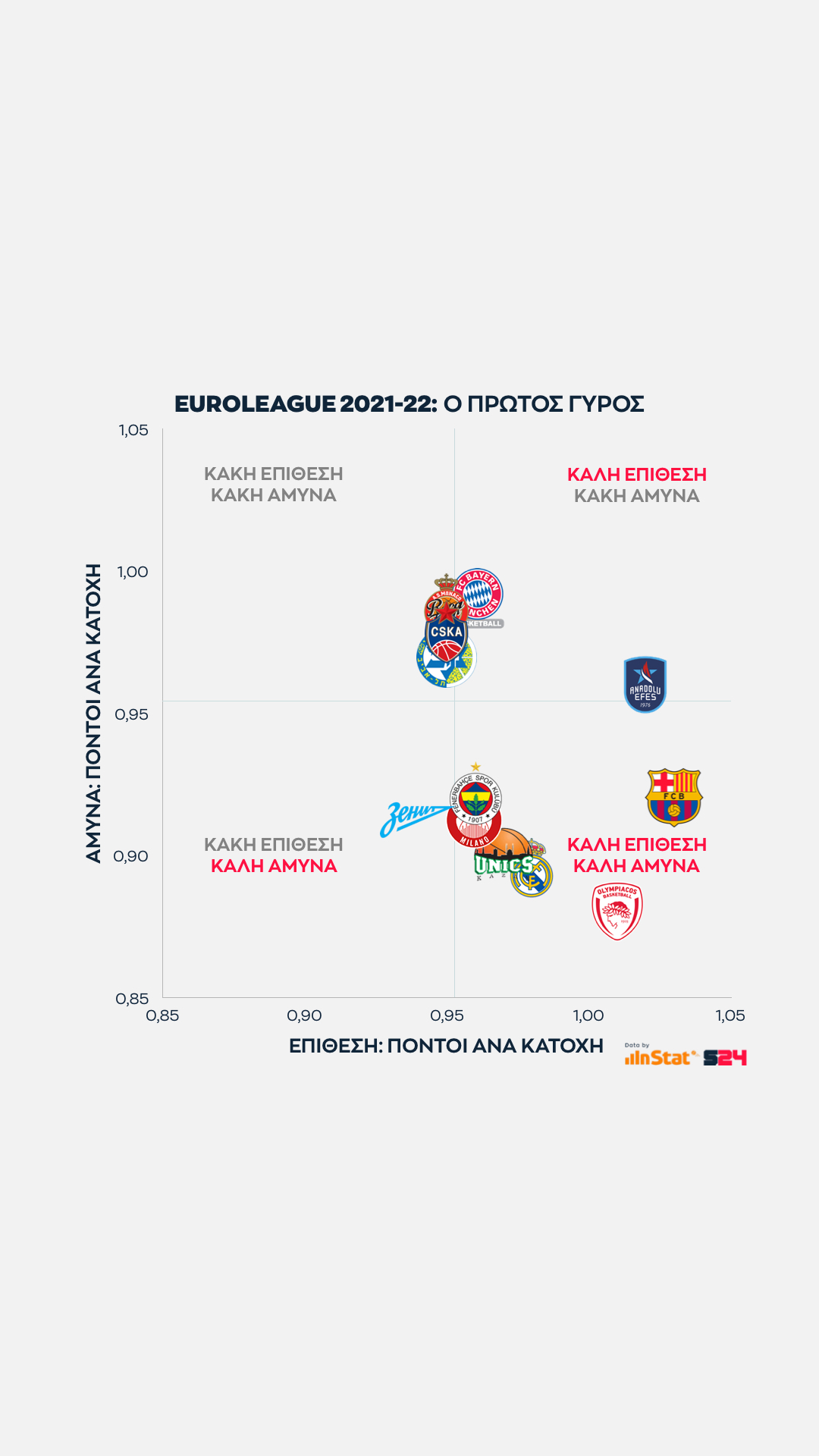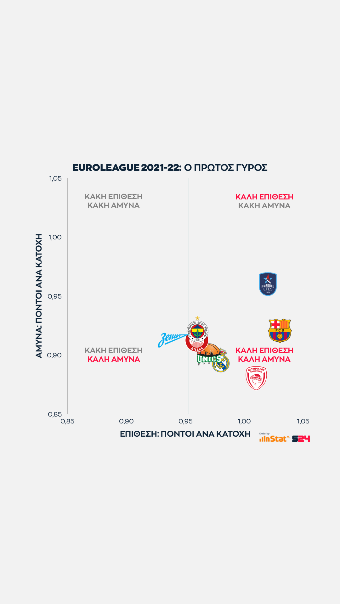 Η ομάδα που προσεγγίζει τις επιδόσεις της Μπαρτσελόνα είναι ο Ολυμπιακός, αφού είναι η τρίτη (και τελευταία) ομάδα που σημειώνει πάνω από 1 πόντο ανά κατοχή στην επίθεση, ενώ παράλληλα εμφανίζει την κορυφαία αμυντική επίδοσή σε πόντους που δέχεται ανά κατοχή.