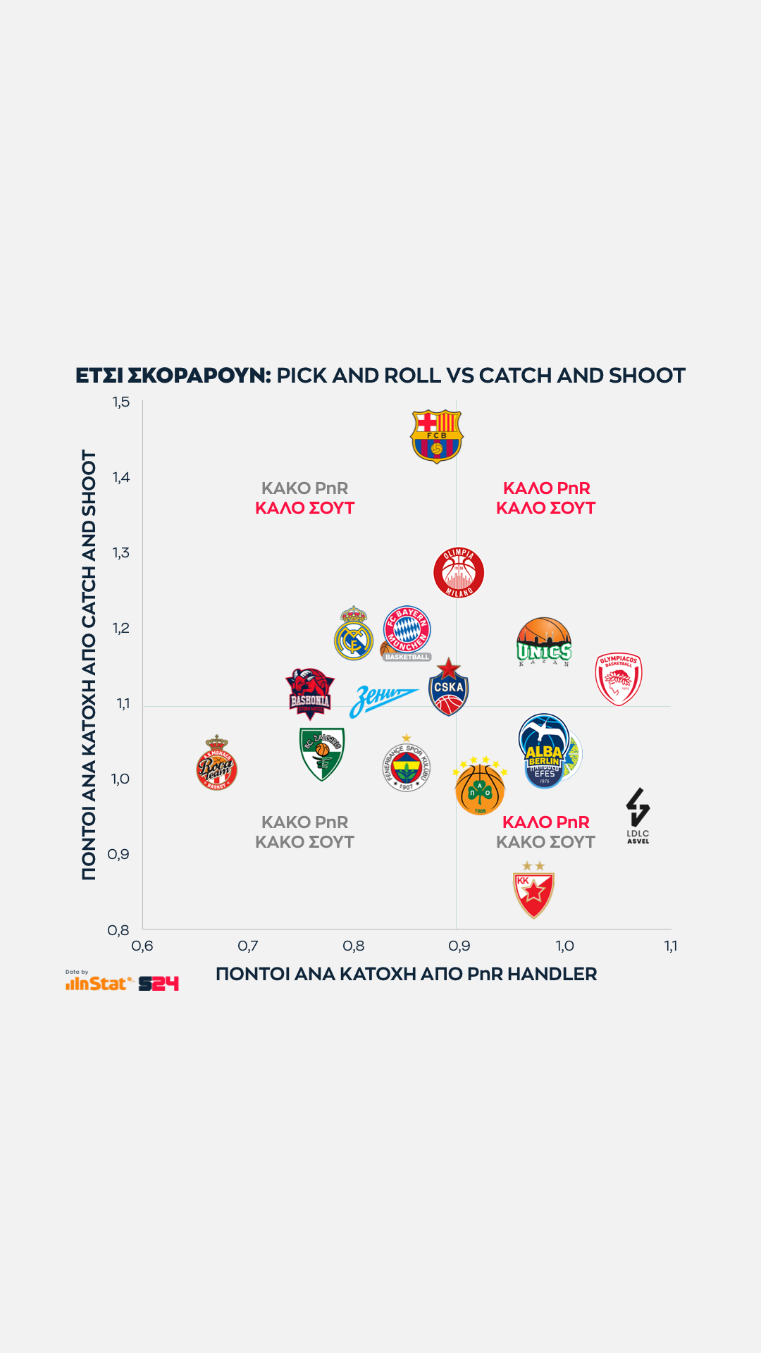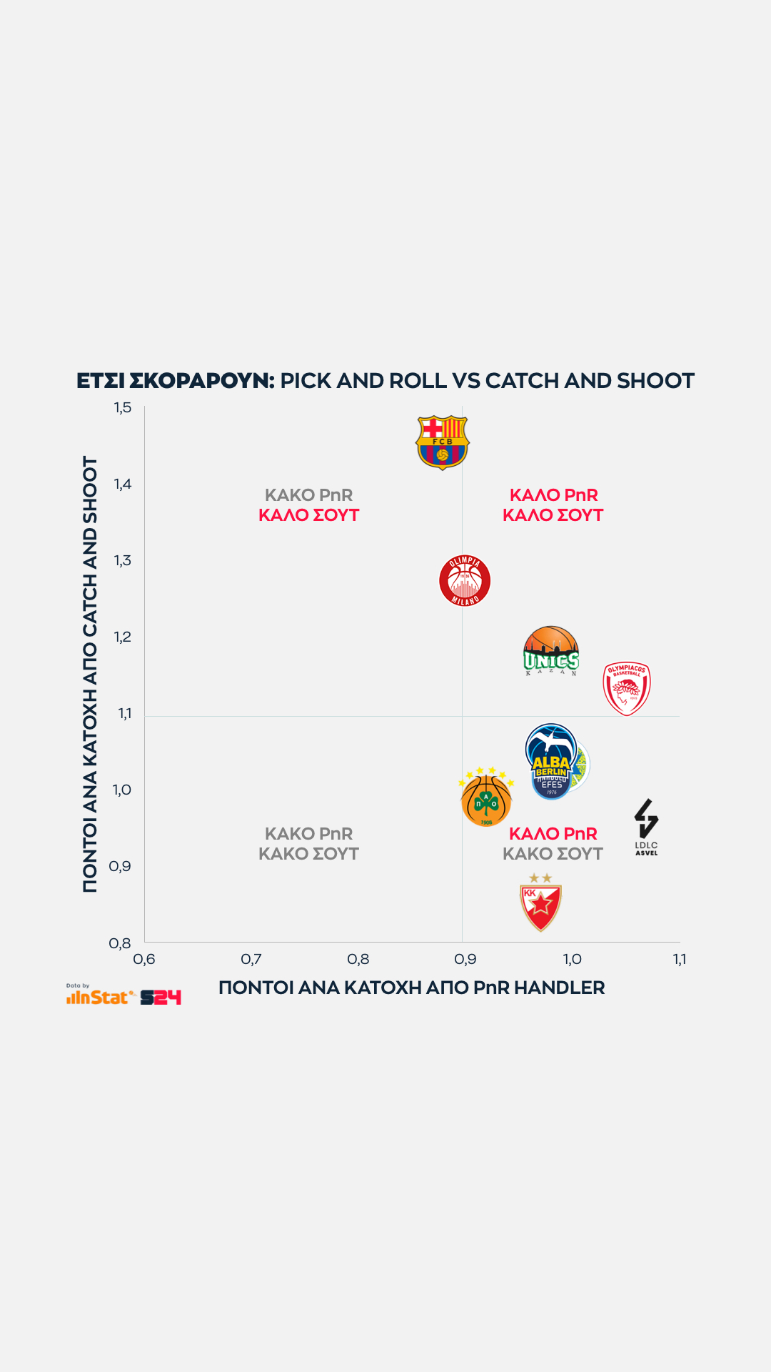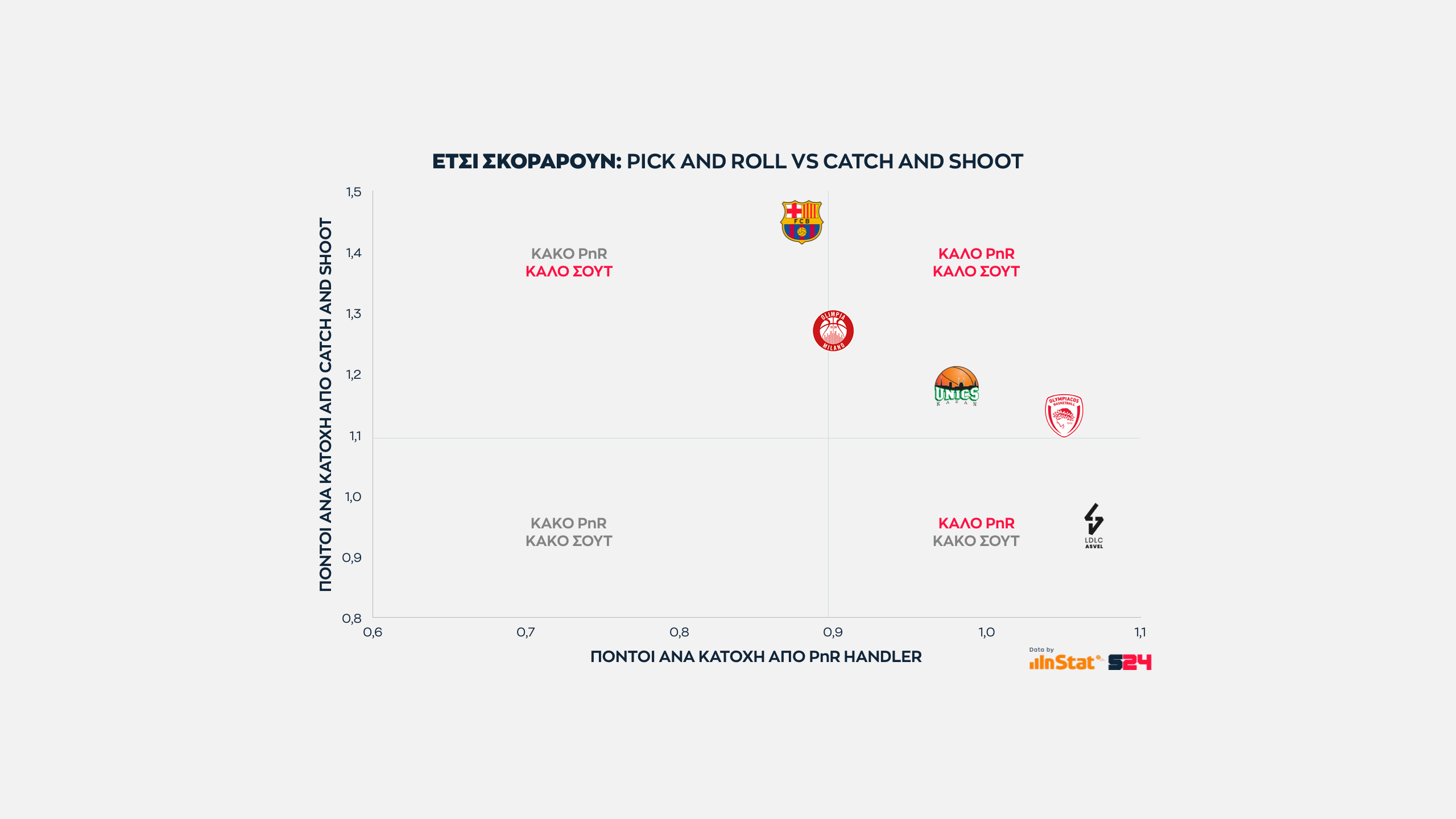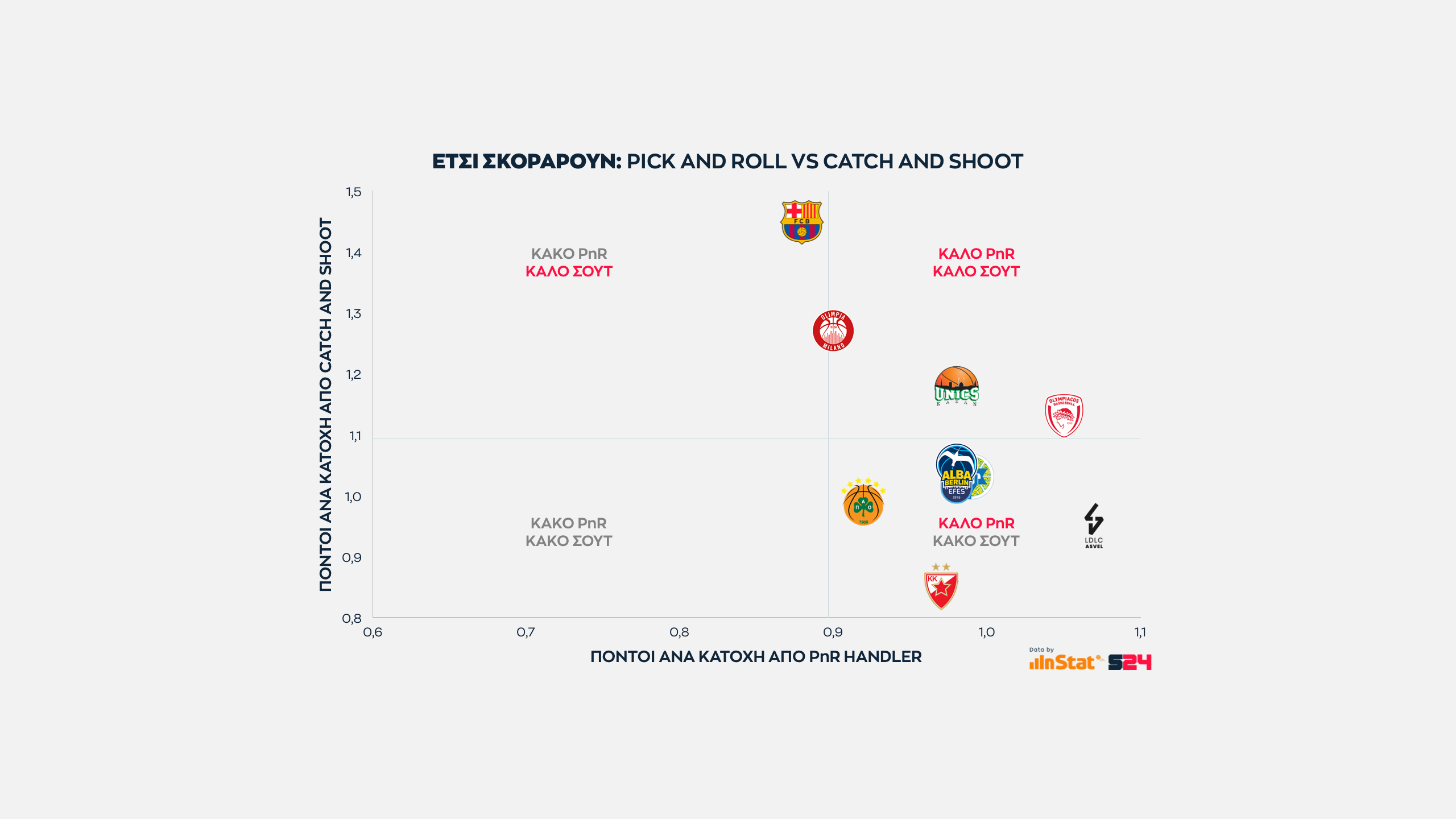 Από την άλλη, η Μπαρτσελόνα είναι η κορυφαία ομάδα σε catch and shoot περιστάσεις (Μίροτιτς, Κούριτς, Λαπροβίτολα), αλλά ταυτόχρονα εμφανίζεται πληγωμένη από την μακρά απουσία των Καλάθη και Χίγκινς με μέτρια εικόνα στο PnR.