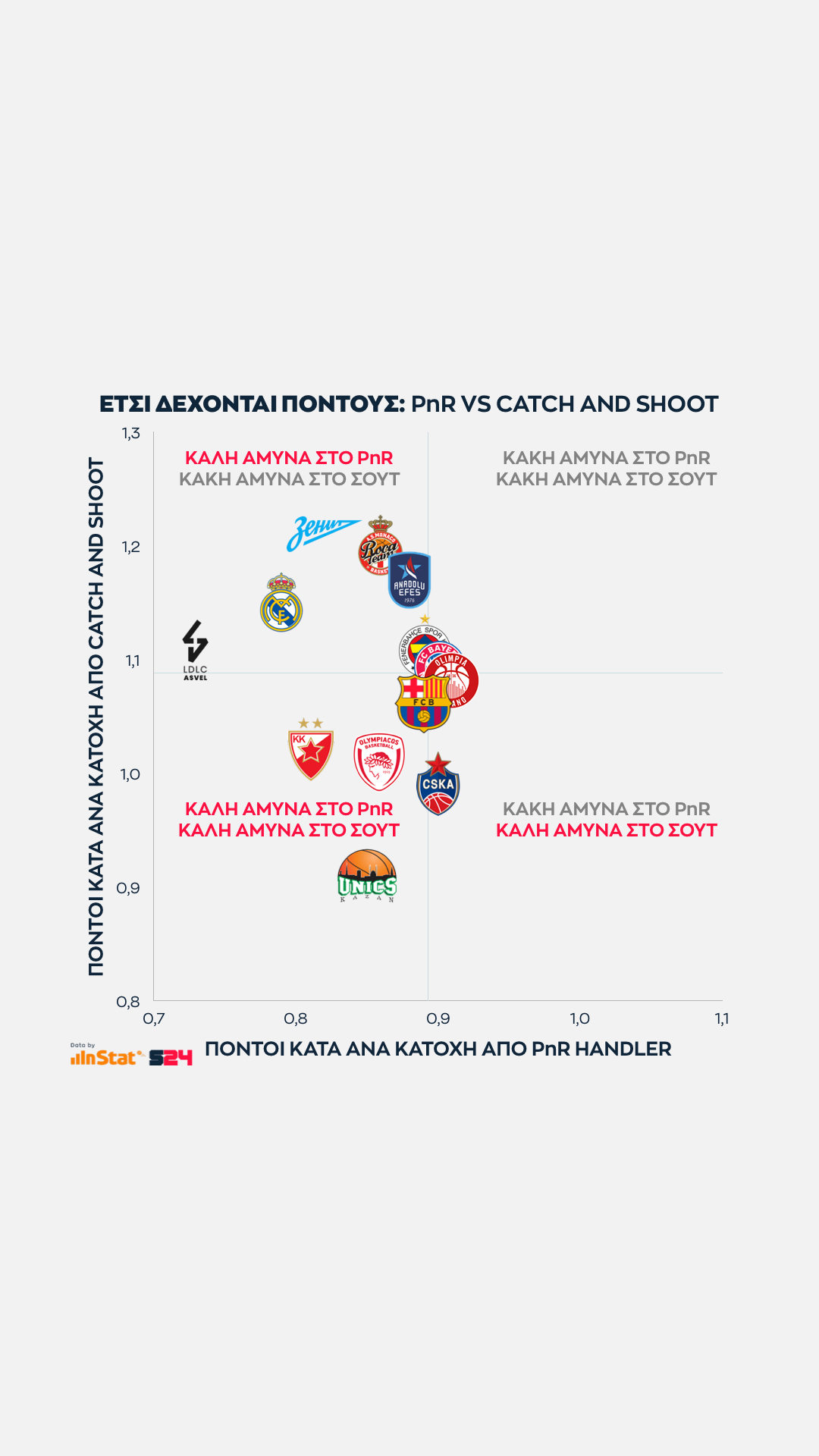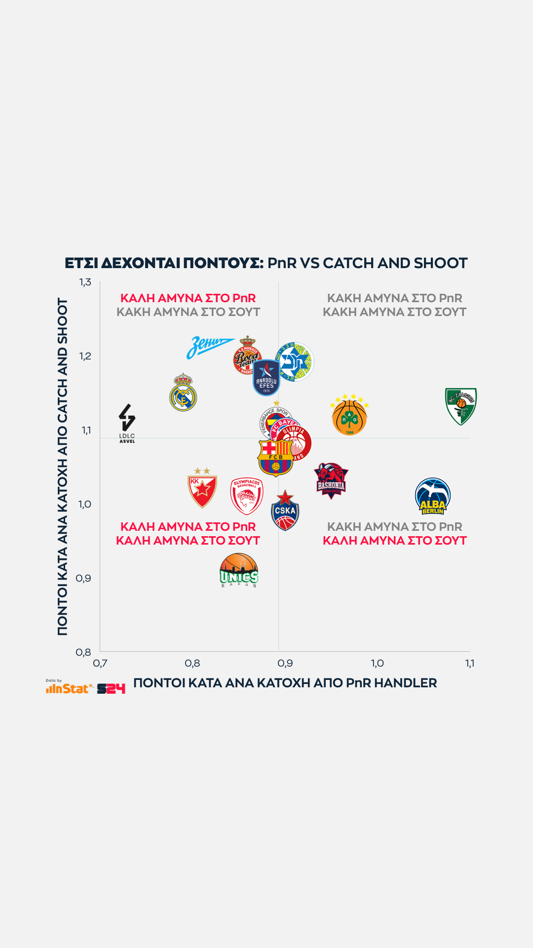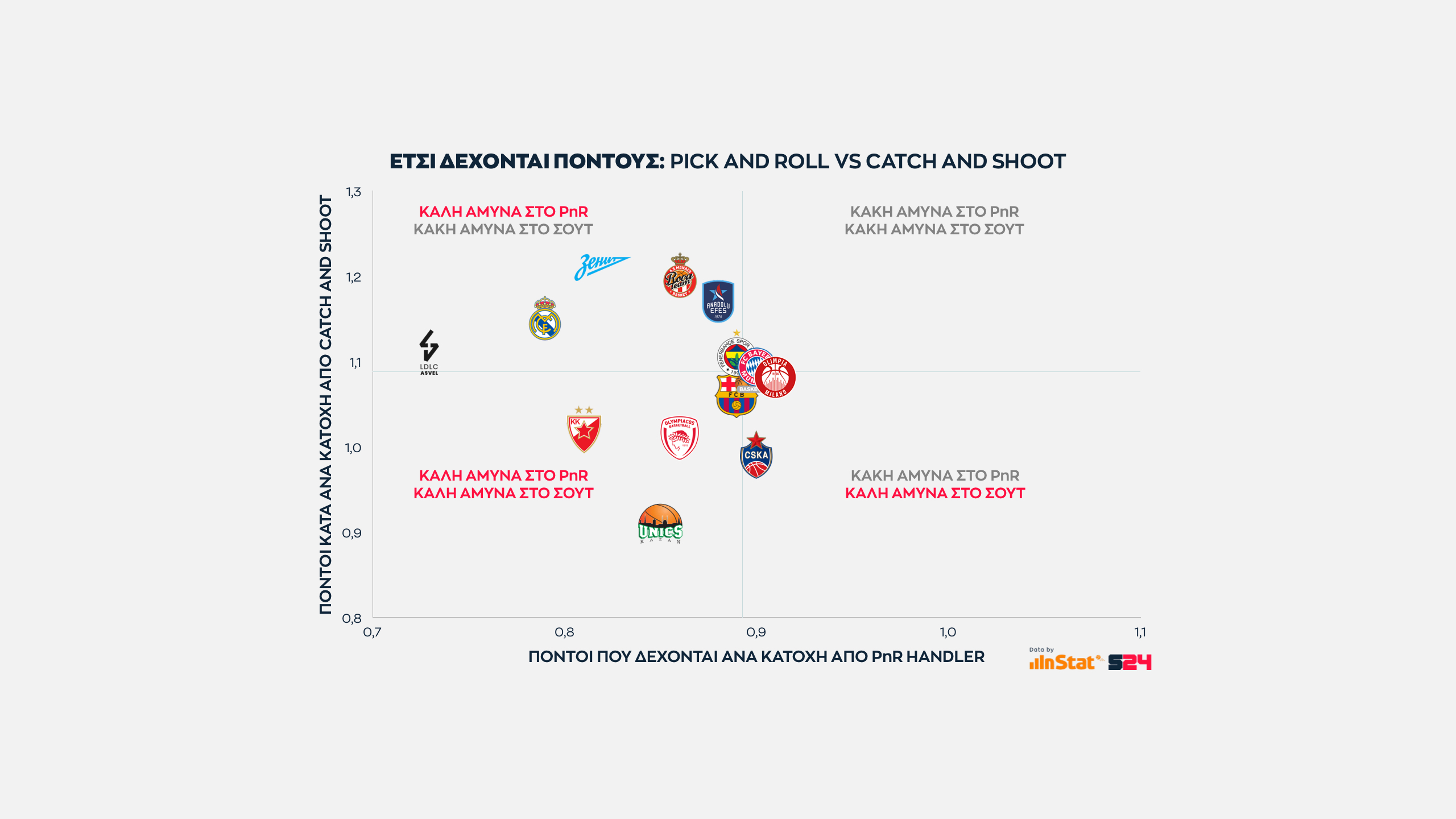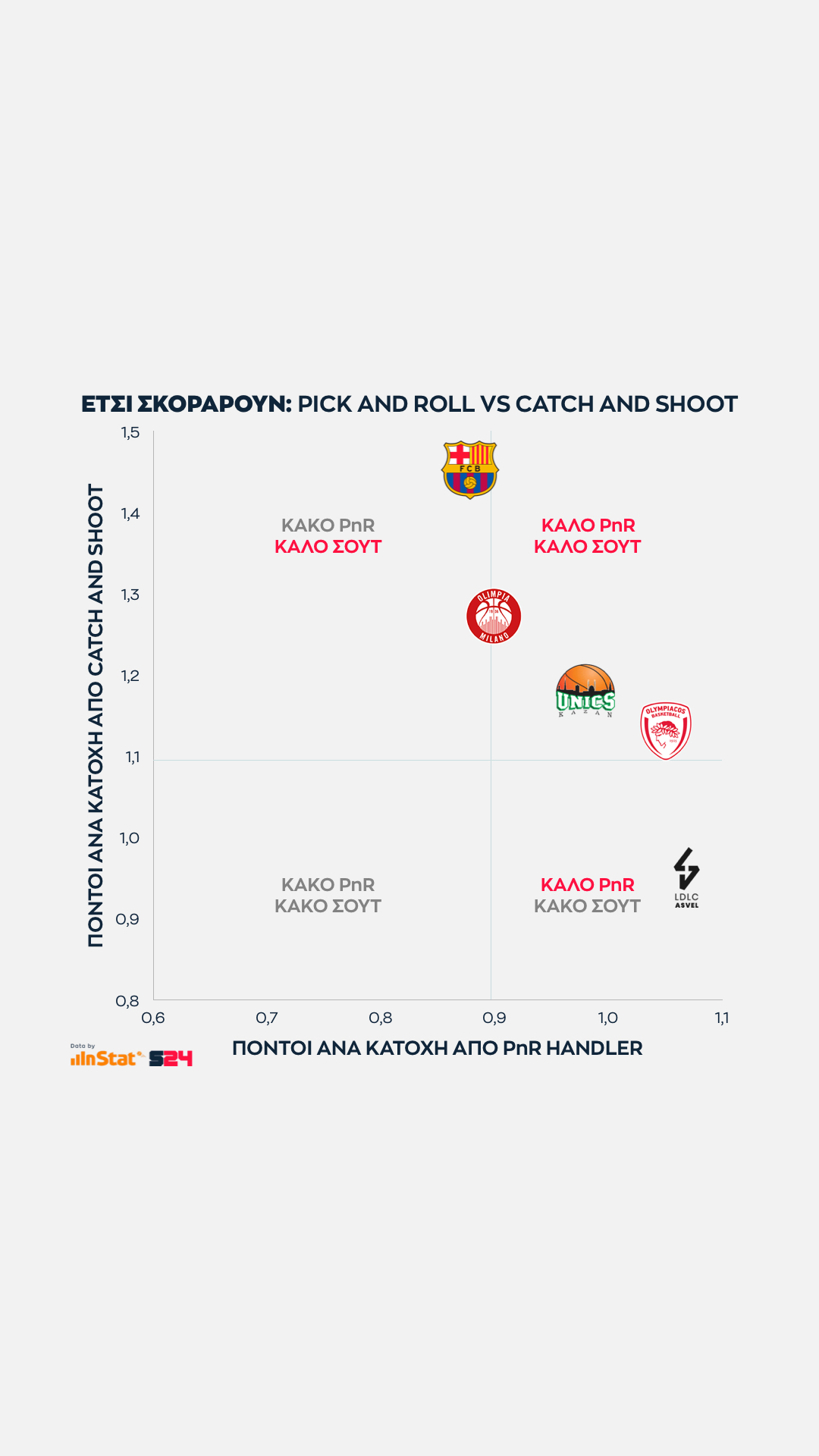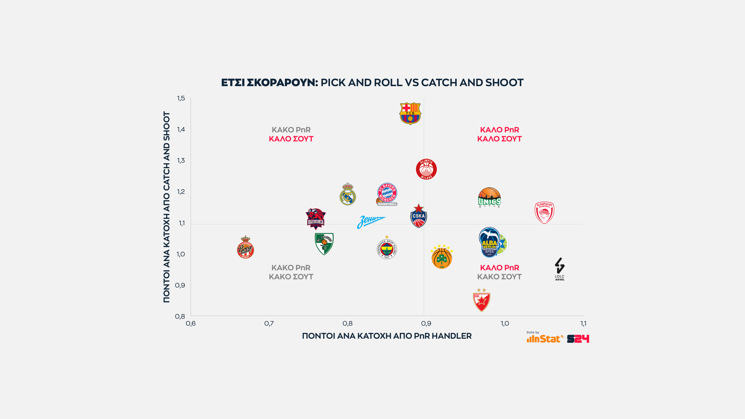 Από την άλλη, η Μπαρτσελόνα είναι η κορυφαία ομάδα σε catch and shoot περιστάσεις (Μίροτιτς, Κούριτς, Λαπροβίτολα), αλλά ταυτόχρονα εμφανίζεται πληγωμένη από την μακρά απουσία των Καλάθη και Χίγκινς με μέτρια εικόνα στο PnR.