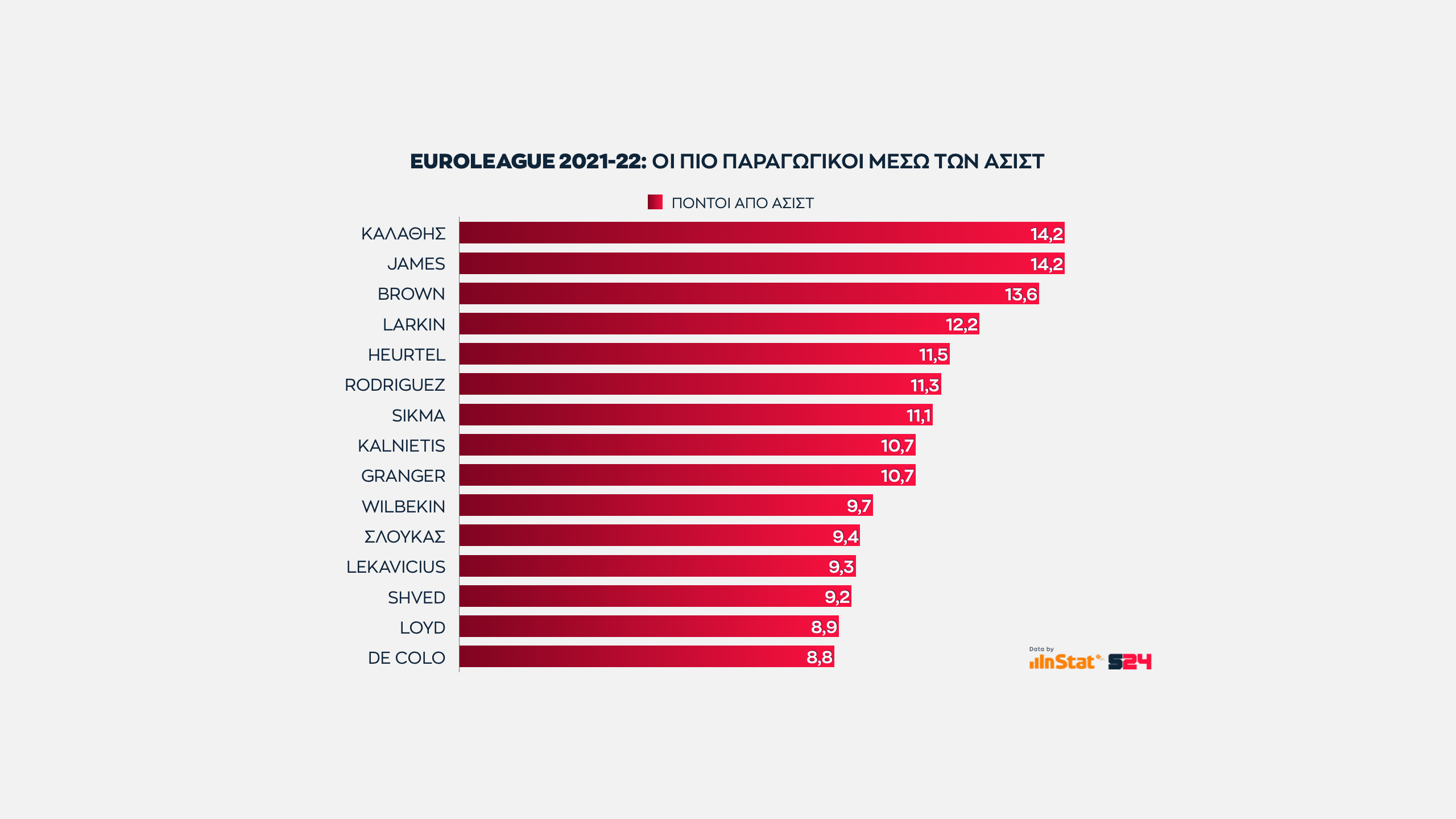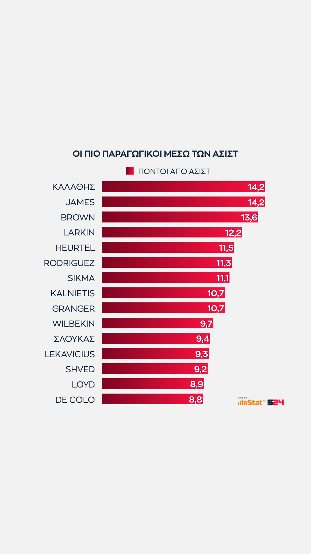 Ο Λ. Μπράουν έχει ίδιο μέσο όρο σε τελικές πάσες με τον Τζέιμς, αλλά η Ούνικς παίρνει λιγότερους πόντους, την ώρα που ο Ερτέλ (Ρεάλ) των λιγότερων ασίστ ανά ματς ξεπερνά τον Ροντρίγκεθ των περισσότερων, που είναι ο βασικός εγκέφαλος της Μιλάνο.