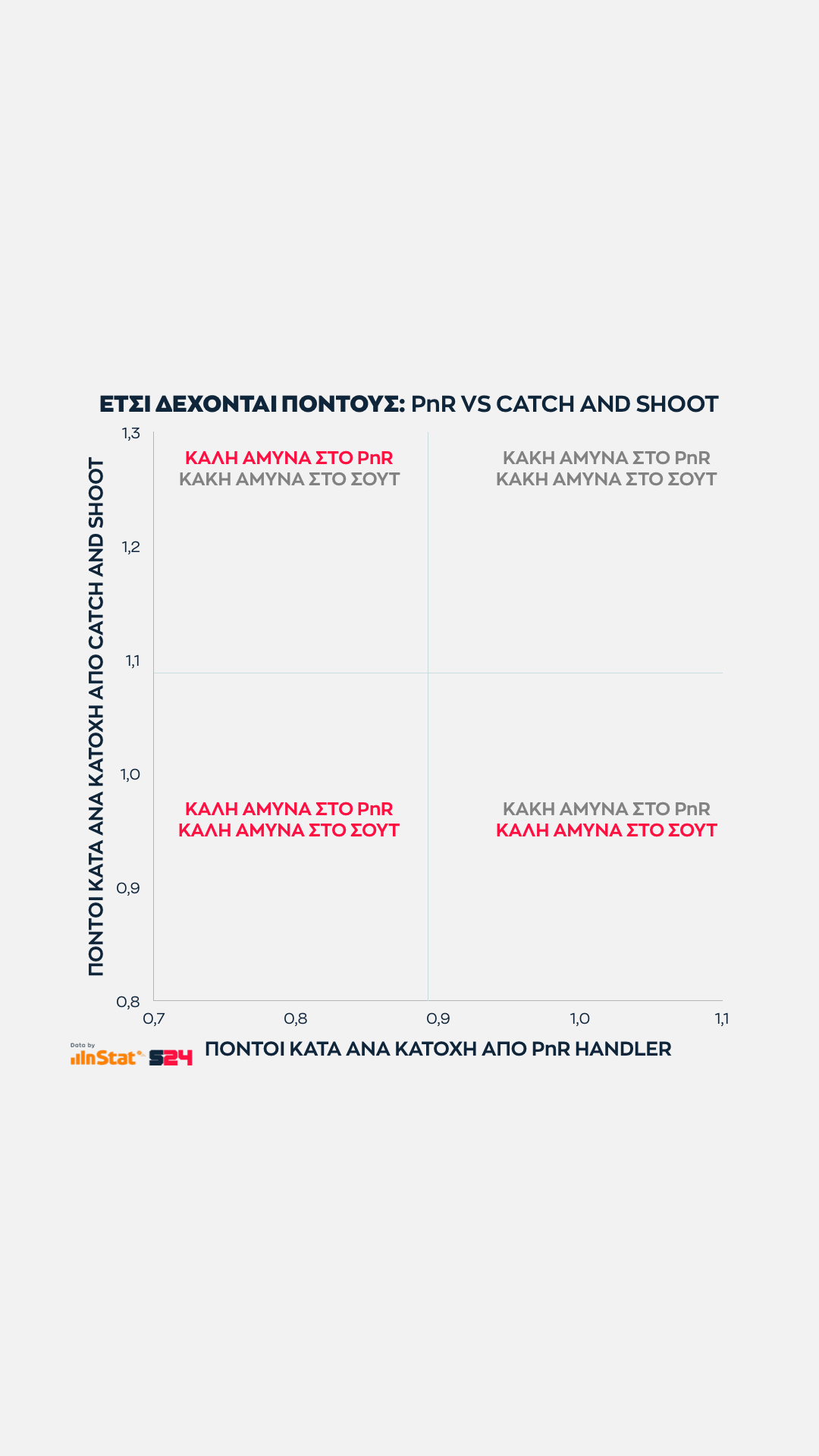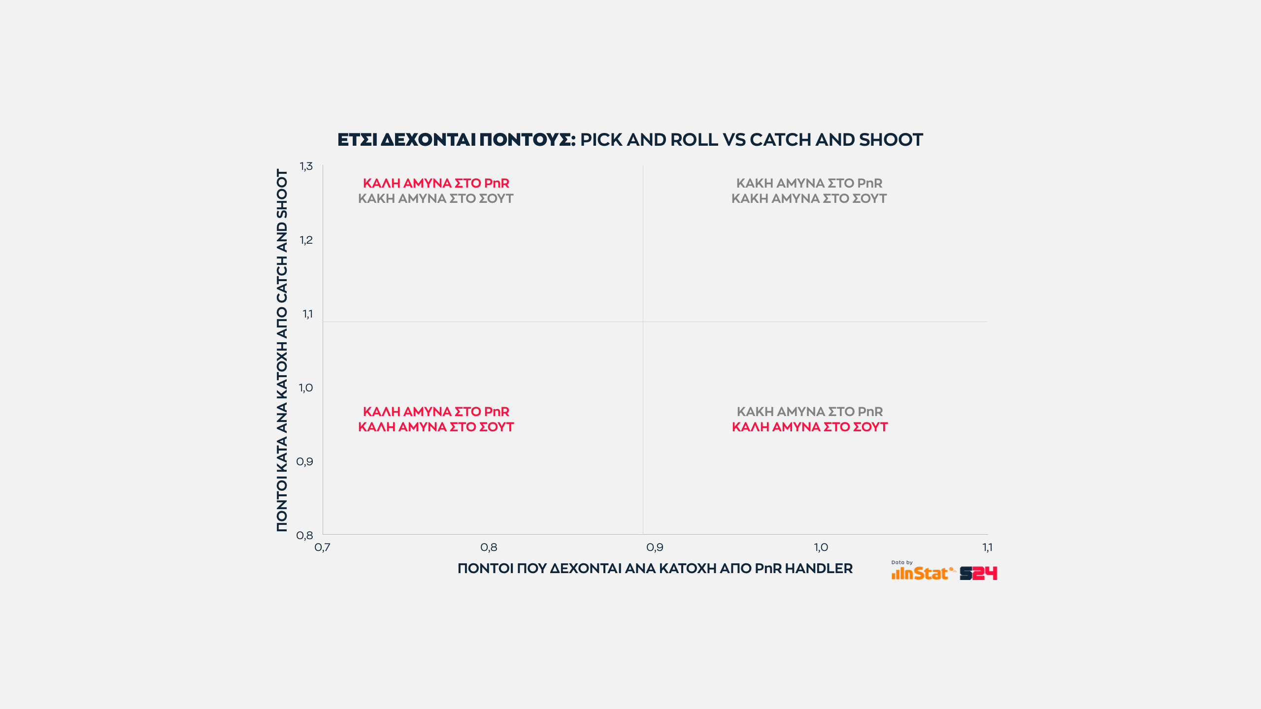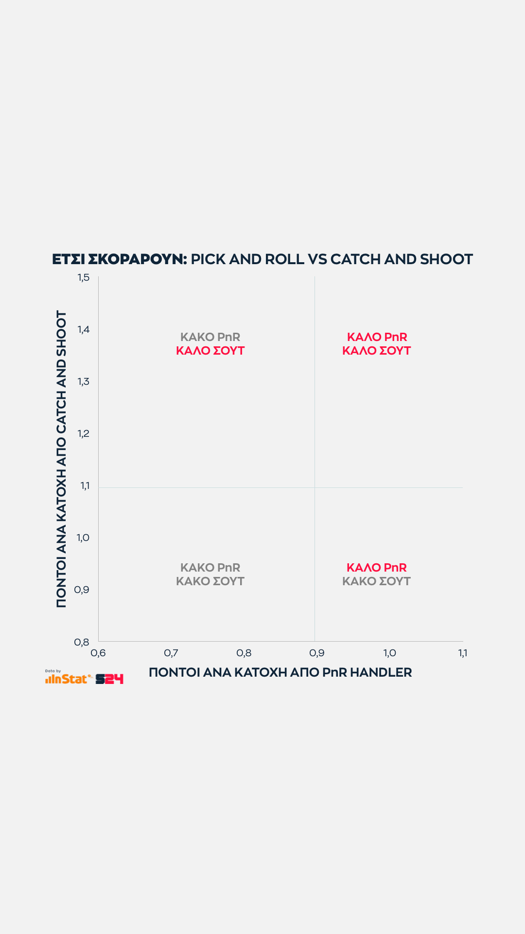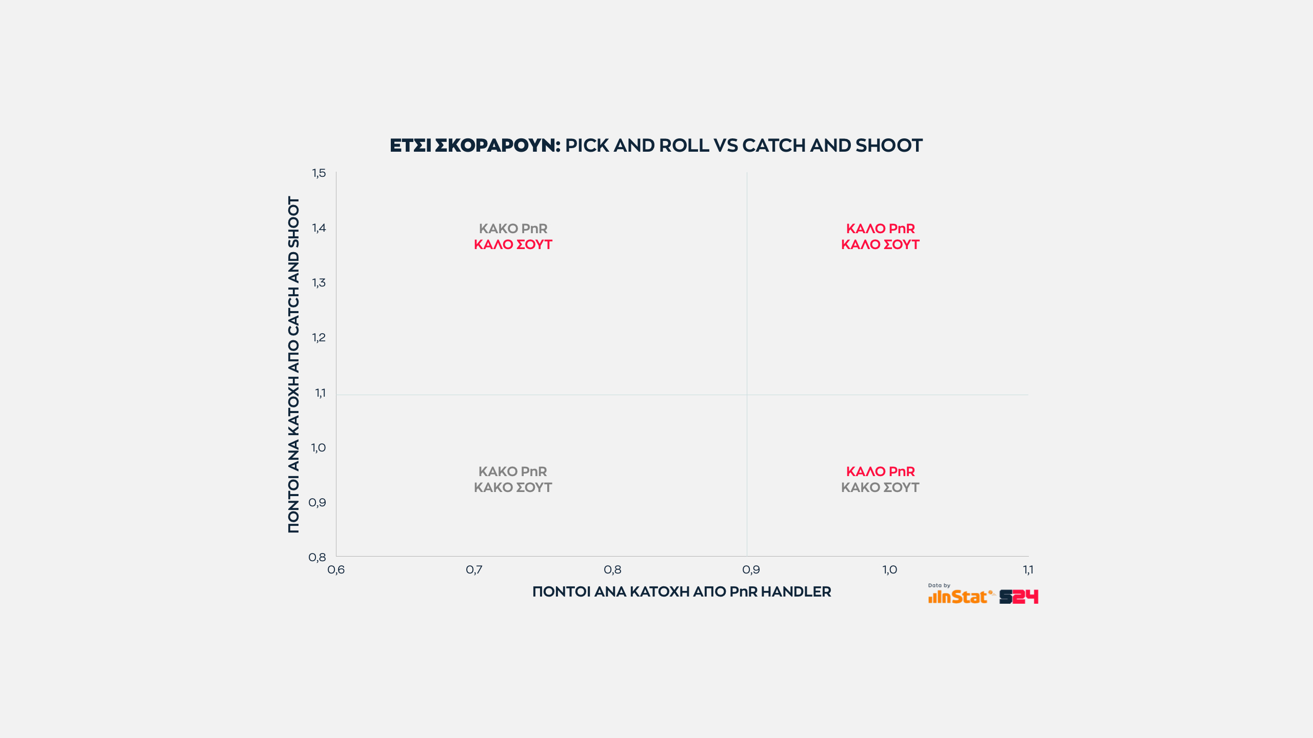 Στο σύγχρονο μπάσκετ οι δύο βασικοί άξονες πάνω στους οποίους χτίζεται το επιθετικό πλάνο μίας ομάδας είναι το πικ εν ρολ του χειριστή (PnR Handler) και η άμεση εκτέλεση (Catch and Shoot).
