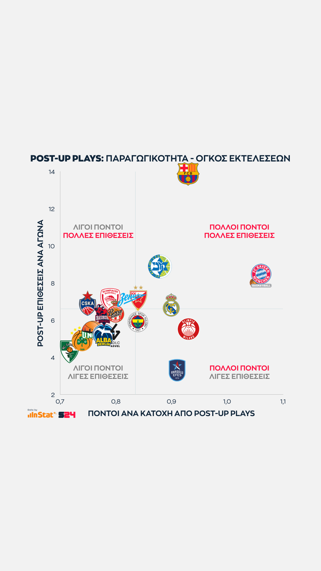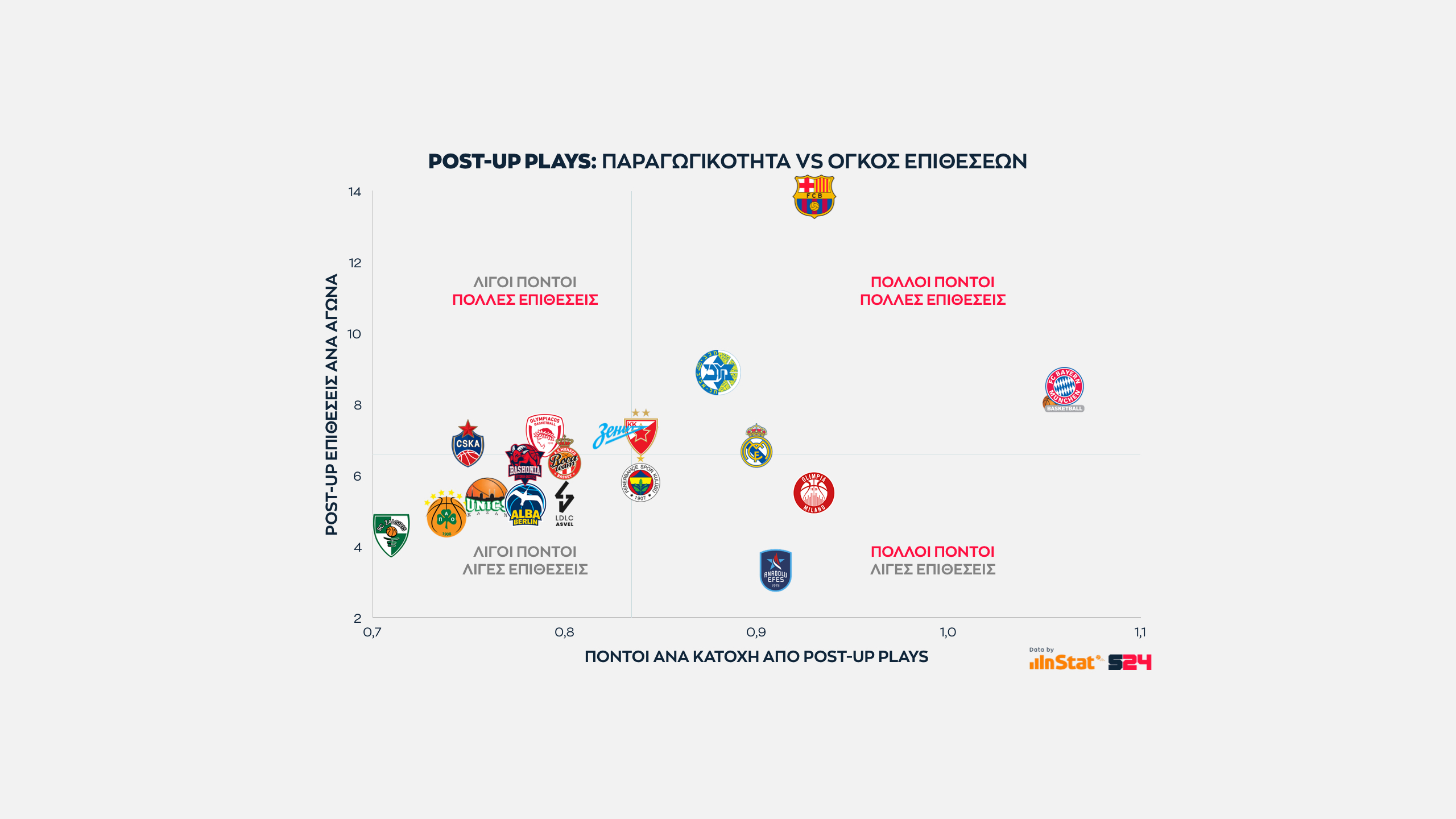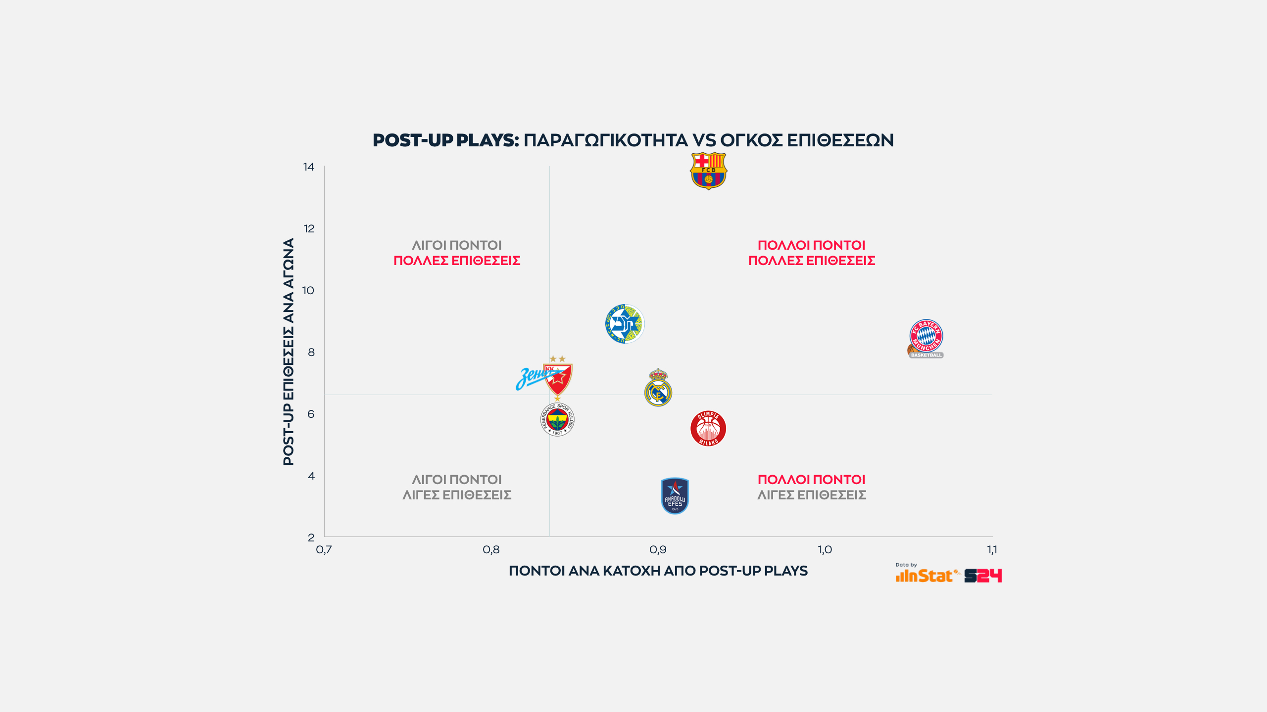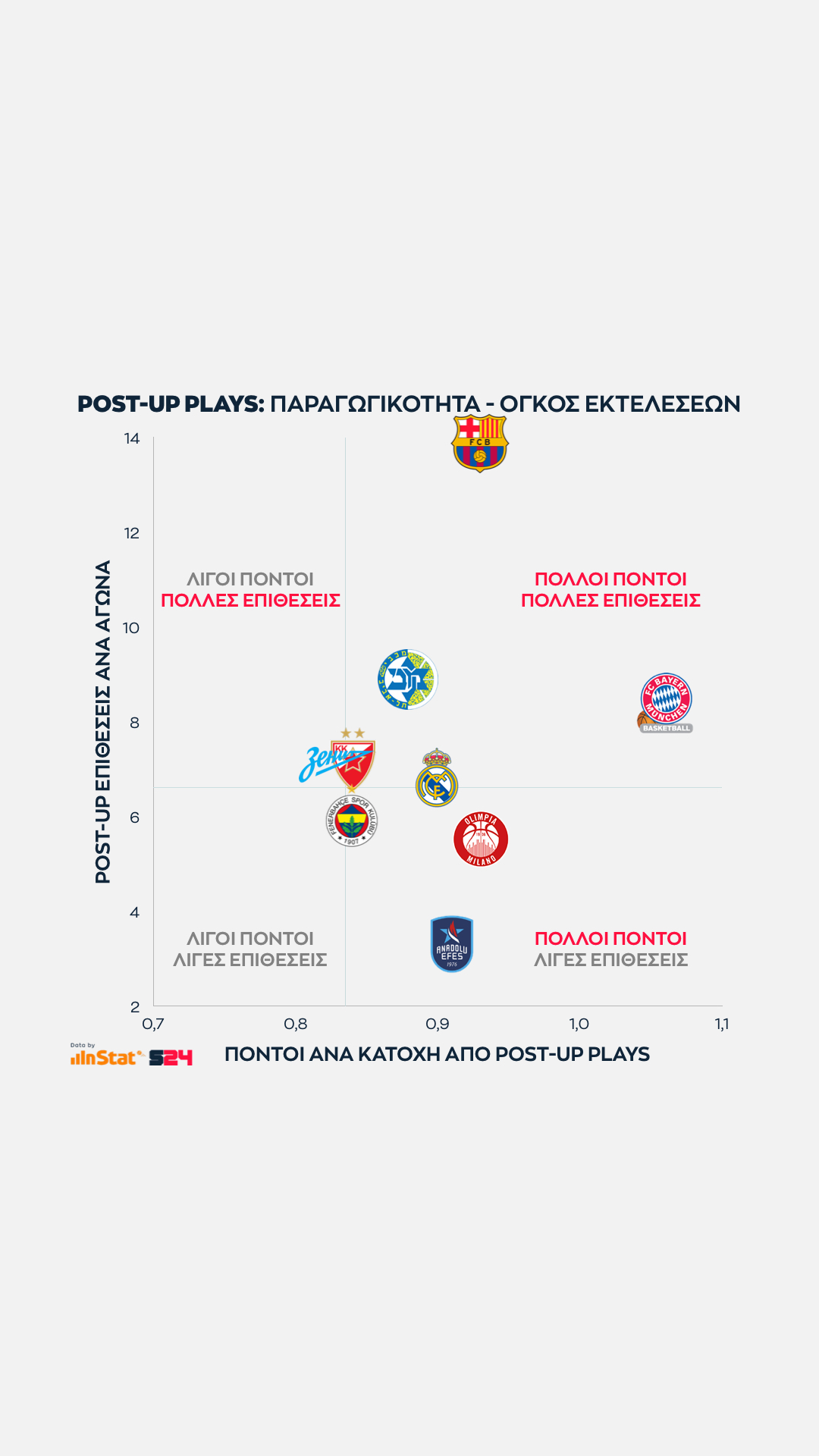 Η Ρεάλ ακολουθεί πάνω από το μέσο όρο. Όπως και η Μακάμπι, που τελειώνει αρκετές κατοχές σε Post Up καταστάσεις με άξονα τον Ζίζιτς, κόντρα στο γεγονός πως έχει "πληγωθεί" από τη μέτρια σεζόν του Ρέινολντς.