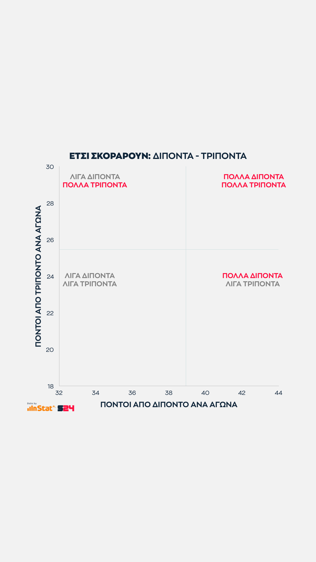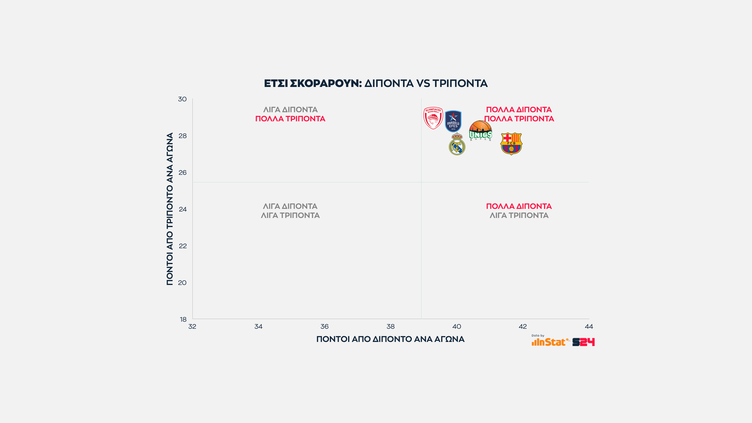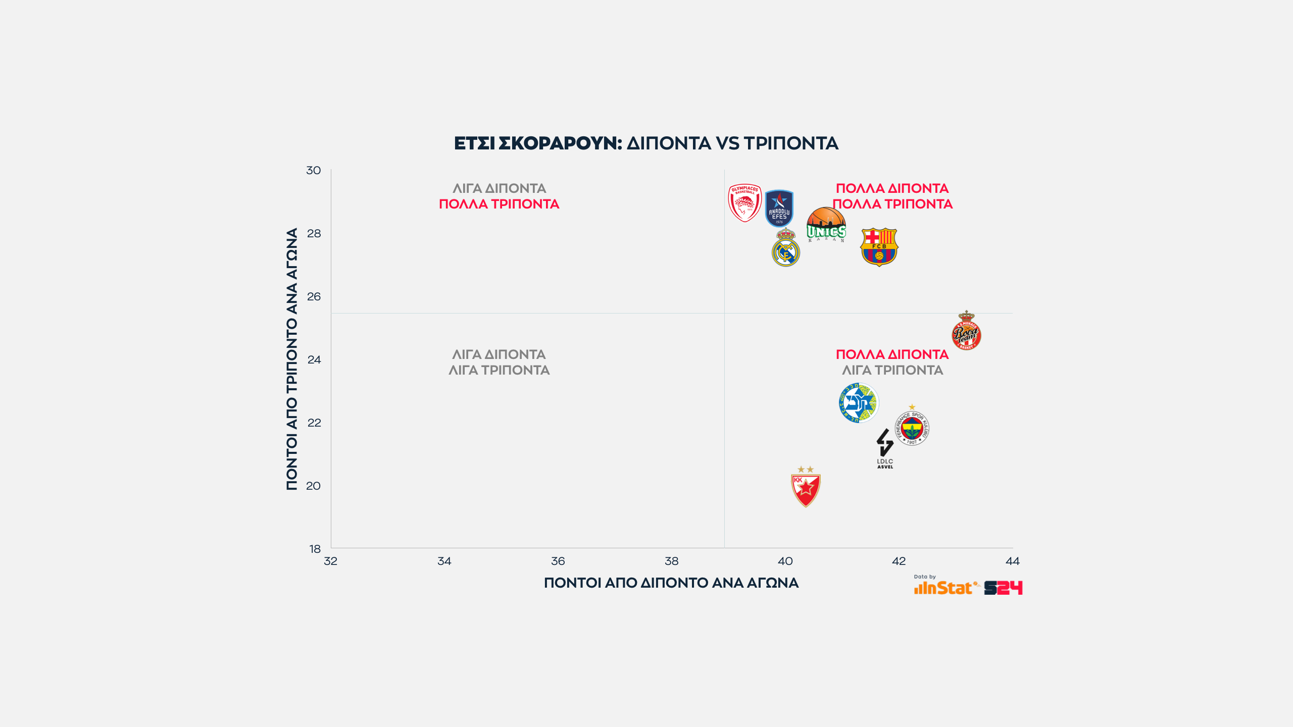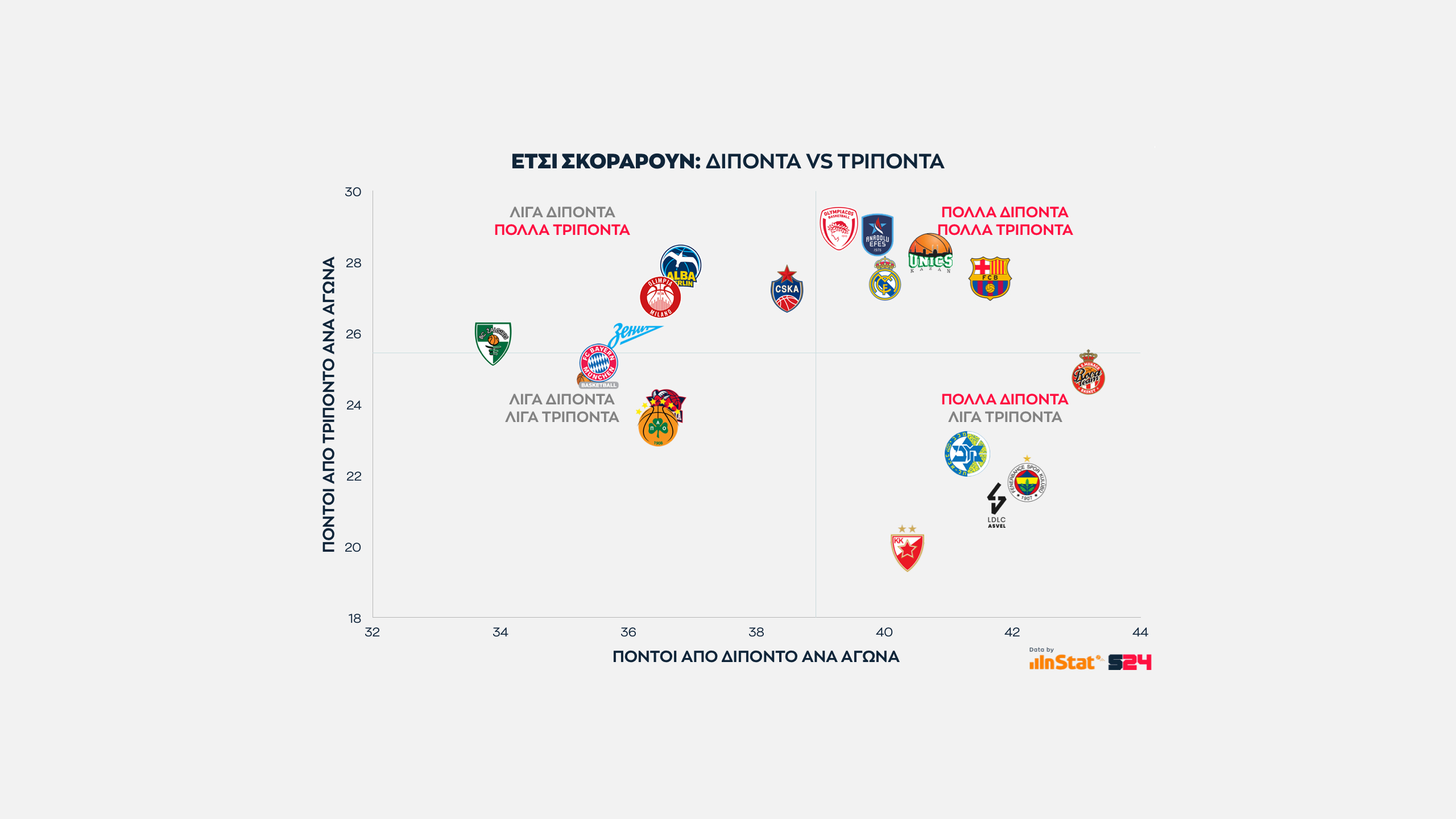 Από την εξίσωση αφαιρέσαμε τις βολές και βγάλαμε τον μέσο όρο των πόντων που κερδίζει κάθε ομάδα μέσα κι έξω από τη γραμμή των 6μ75 σε κάθε παιχνίδι της