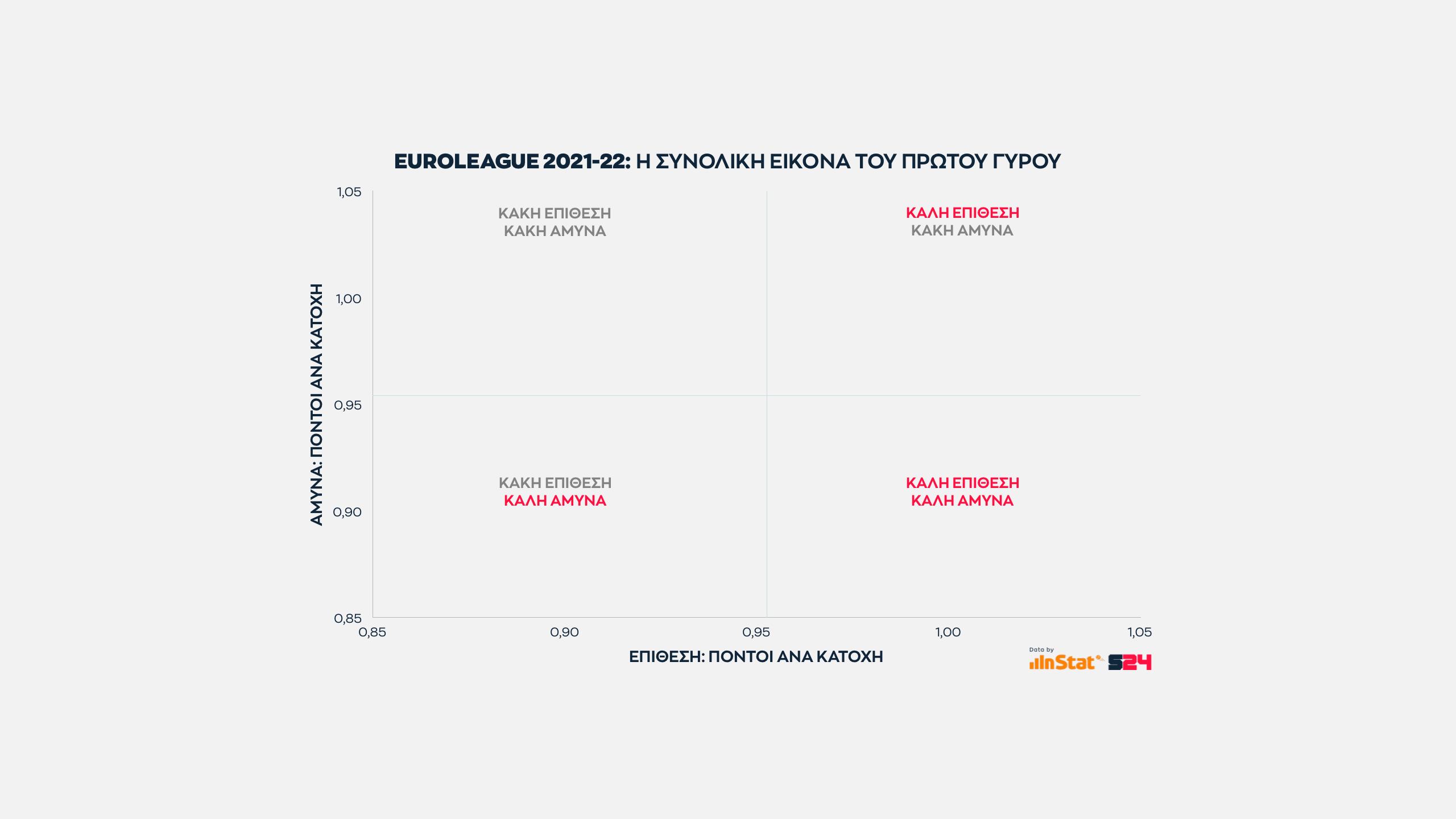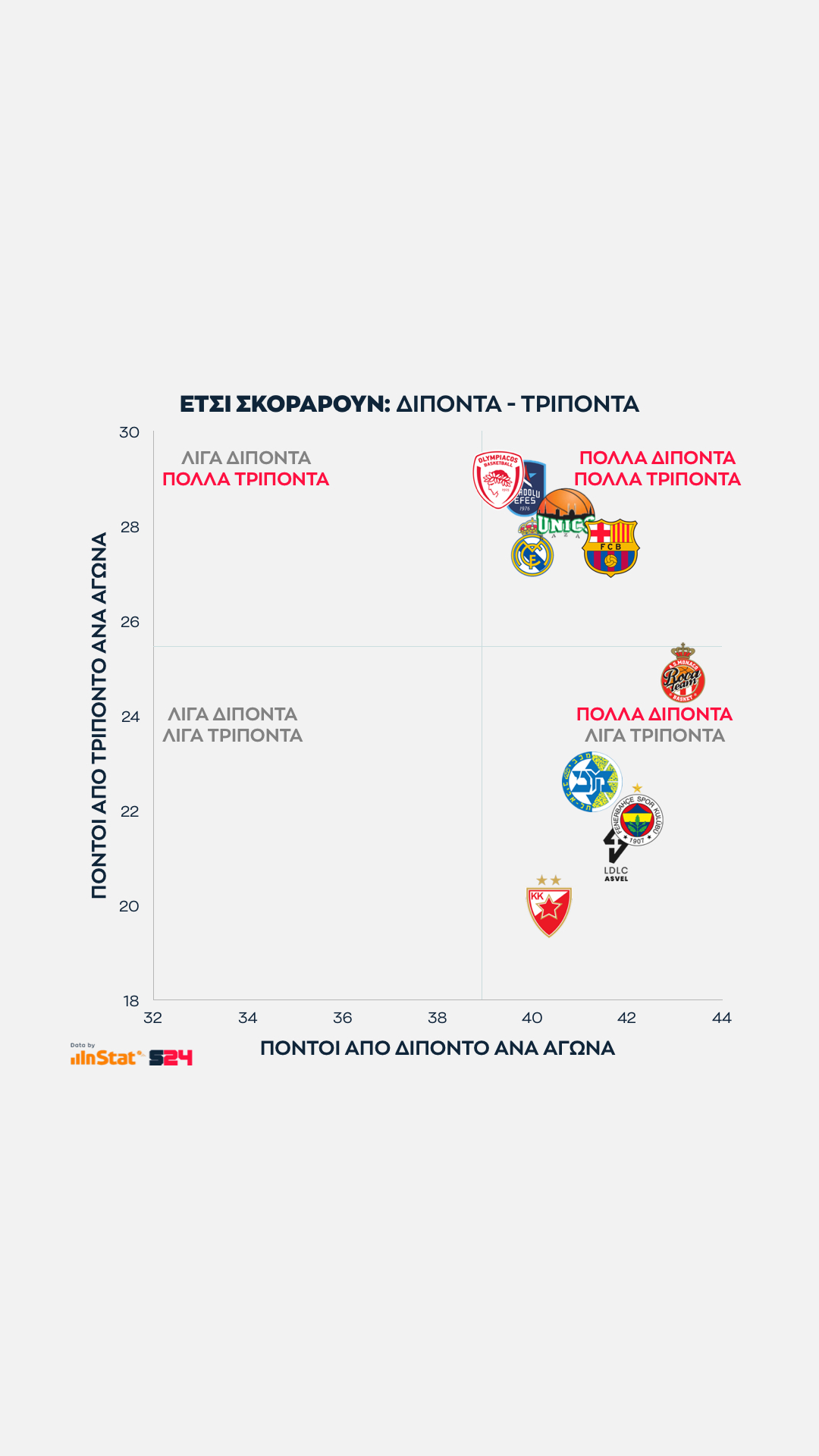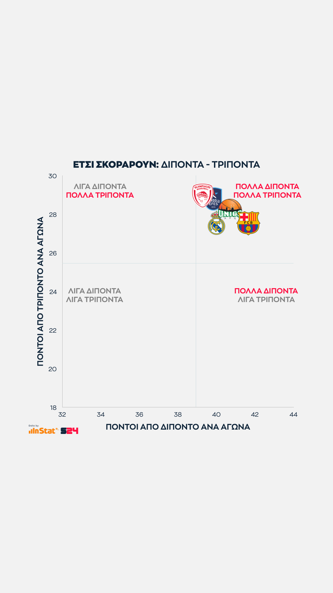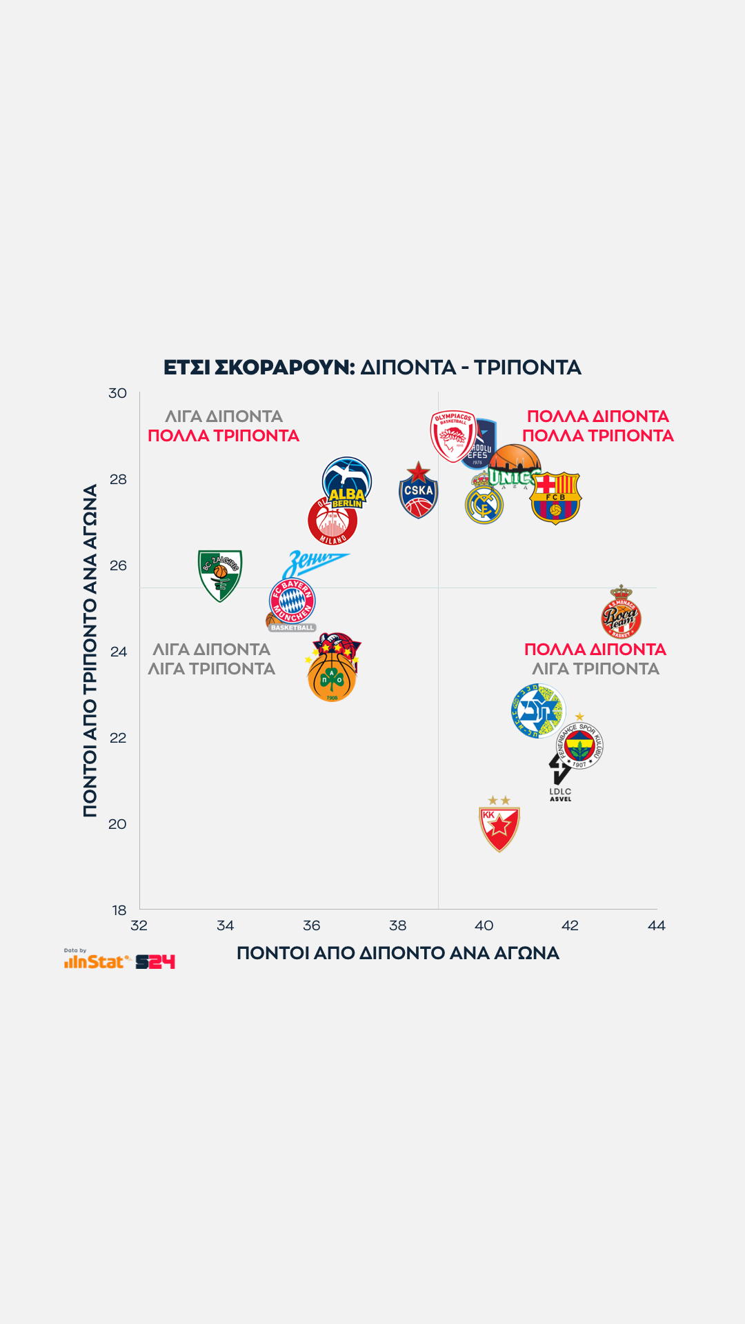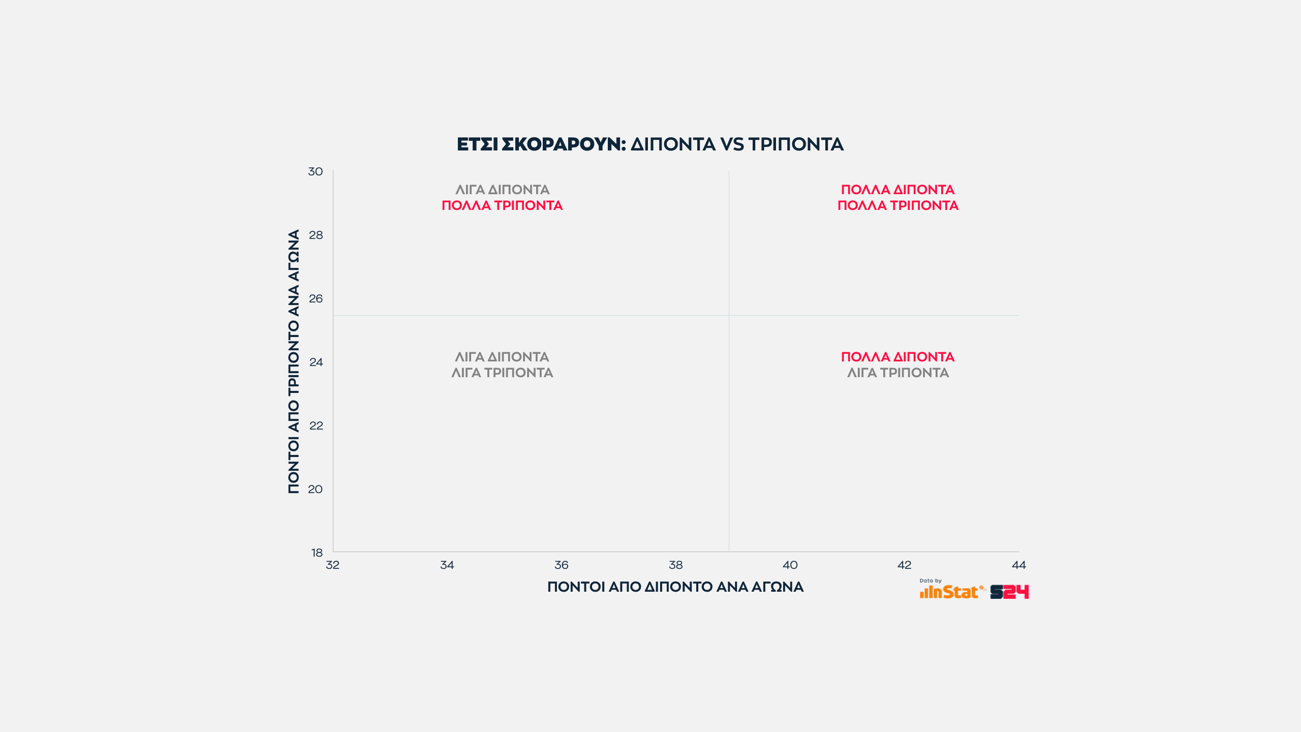 Από την εξίσωση αφαιρέσαμε τις βολές και βγάλαμε τον μέσο όρο των πόντων που κερδίζει κάθε ομάδα μέσα κι έξω από τη γραμμή των 6μ75 σε κάθε παιχνίδι της