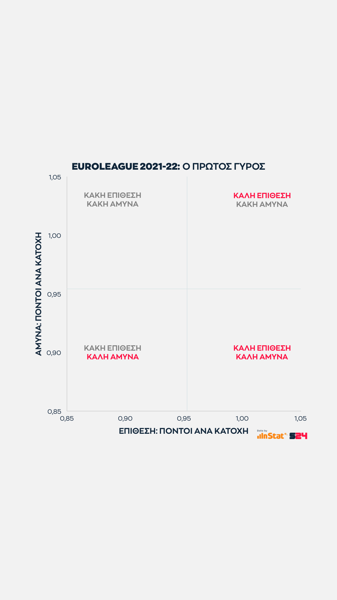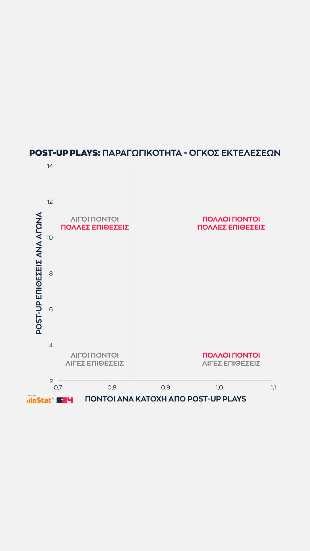 Ψηλά στο σχέδιο βρίσκονται οι ομάδες που παίρνουν περισσότερους πόντους από τρίποντα και δεξιότερα αυτές που σκοράρουν κατά βάση με προσπάθειες μέσης ή κοντινής απόστασης, αποφεύγοντας τα πολλά ρίσκα.