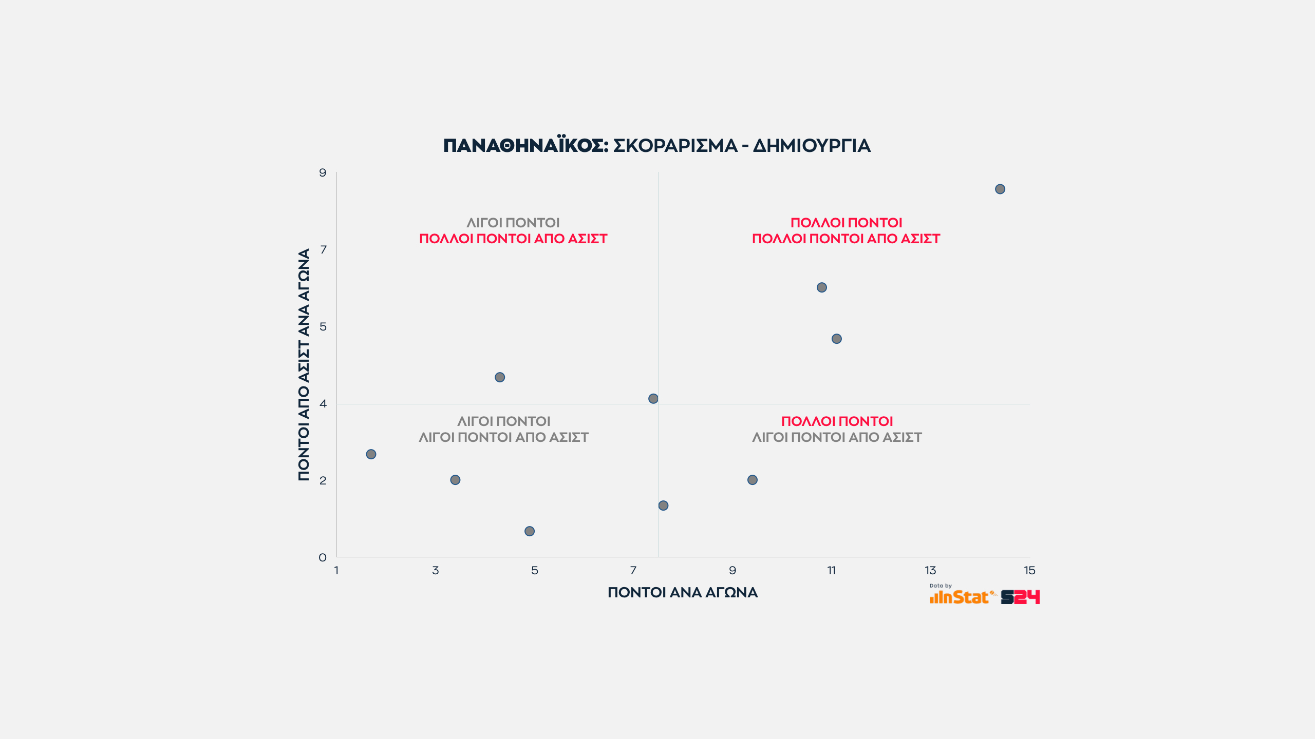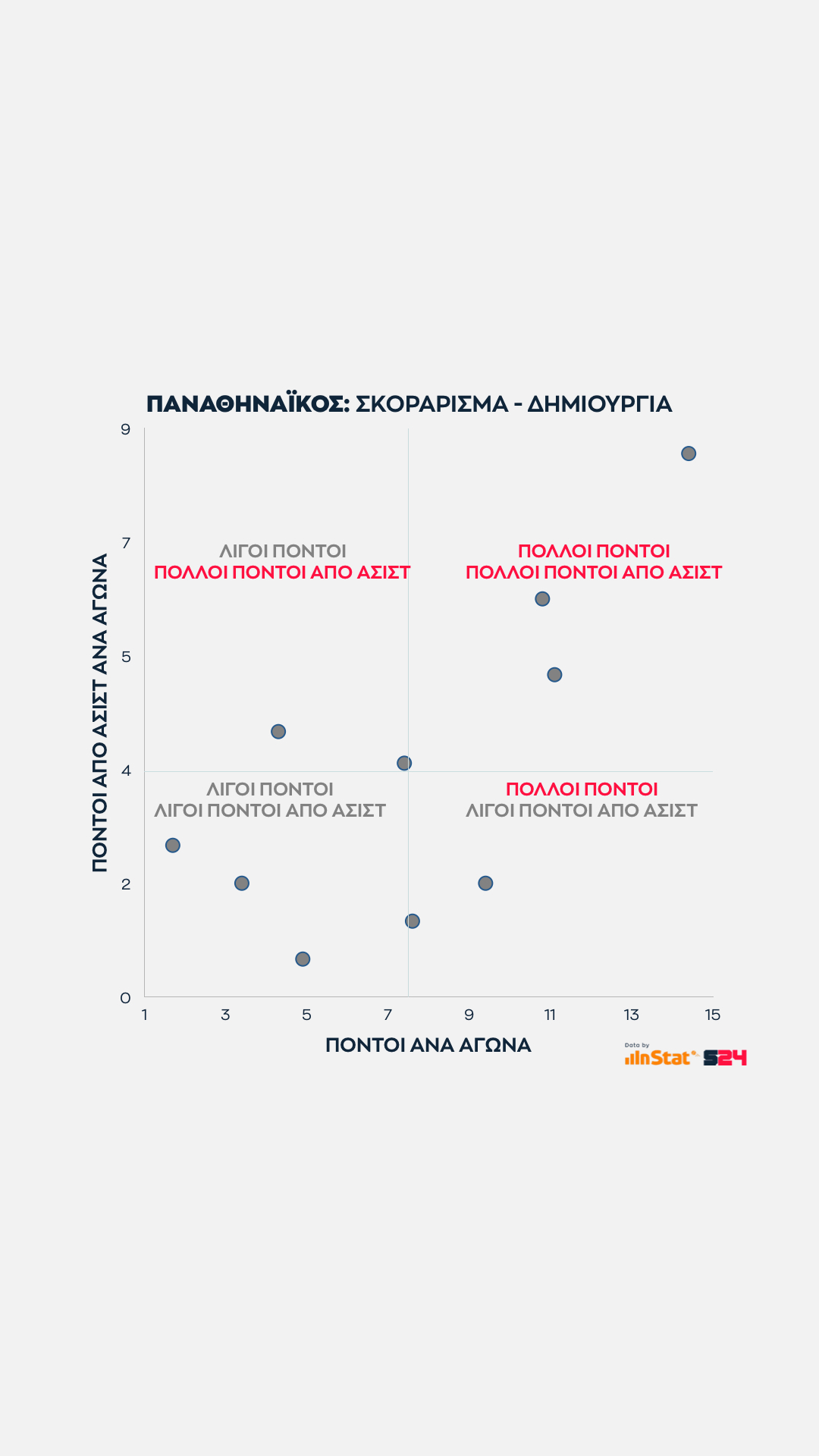 Επαναλαμβάνουμε ότι όσο πιο δεξιά είναι ένας παίκτης τόσο καλύτερος σκόρερ είναι και όσο ψηλότερα σε χώρο τόσους περισσότερους πόντους δίνει από ασίστ στον Παναθηναϊκό.