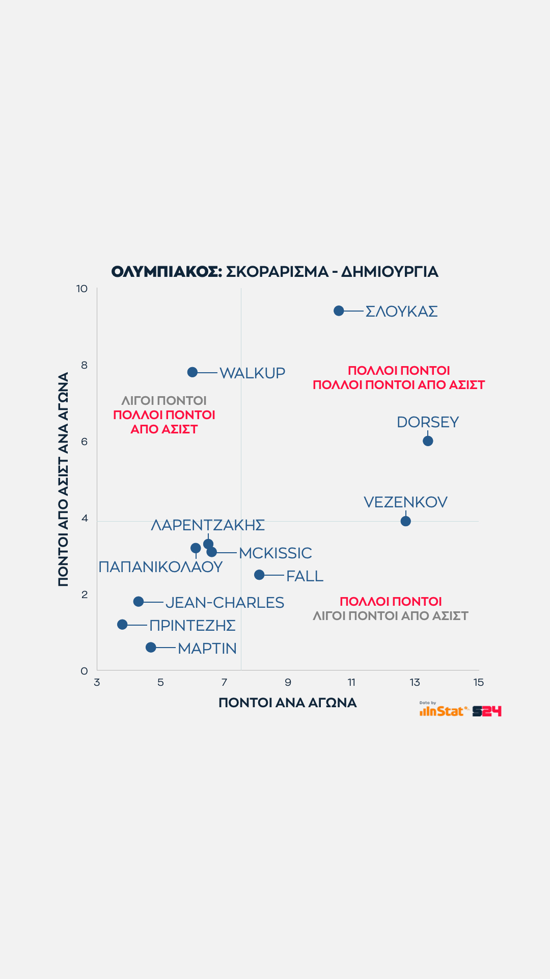 Αμφότεροι προηγούνται του Μάρτιν (που έχει υψηλό αριθμό κι αρκετές επιθέσεις για όσο παίζει) και του Παπαγιάννη (των άλει ουπ), οι οποίοι παράγουν σχεδόν τους ίδιους πόντους .