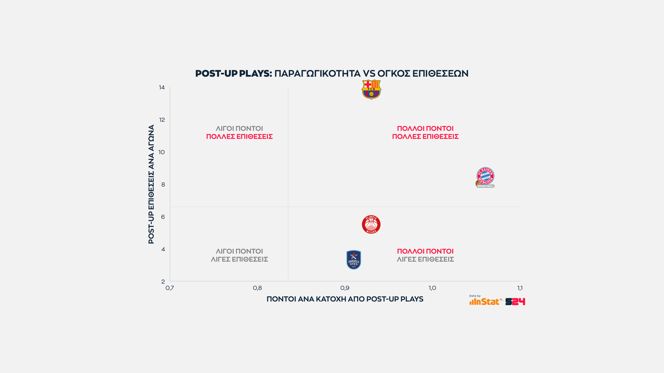 Εδώ ως η εξαίρεση του "άβατου" αυτού κανόνα που θέλει τις 17/18 ομάδες να επιτίθενται είτε με PnR είτε με Catch and Shoot λειτουργεί η Μπαρτσελόνα, επενδύοντας κατά βάση στο παιχνίδι από το χαμηλό ποστ.