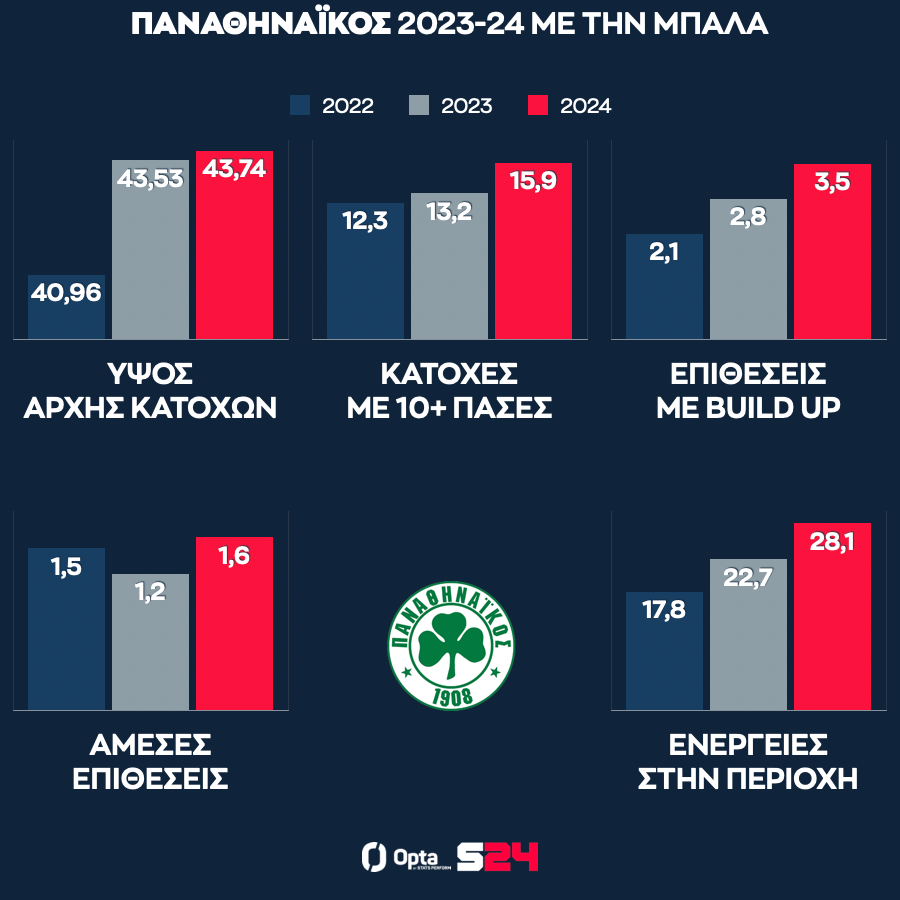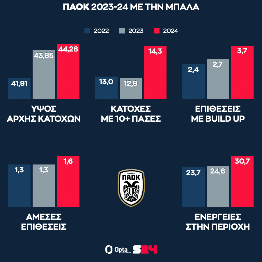 Όλοι οι δείκτες προς τα πάνω. Ο ΠΑΟΚ έπαιξε πιο ψηλά, κράτησε περισσότερο την μπάλα, ήταν πρώτος στις επιθέσεις με build up, έπαιξε στην κόντρα και είχε 30+ ενέργειες στην περιοχή για πρώτη φορά από το 2019.