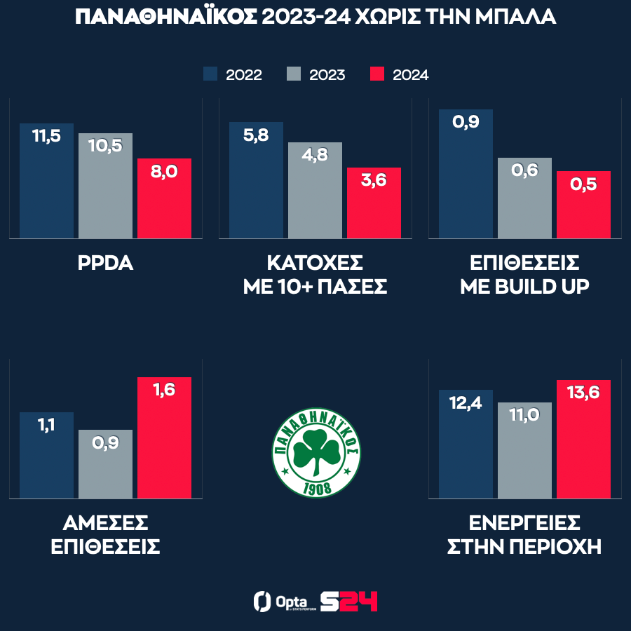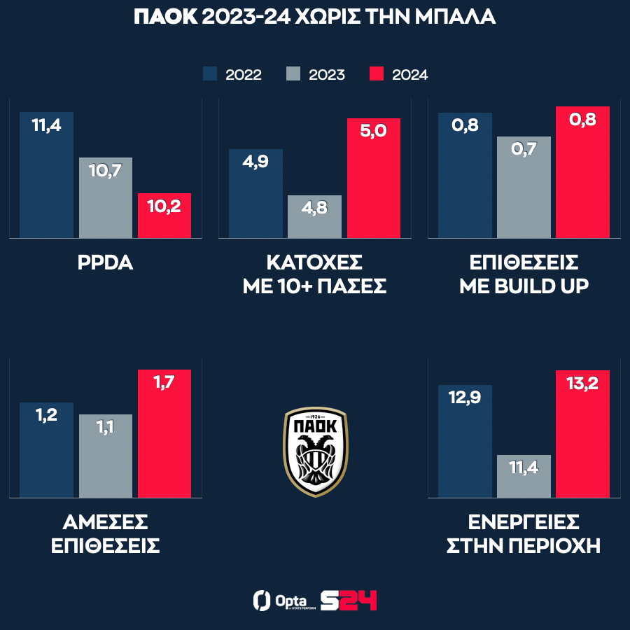 Ο ΠΑΟΚ ούτε πέρυσι πίεζε πολύ, φέτος το έκανε ακόμα λιγότερο. Η ομάδα του Λουτσέσκου επιτρέπει την κατοχή στον αντίπαλο, αλλά έγινε ευάλωτη στην κόντρα, με 1.7 άμεσες επιθέσεις σε κάθε ματς και πιο "εύκολη" στο να δεχθεί φάσεις στην περιοχή της.