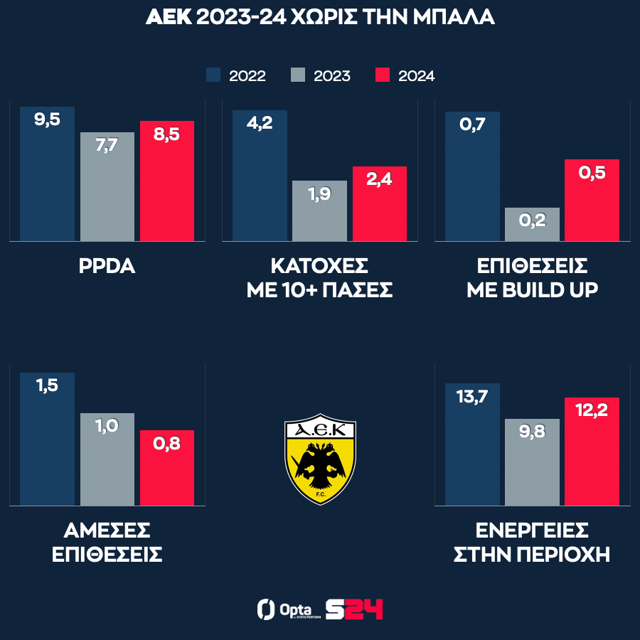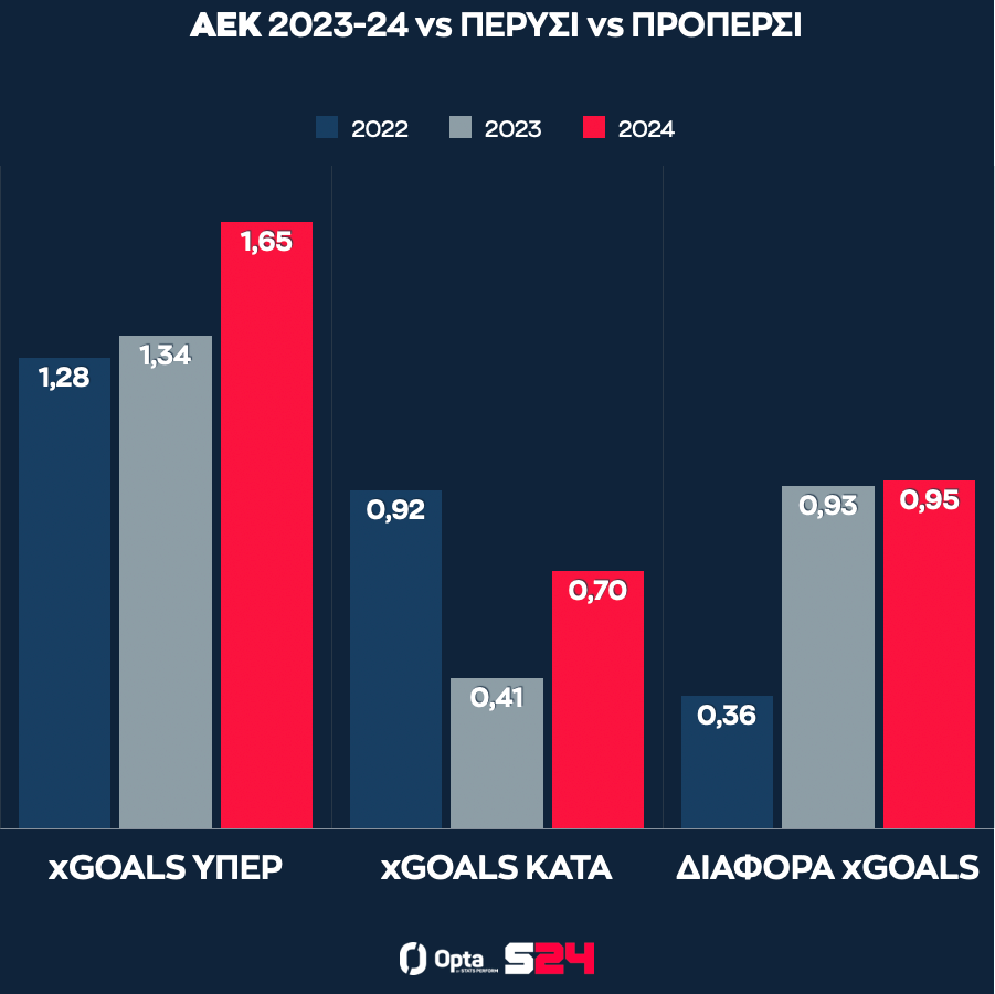 Η ΑΕΚ έγινε ακόμα πιο επιθετική, αλλά ταυτόχρονα έγινε πιο ευάλωτη. Το περσινό 0.41 ήταν η καλύτερη αμυντική επίδοση του πρωταθλήματος και φέτος η Ένωση ανέβηκε στο 0.70, χειροτέρευσε όσο καμία άλλη ομάδα του Big-5.