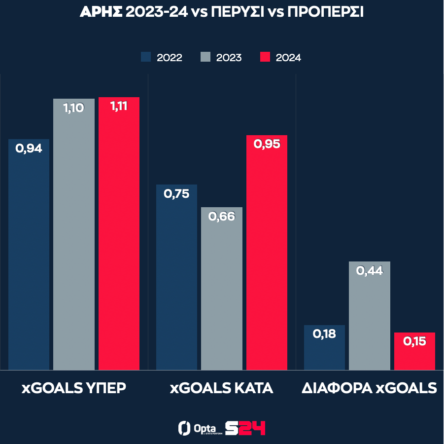 Κάπως έτσι, από το περσινό κακό 0.44 στη διαφορά των xG, ο Άρης "βούτηξε" στο άθλιο 0.15. Μακράν η χειρότερη επίδοσή του στις τελευταίες έξι σεζόν, από τότε δηλαδή που η Opta καλύπτει το πρωτάθλημα.