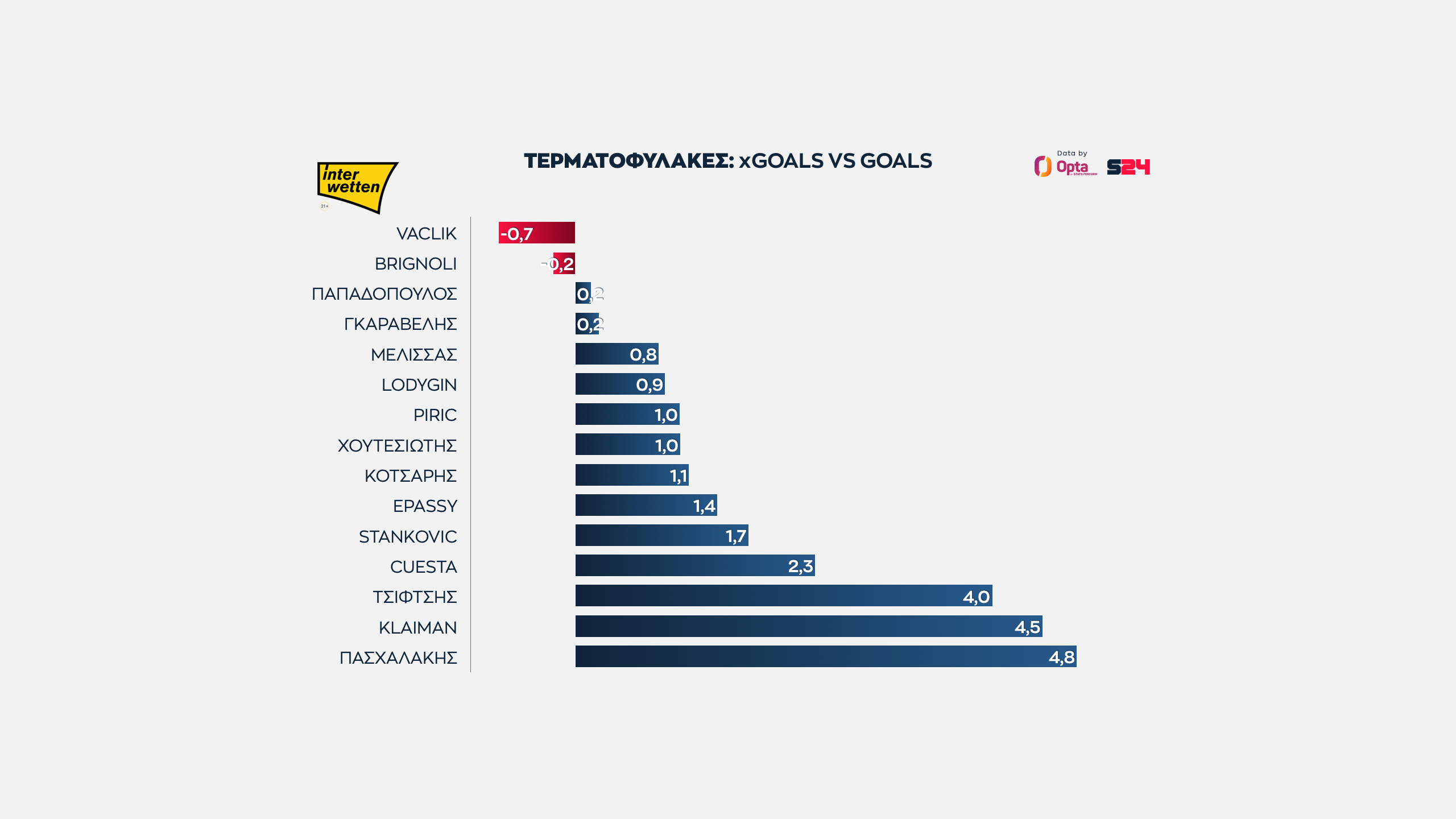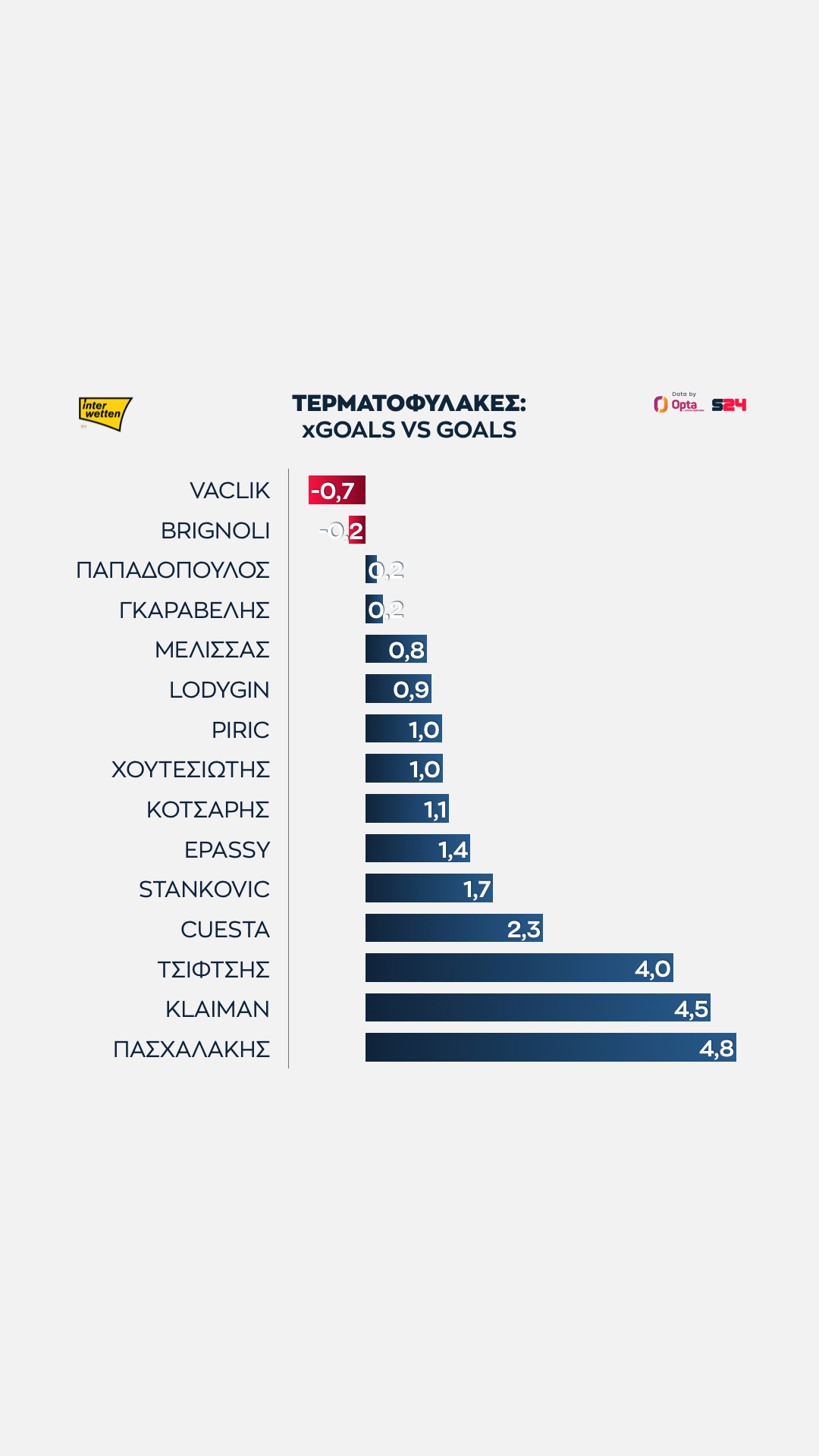 Τα περισσότερα όλων ο Πασχαλάκης, που πλησιάζει το να έχει φάει πέντε γκολ περισσότερα από τα προσδοκώμενα, Κλέιμαν και Τσιφτσής έχουν κι αυτοί δεχθεί τέσσερα γκολ περισσότερα απ'αυτά που θα έτρωγε ένας μέσος τερματοφύλακας.
