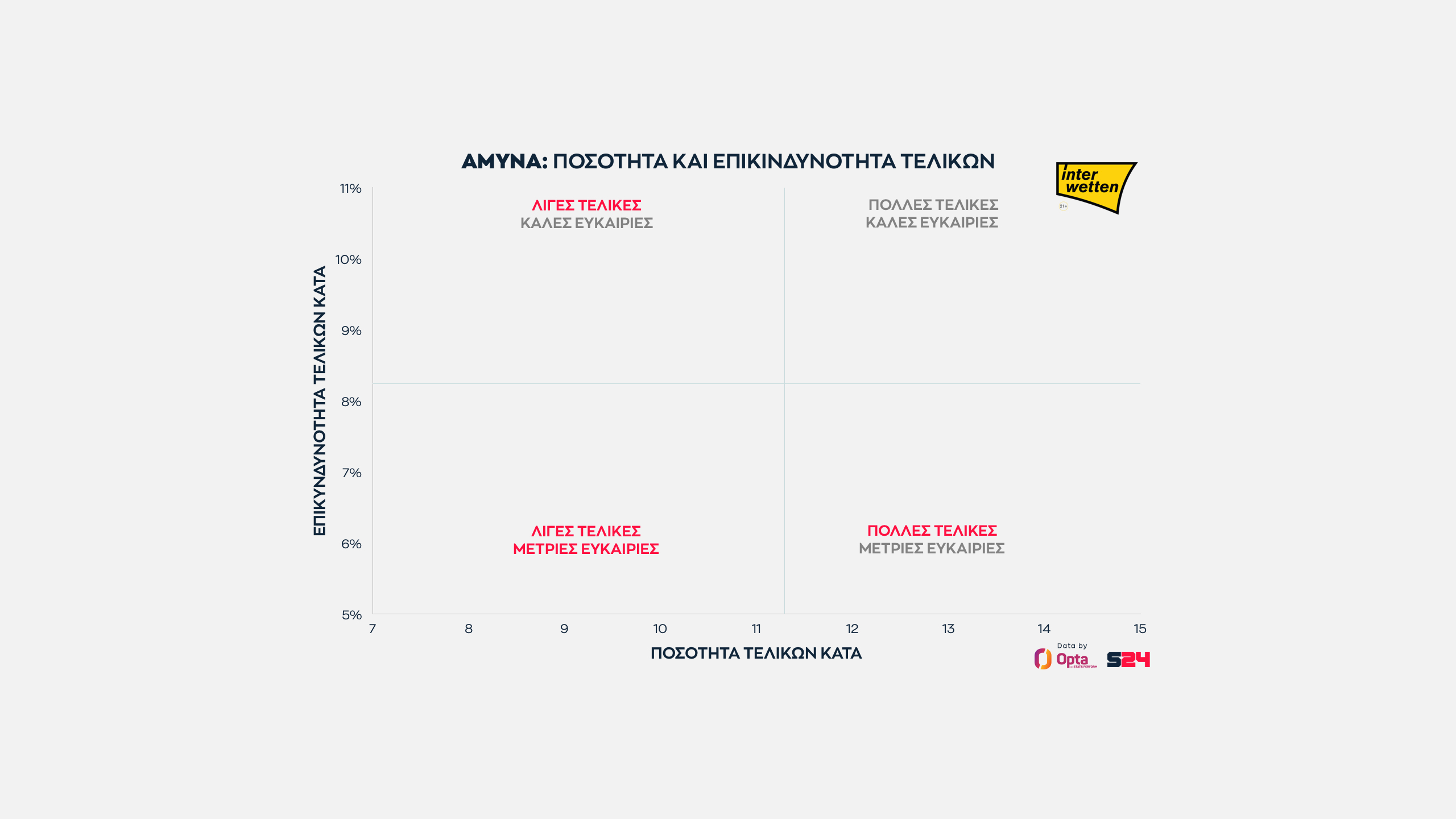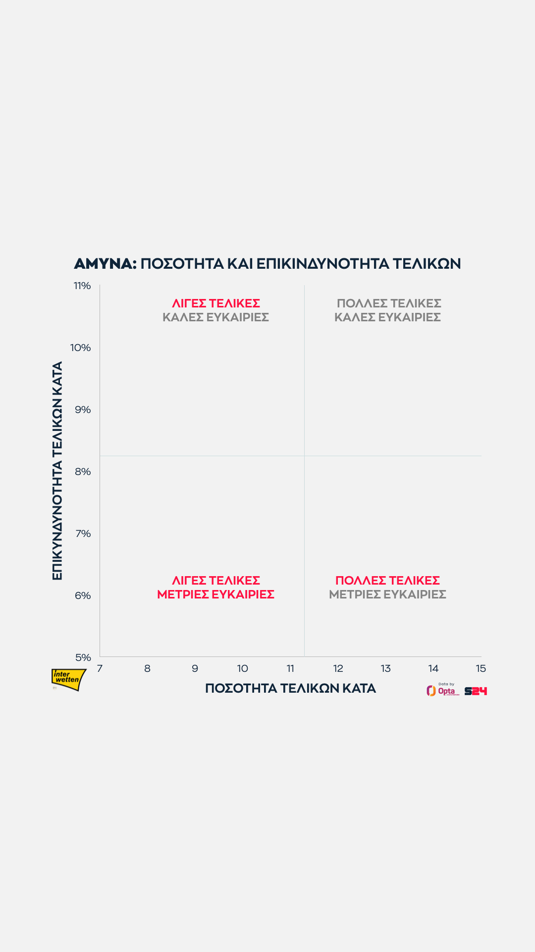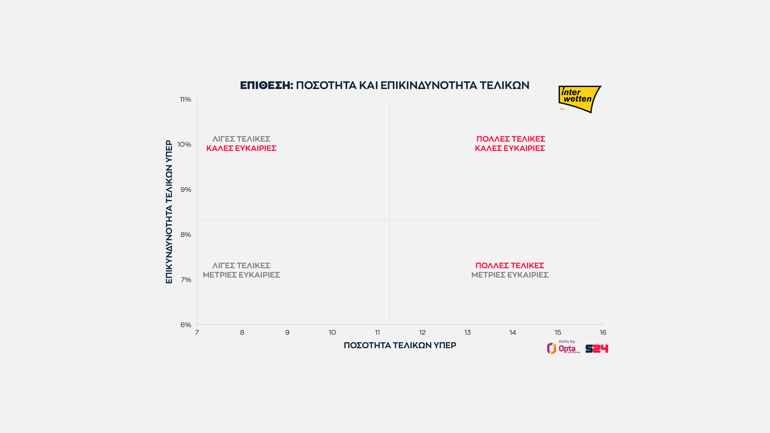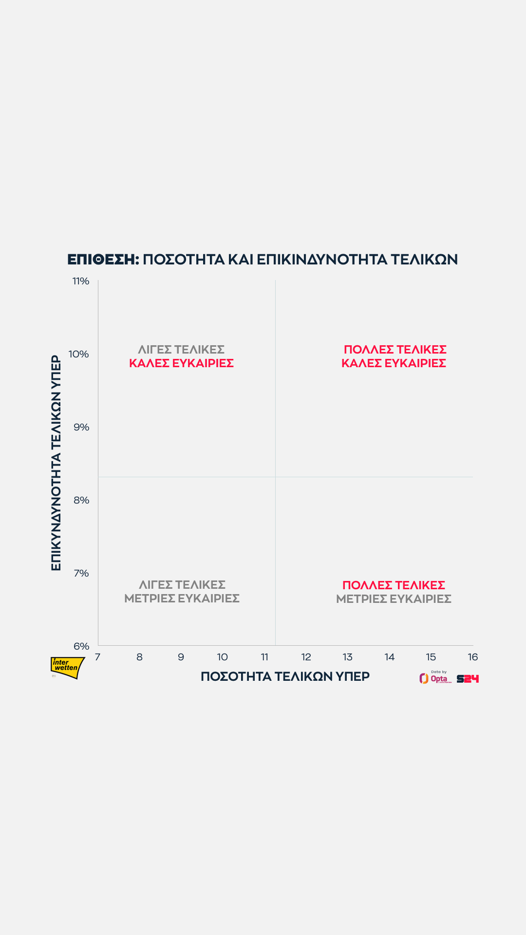 Όσο πιο δεξιά βρίσκεται μια ομάδα, τόσο περισσότερες τελικές κάνει και όσο πιο ψηλά βρίσκεται, τόσο πιο επικίνδυνη είναι κατά μέσο όρο κάθε τελική της.
