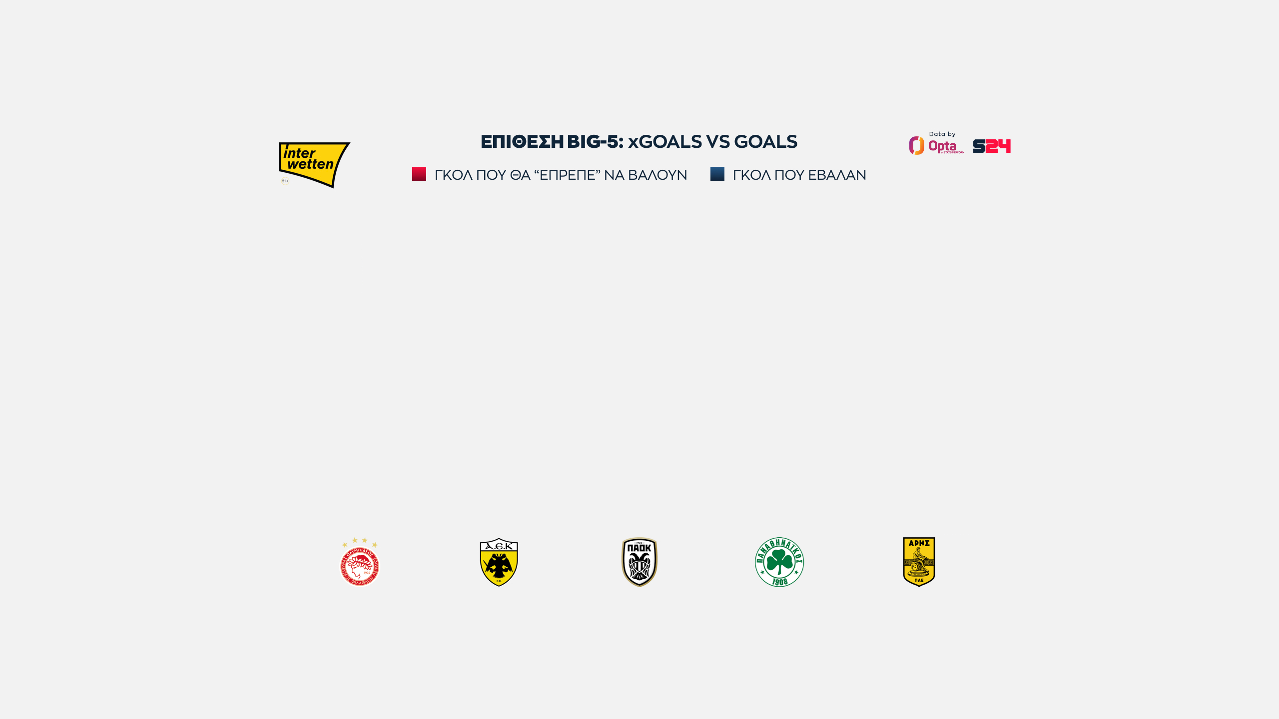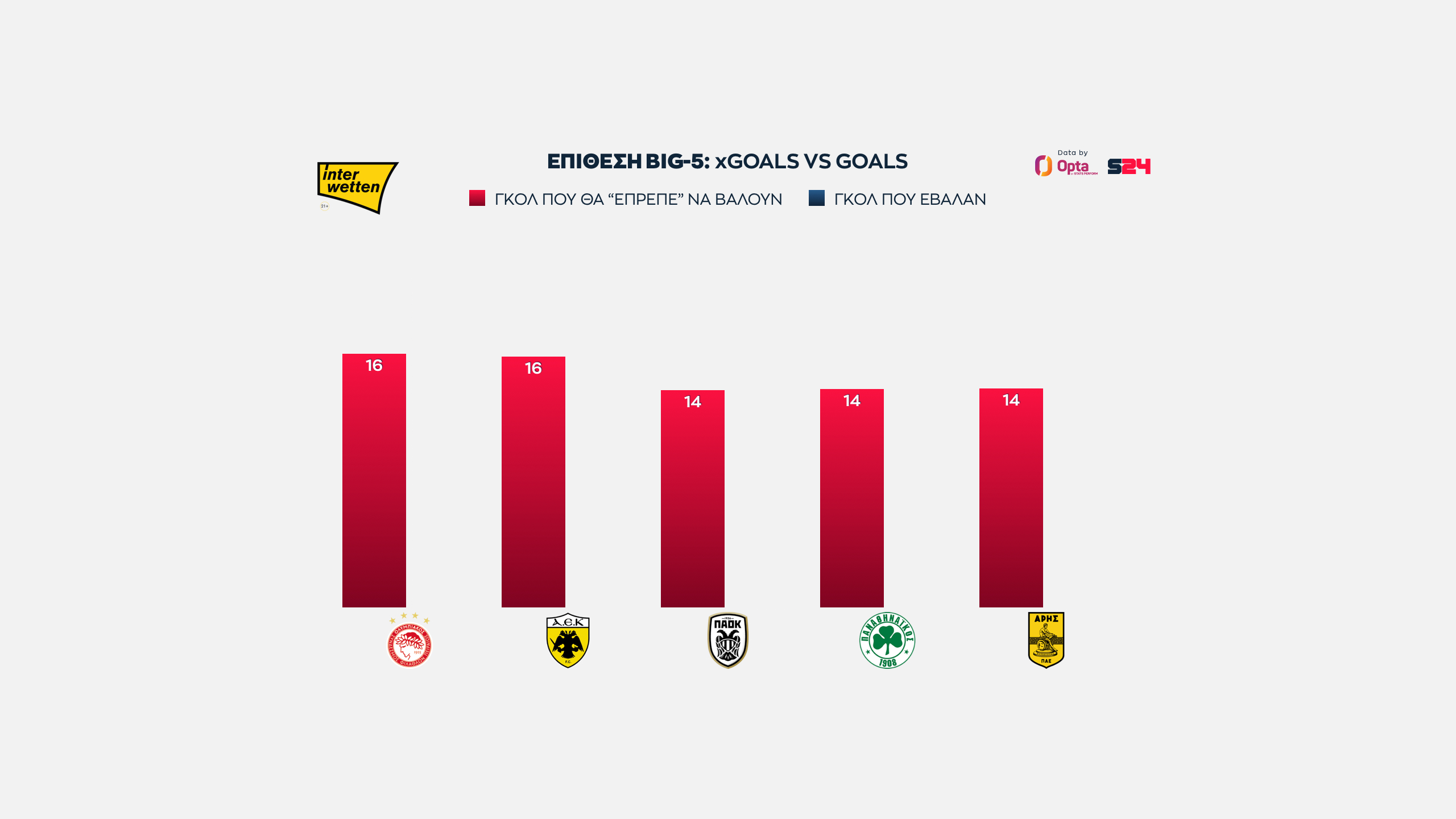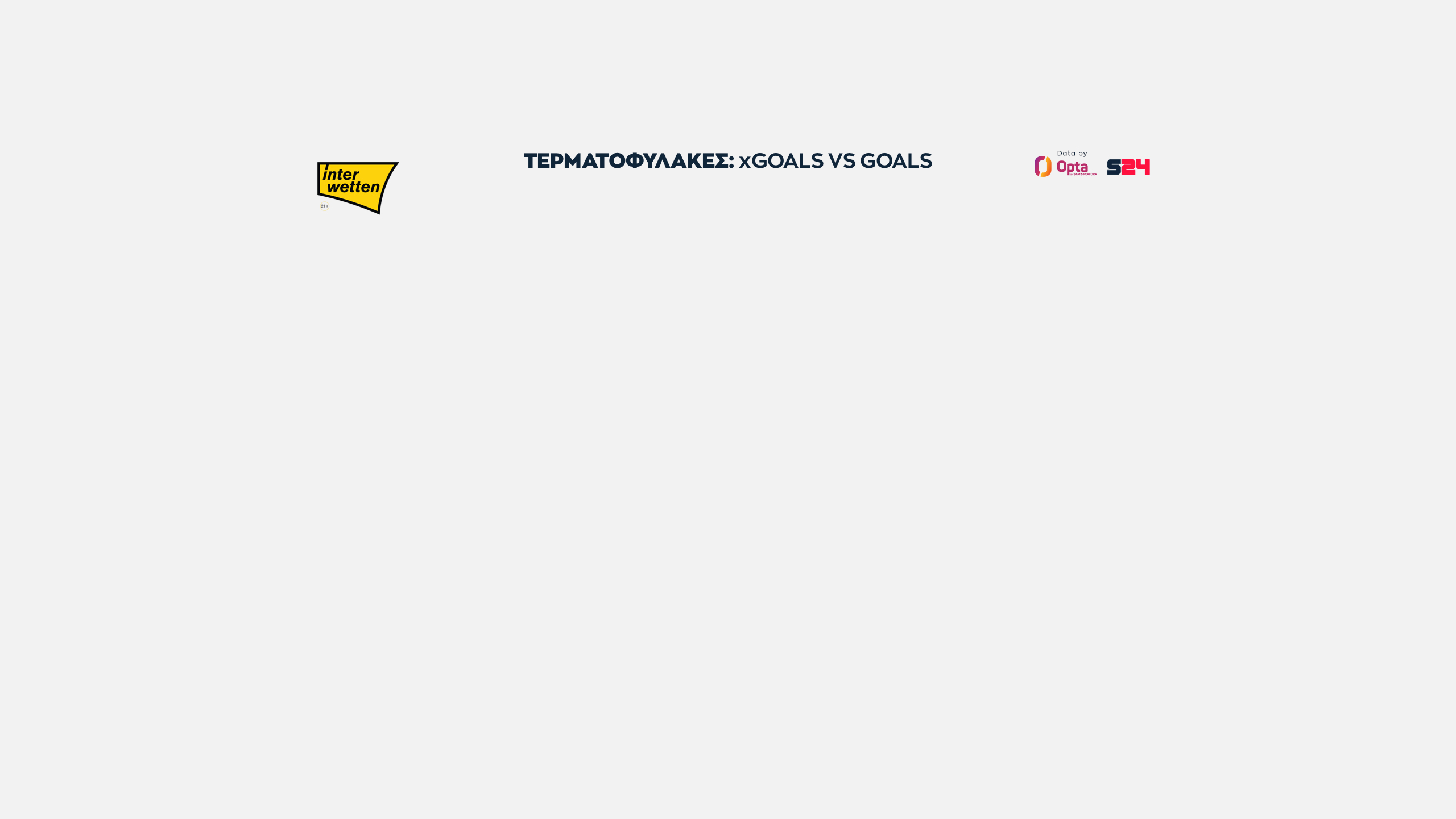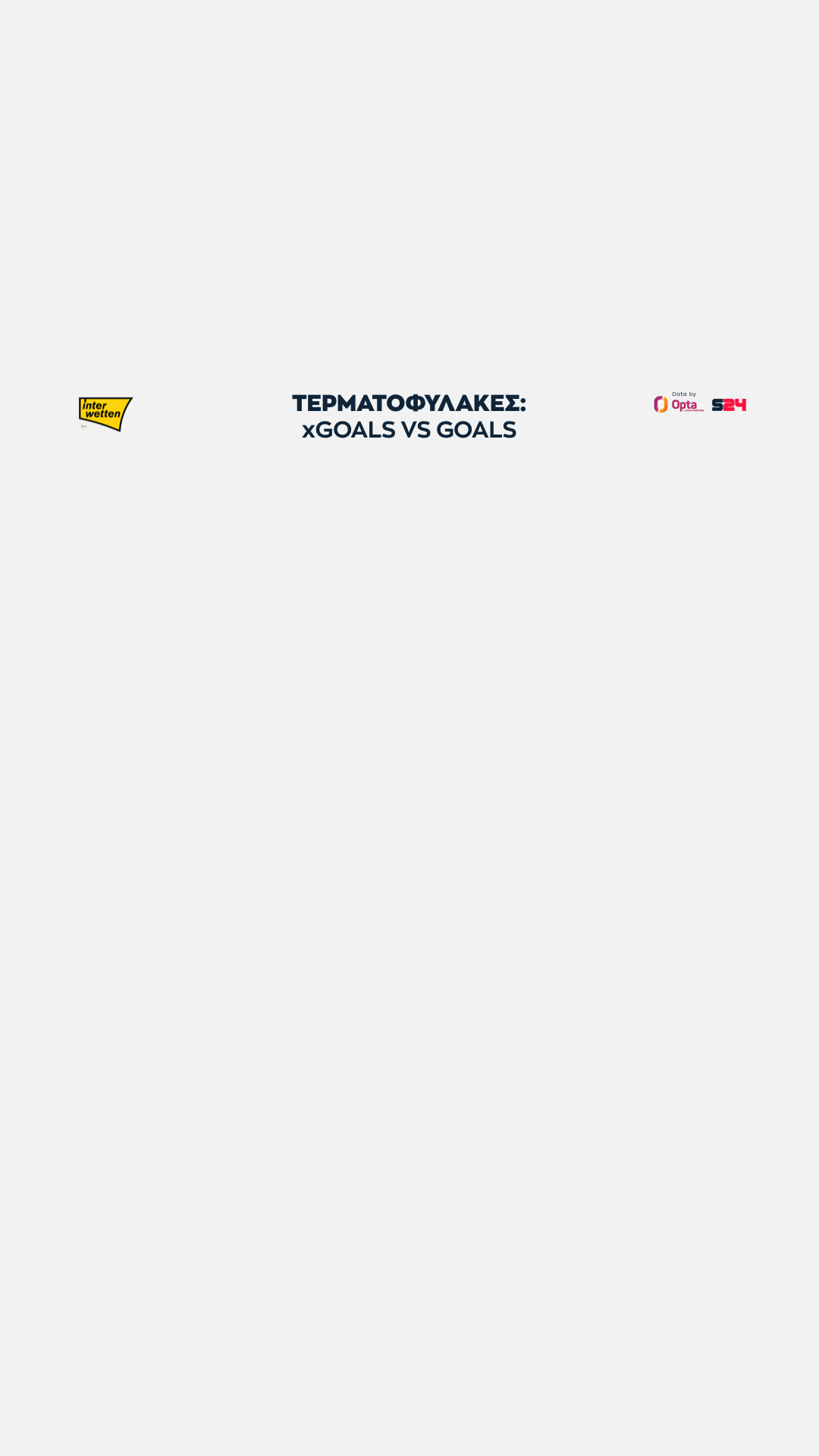 Ολυμπιακός και ΑΕΚ στα ίσια, με 16 xGoals, ενώ πιο κάτω στα 14 είναι "ευθυγραμμισμένοι" ΠΑΟΚ, Παναθηναϊκός και Άρης.