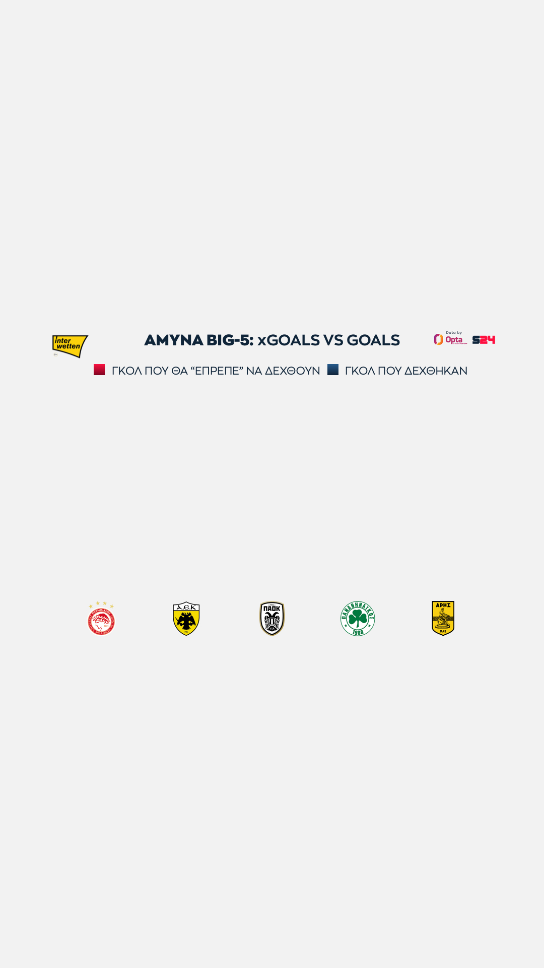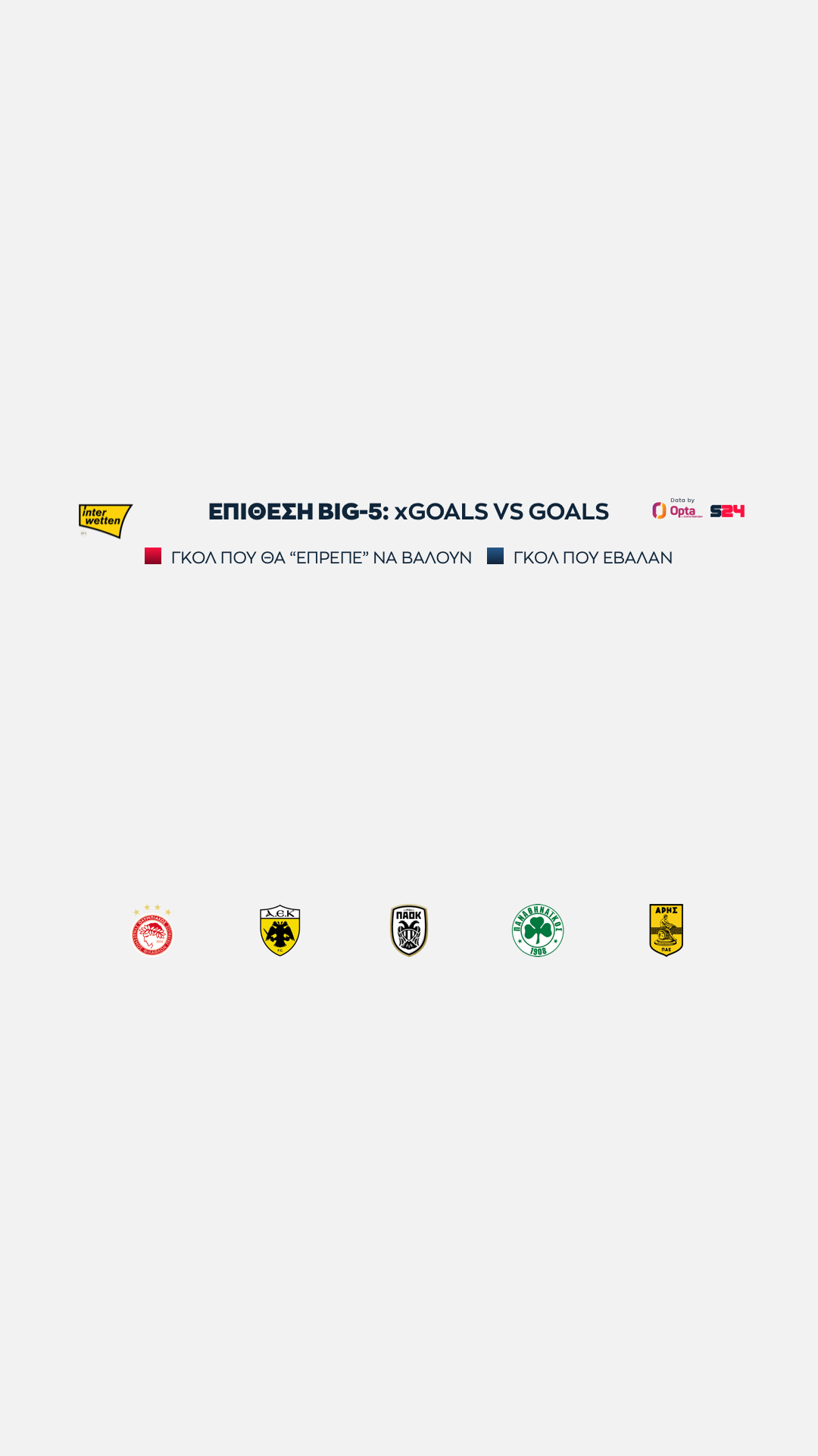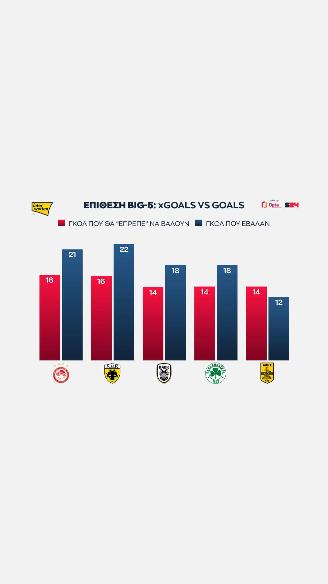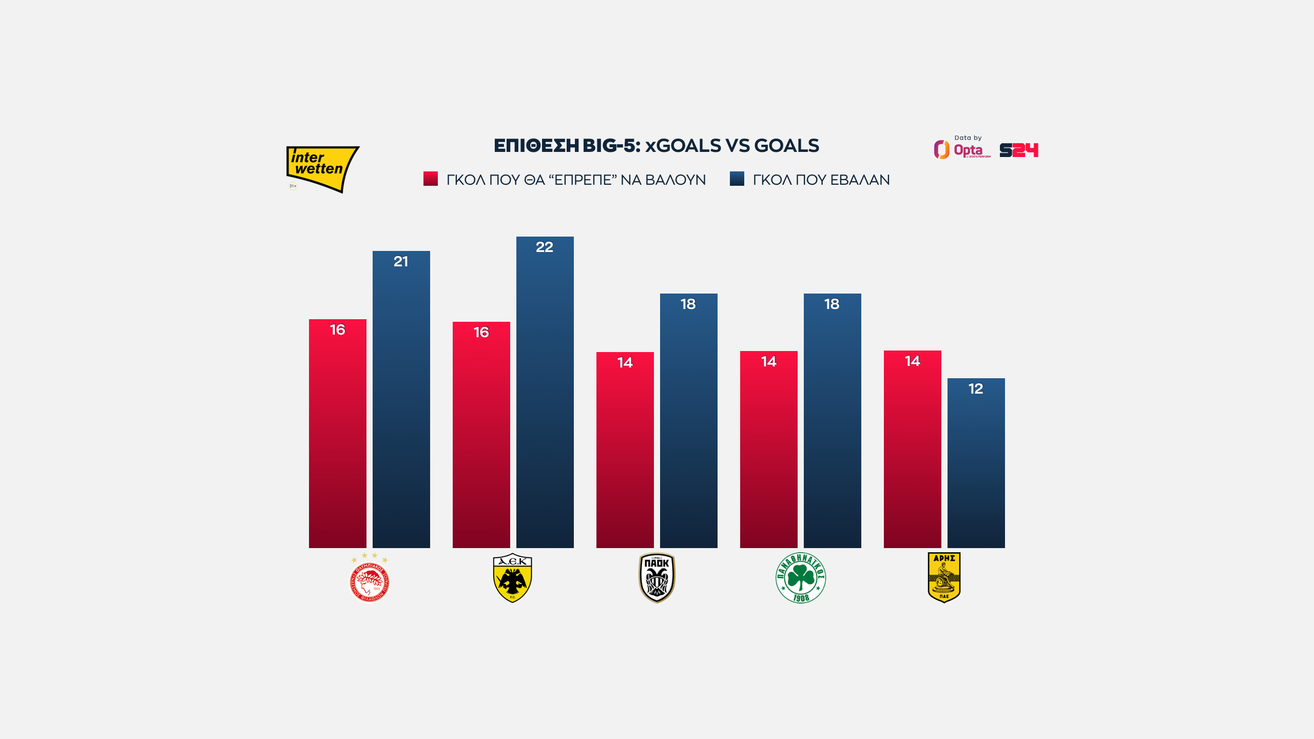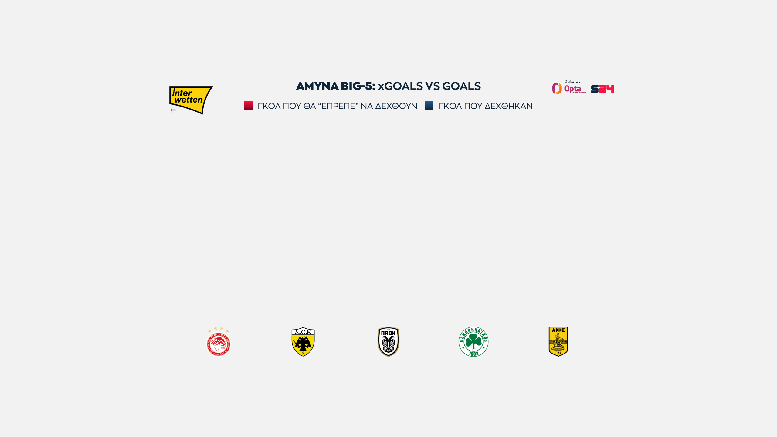 Ολυμπιακός και ΑΕΚ στα ίσια, με 16 xGoals, ενώ πιο κάτω στα 14 είναι "ευθυγραμμισμένοι" ΠΑΟΚ, Παναθηναϊκός και Άρης.