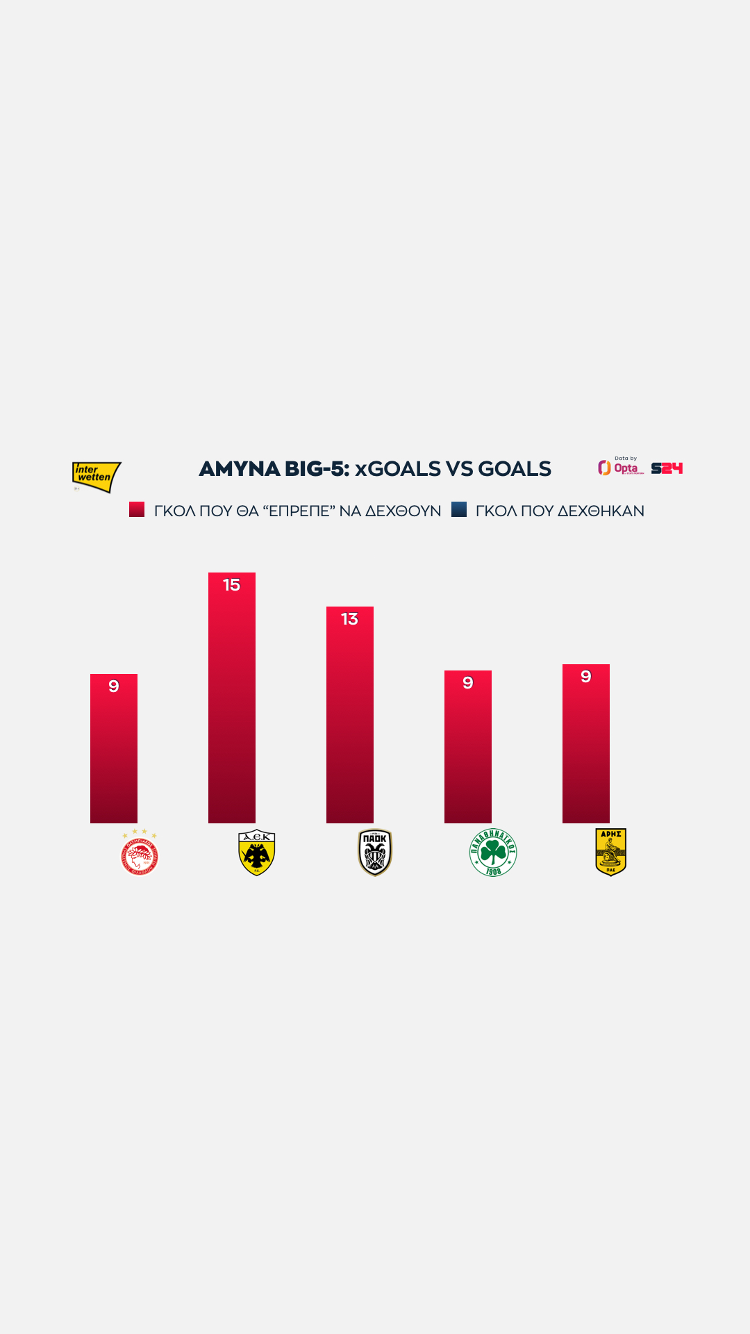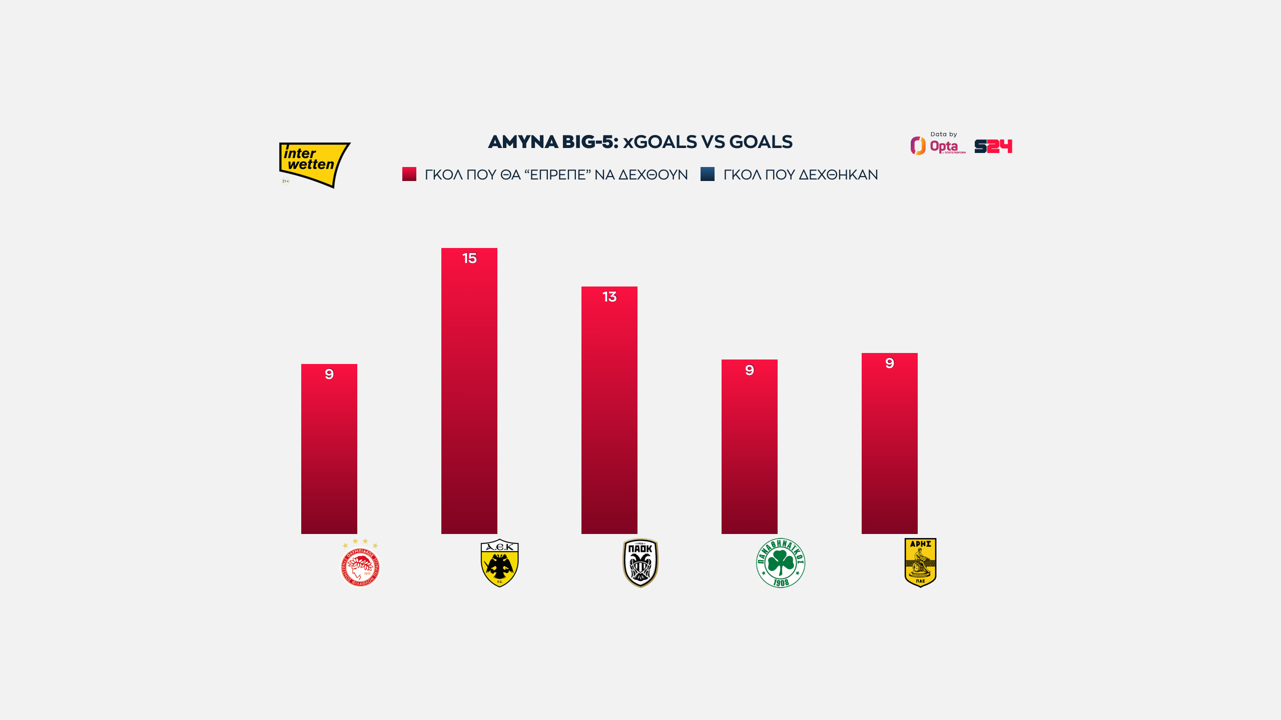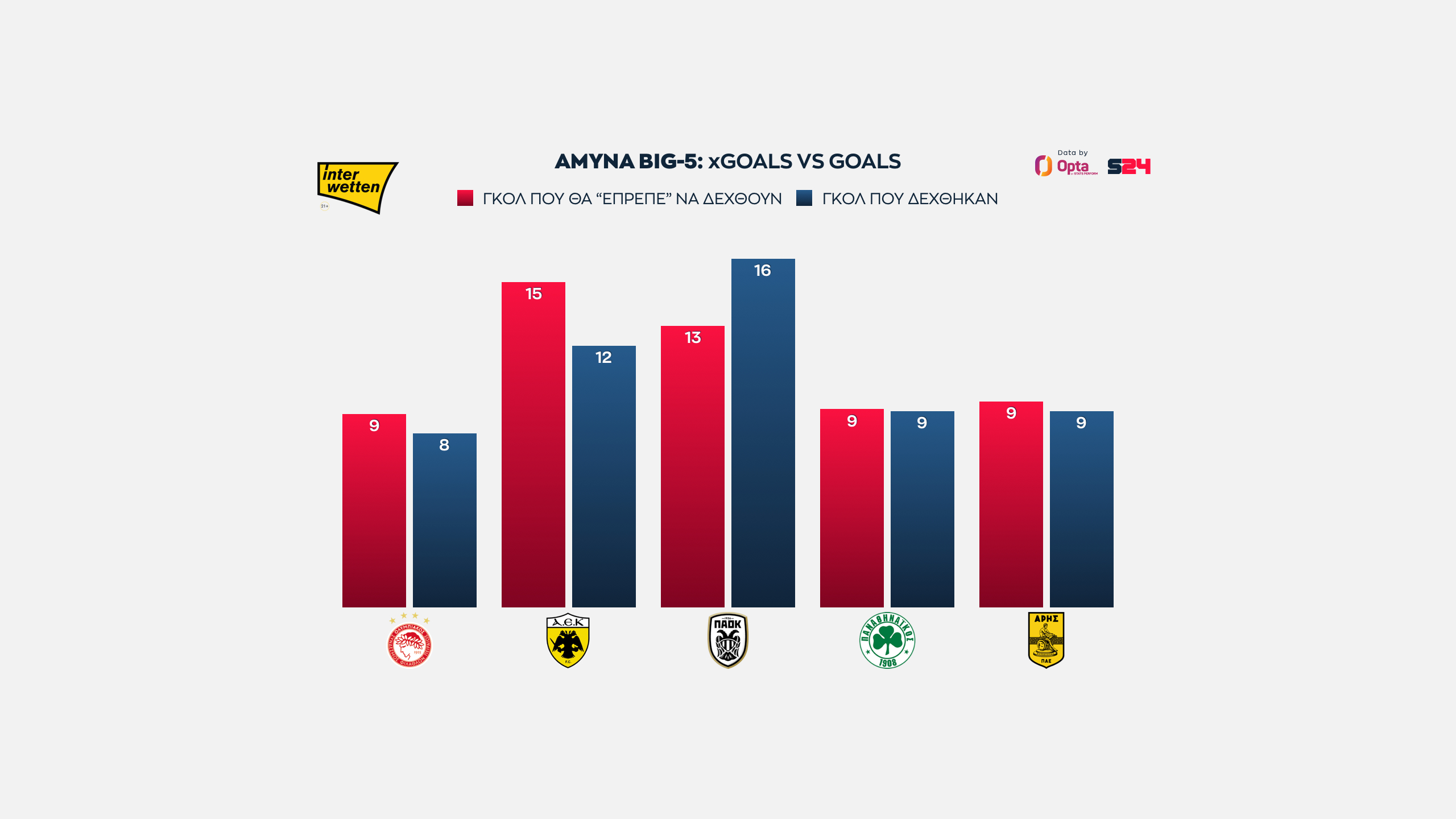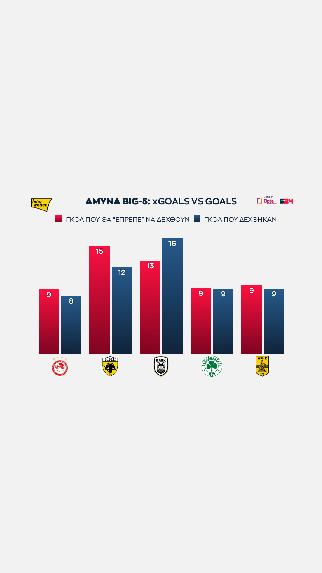 Ολυμπιακός και ΑΕΚ στα ίσια, με 16 xGoals, ενώ πιο κάτω στα 14 είναι "ευθυγραμμισμένοι" ΠΑΟΚ, Παναθηναϊκός και Άρης.