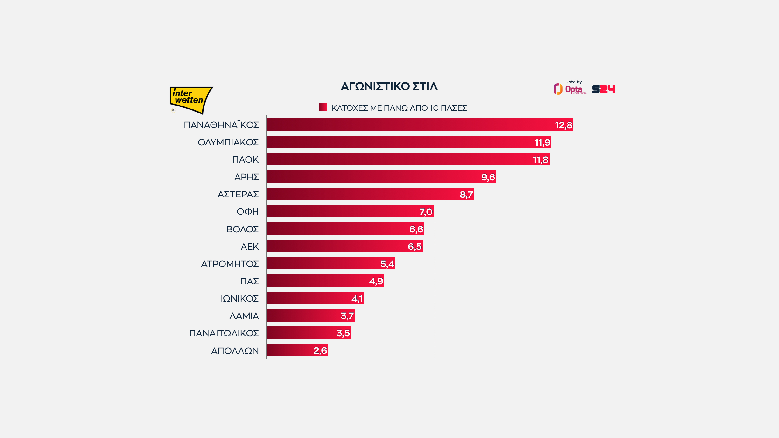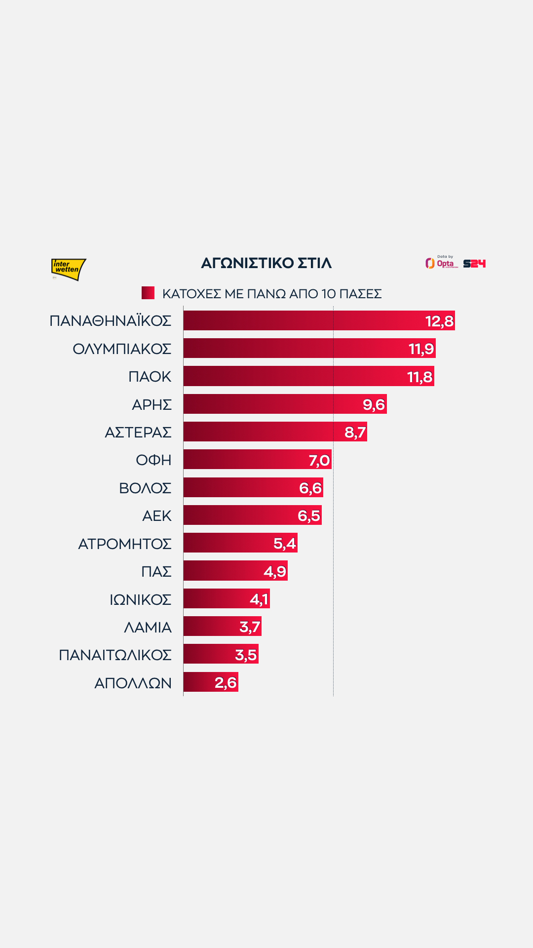 Πρώτος ο Παναθηναϊκός, με 12.8 τέτοιες κατοχές ανά αγώνα. Ακολουθούν Ολυμπιακός και ΠΑΟΚ, αυτοί συμπληρώνουν την τριάδα των ομάδων που έχουν διψήφιο αριθμό κατοχών με 10+ πάσες.