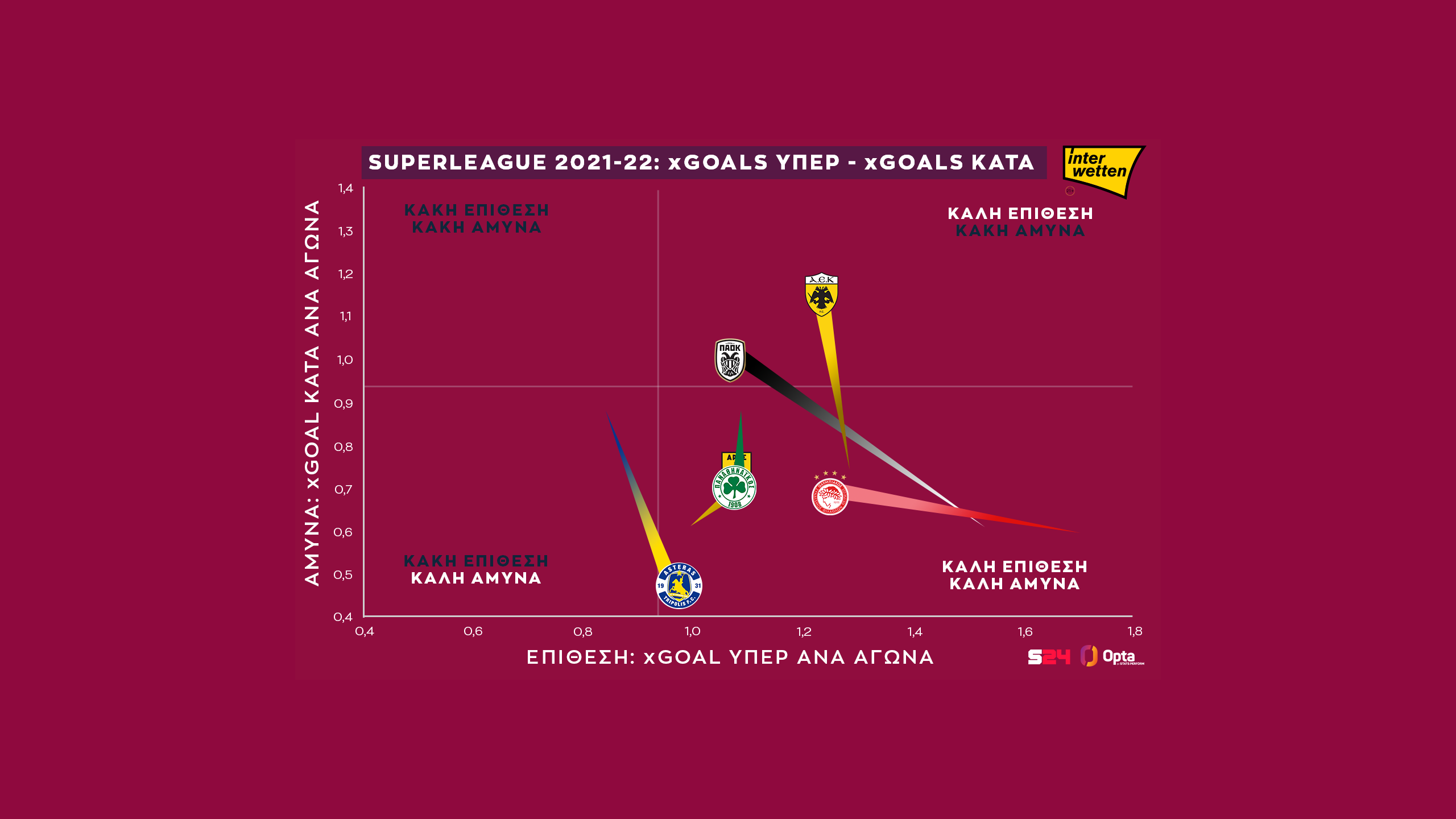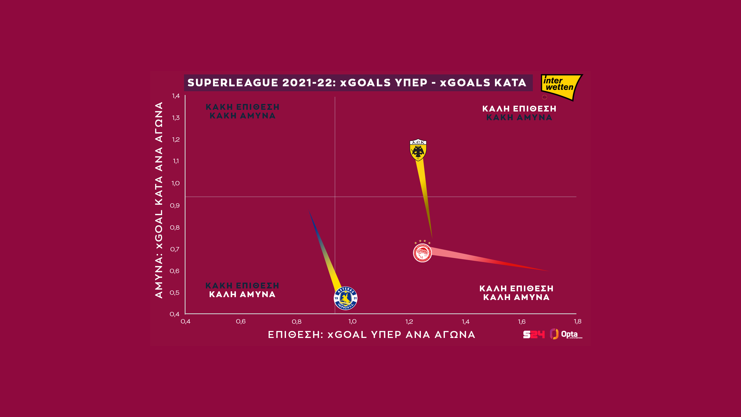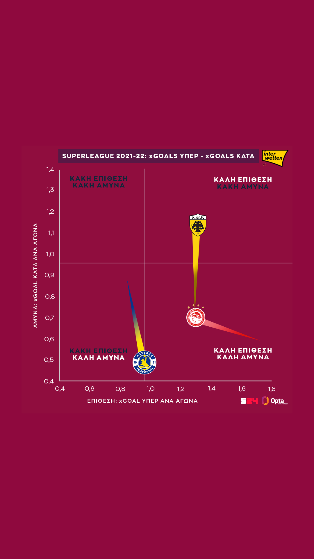 Ο Αστέρας από την άλλη είναι η ομάδα με τη μεγαλύτερη βελτίωση σε όλα: άλμα προς τα δεξιά και προς τα κάτω, έχει την καλύτερη αμυντική λειτουργία του 1ου γύρου και είναι πολύ πιο επιθετικός σε σχέση με πέρυσι.