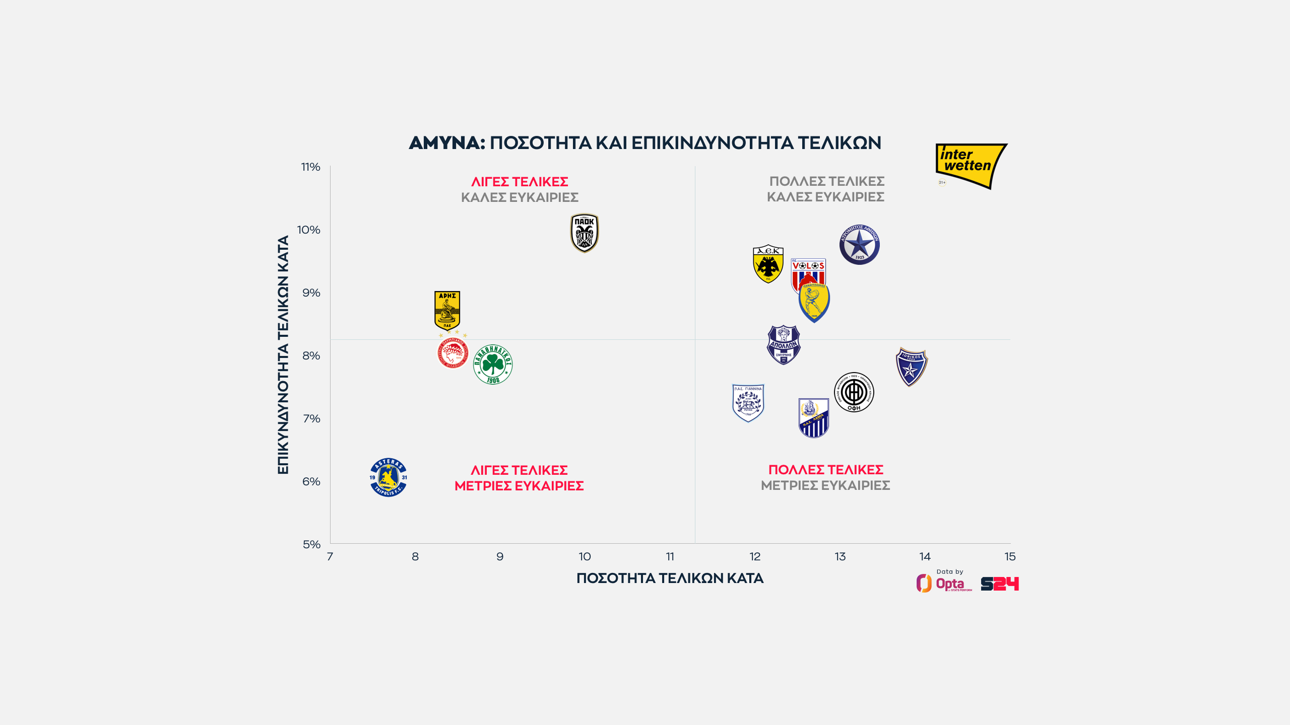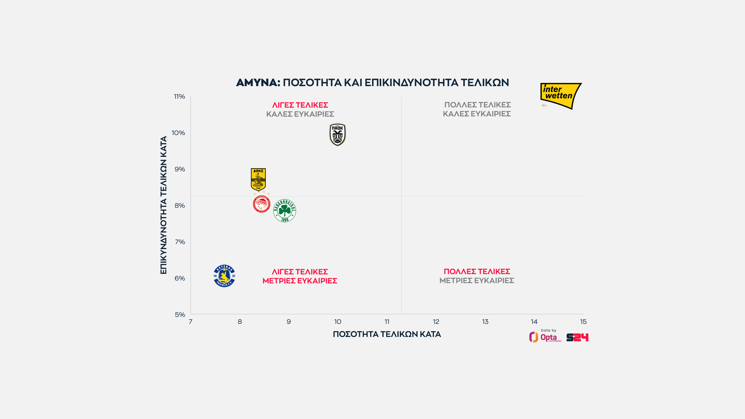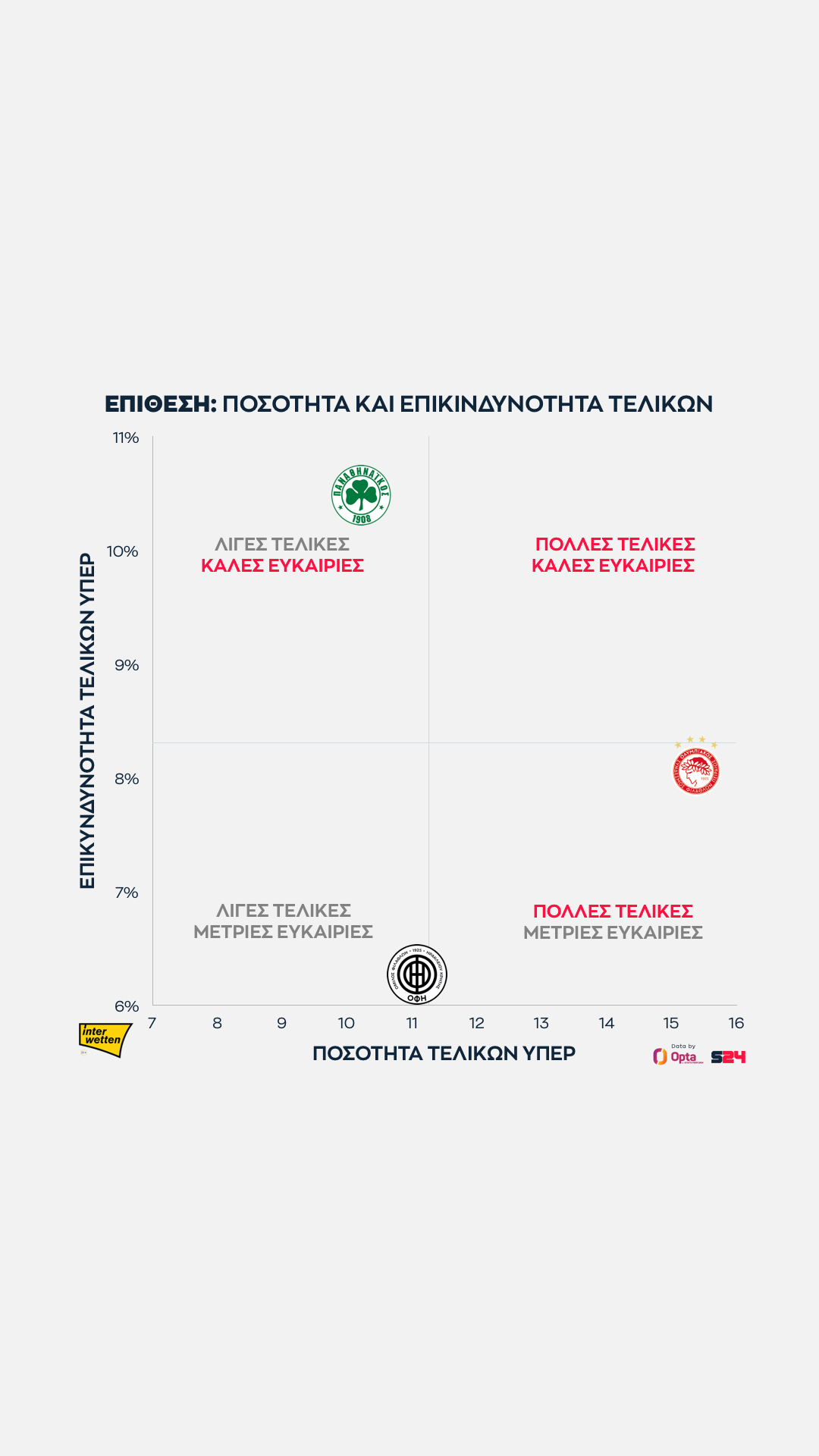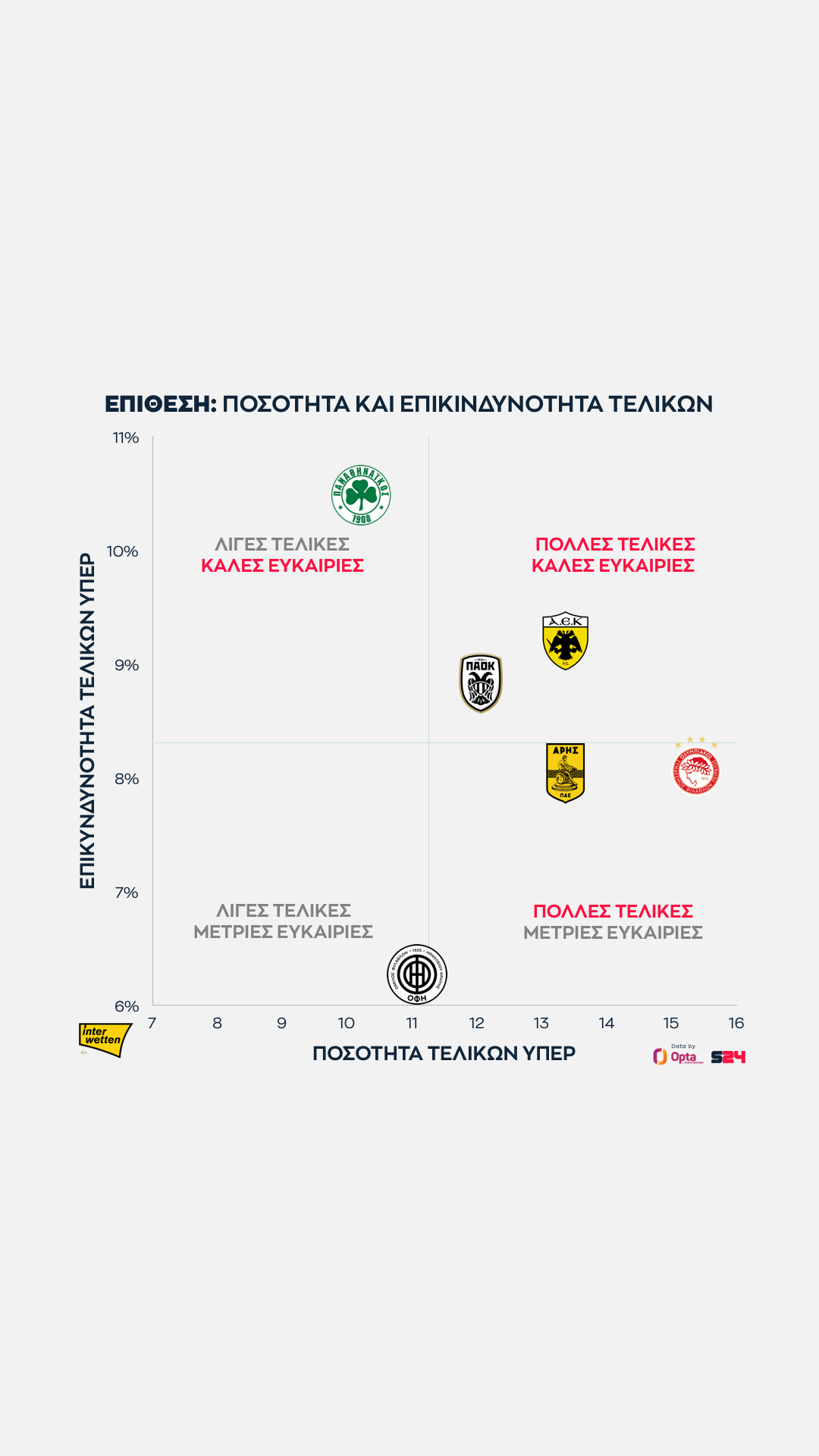 Ο Παναθηναϊκός από την άλλη κάνει κατά μέσο όρο τις πιο επικίνδυνες τελικές του πρωταθλήματος, αλλά αυτές είναι λίγες.