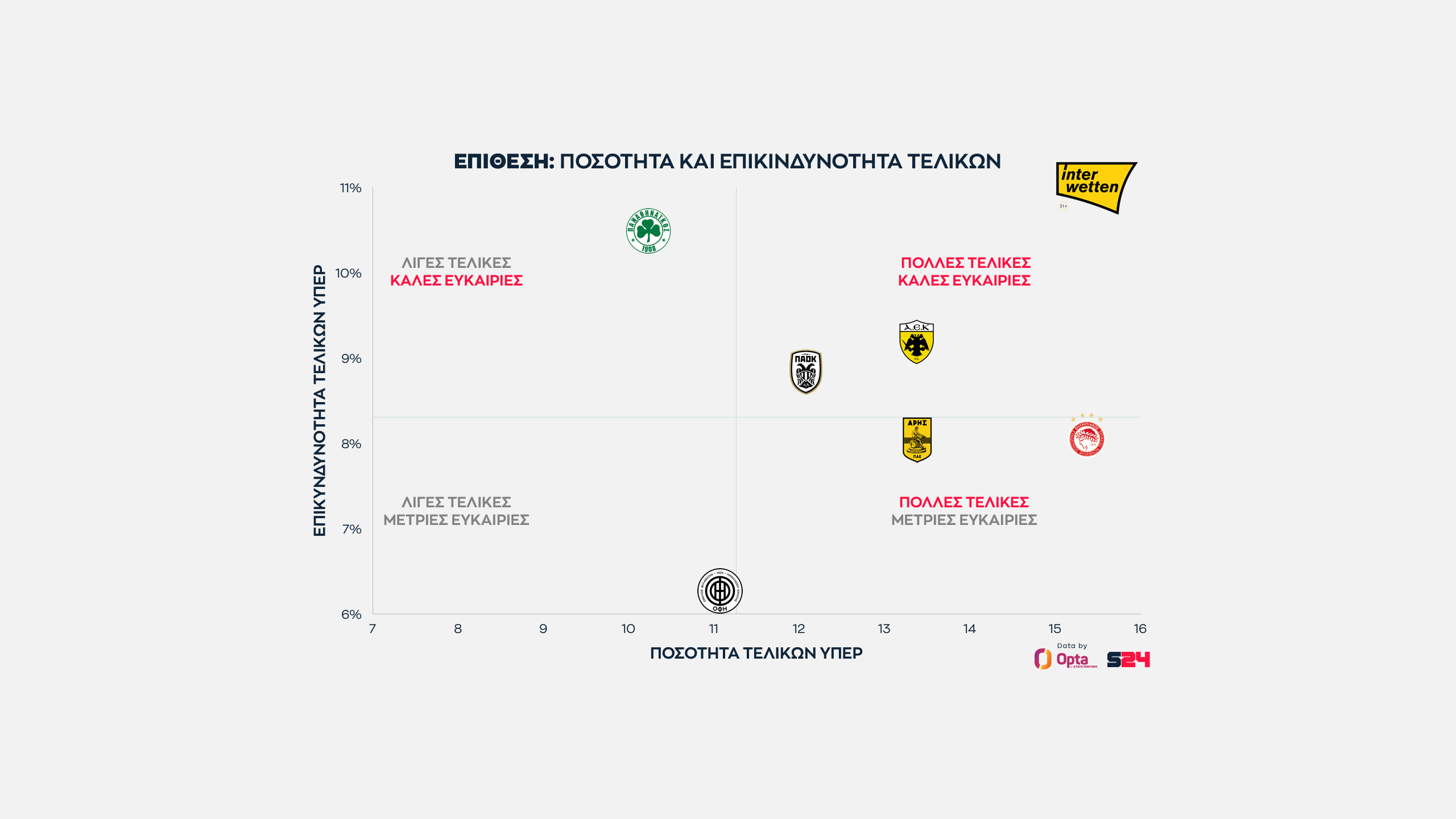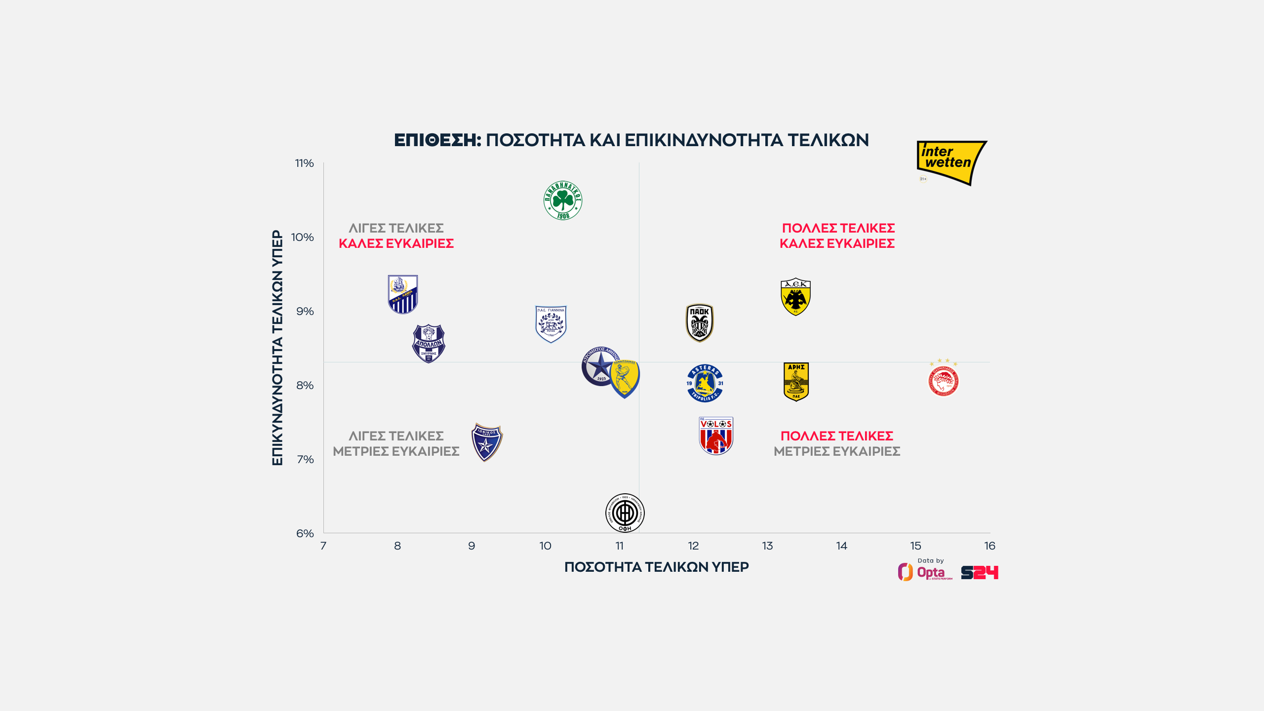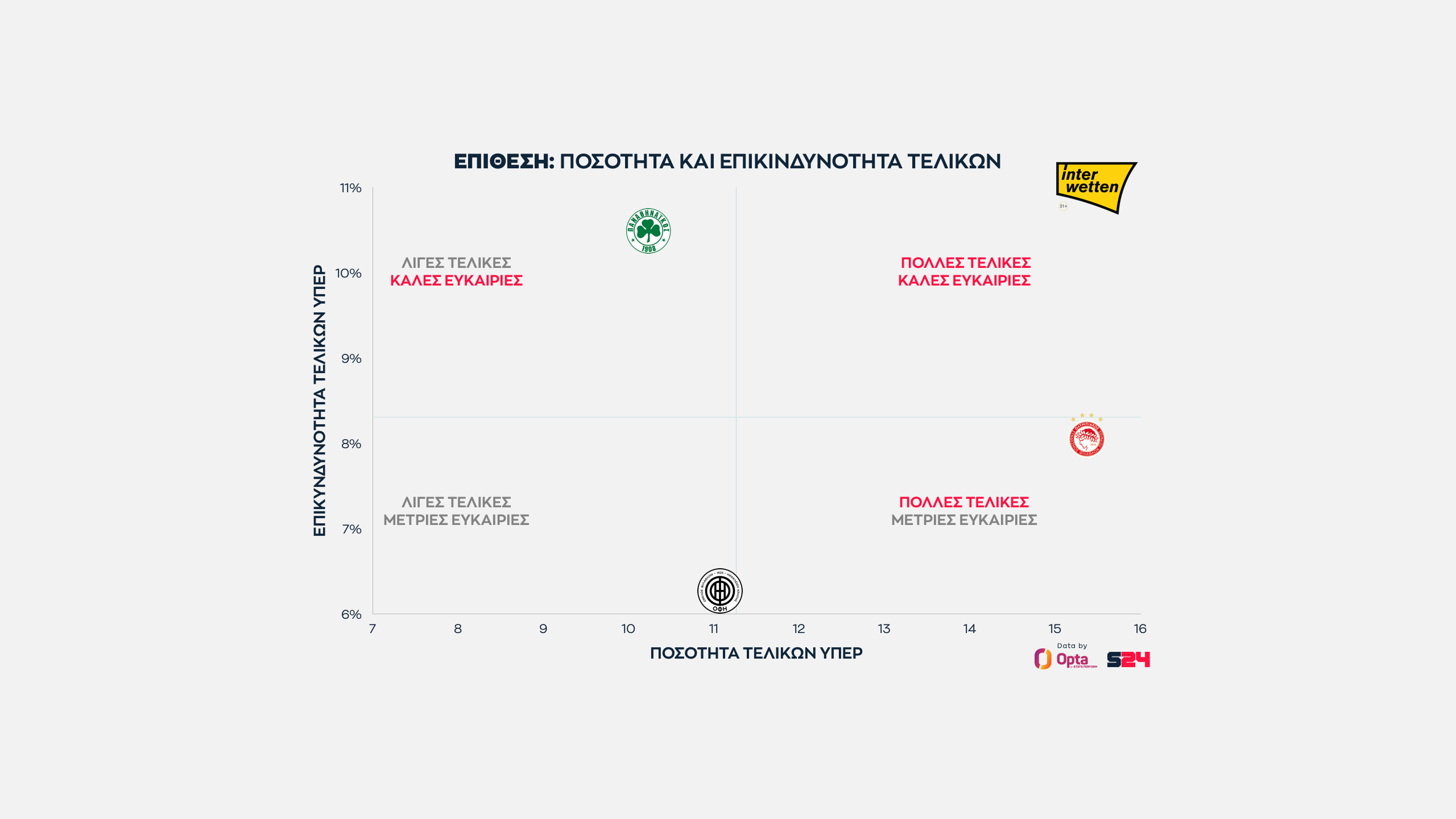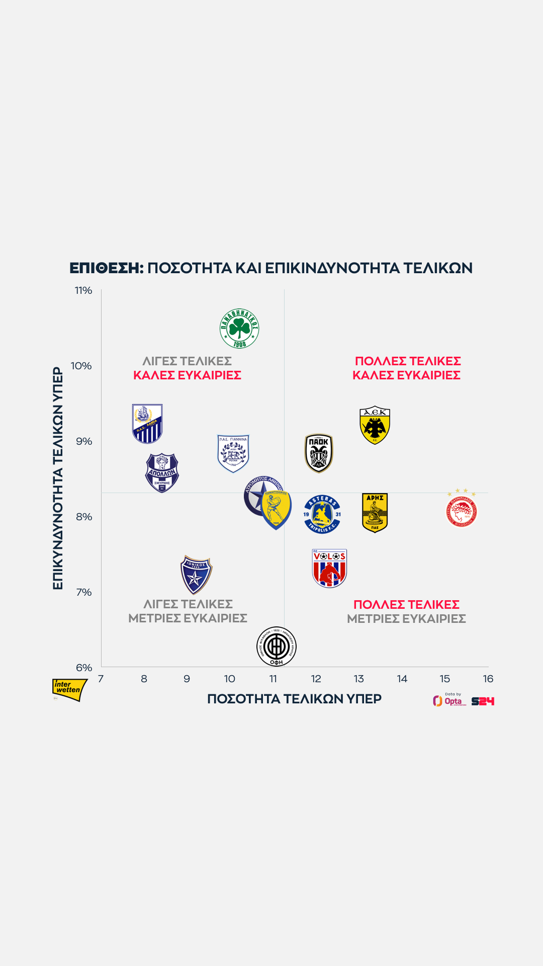 Ο Παναθηναϊκός από την άλλη κάνει κατά μέσο όρο τις πιο επικίνδυνες τελικές του πρωταθλήματος, αλλά αυτές είναι λίγες.