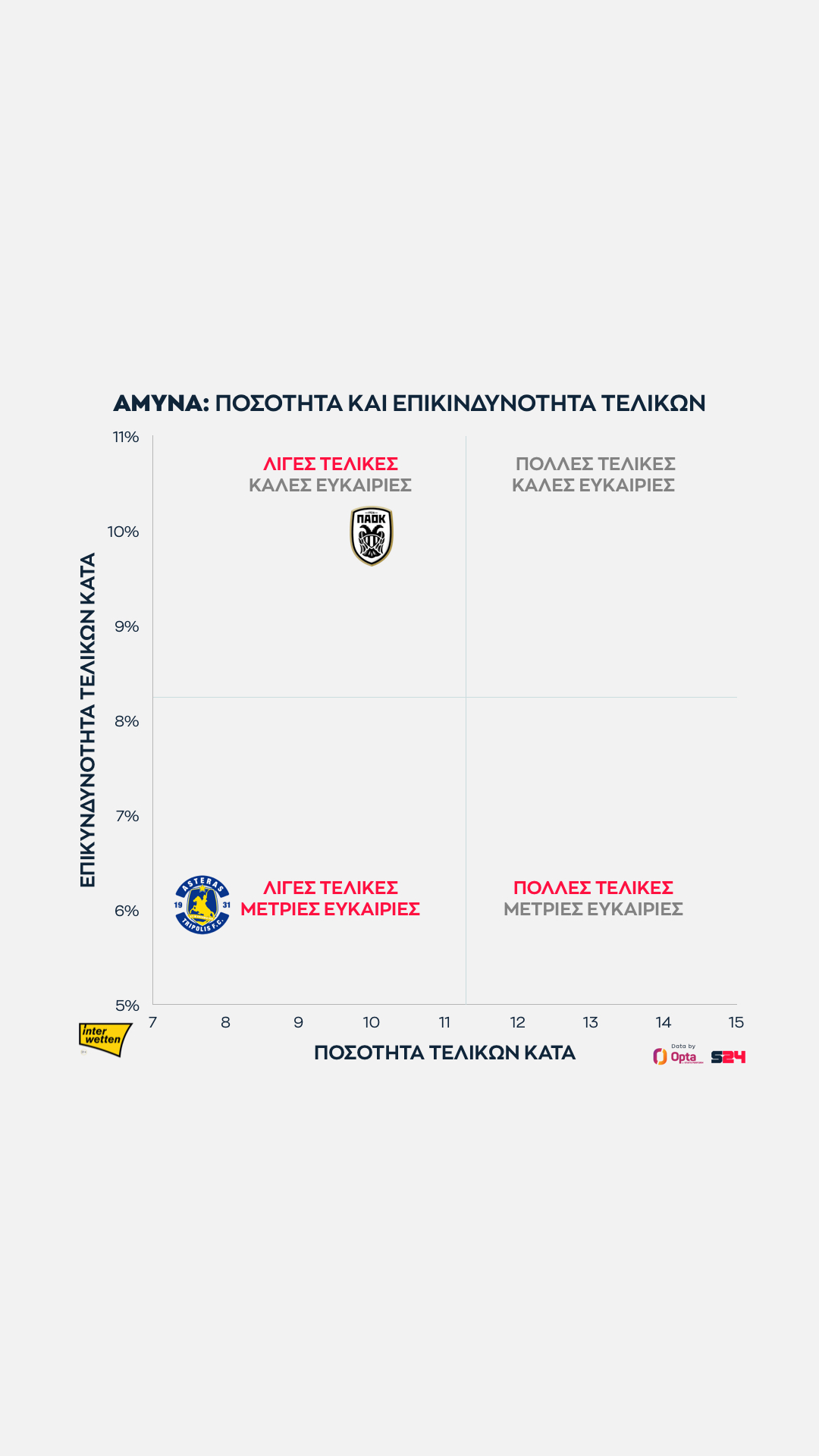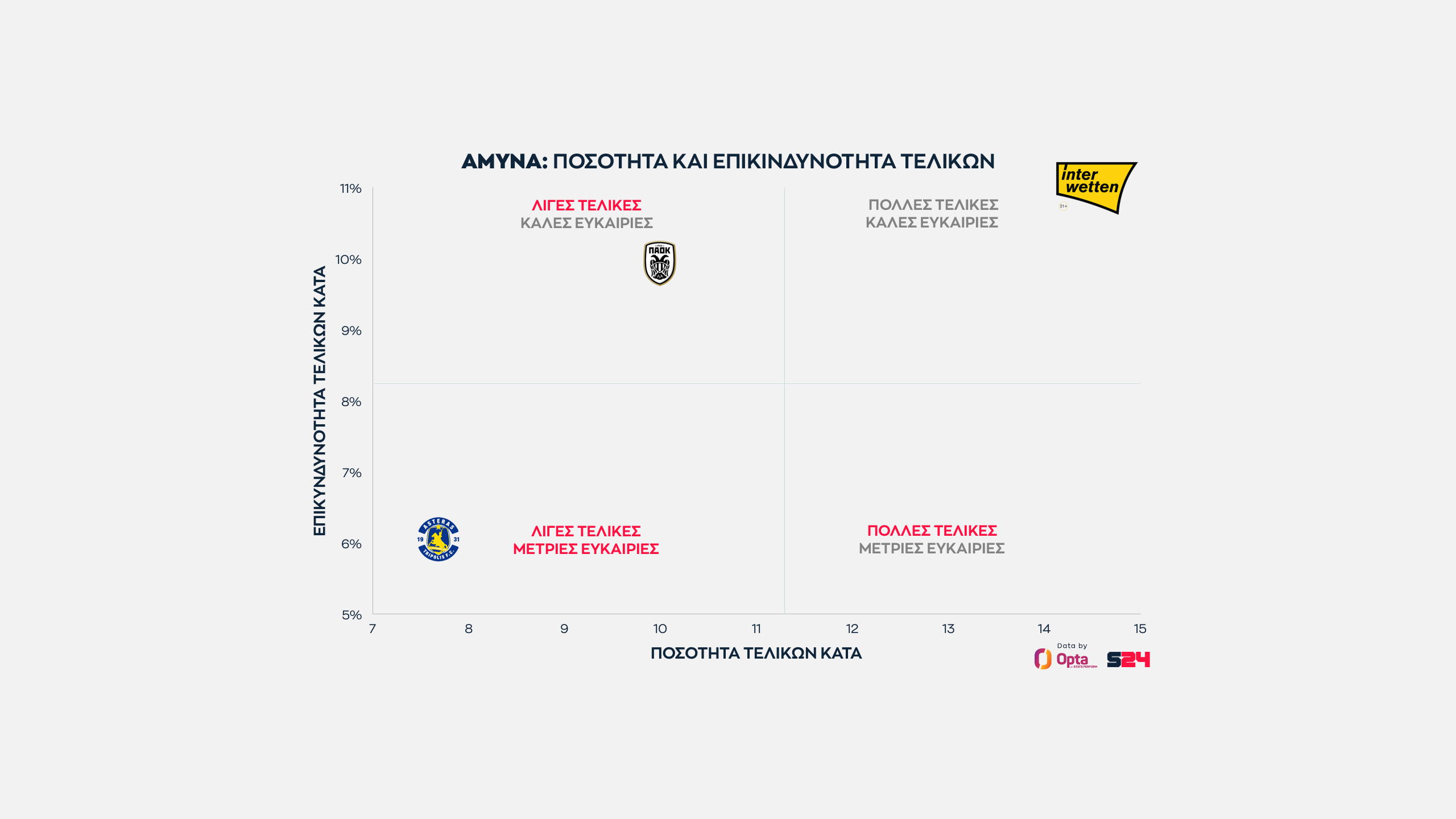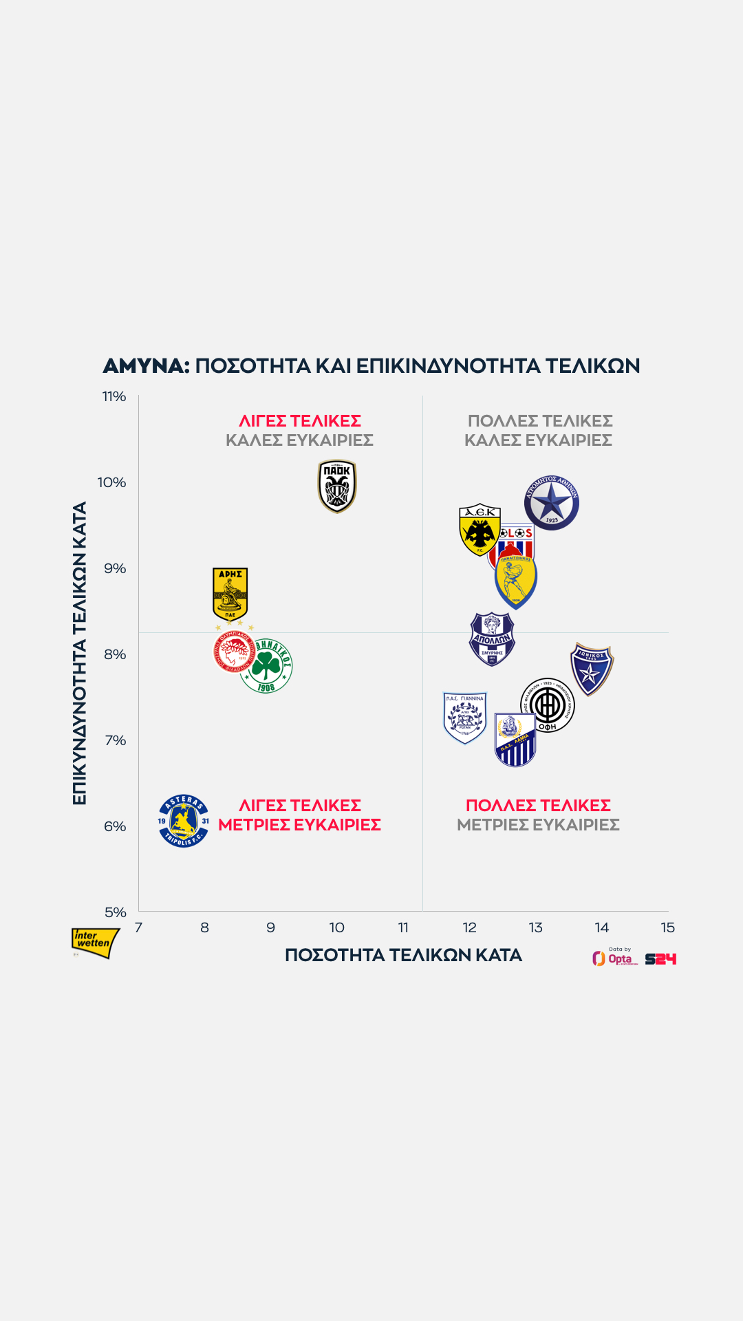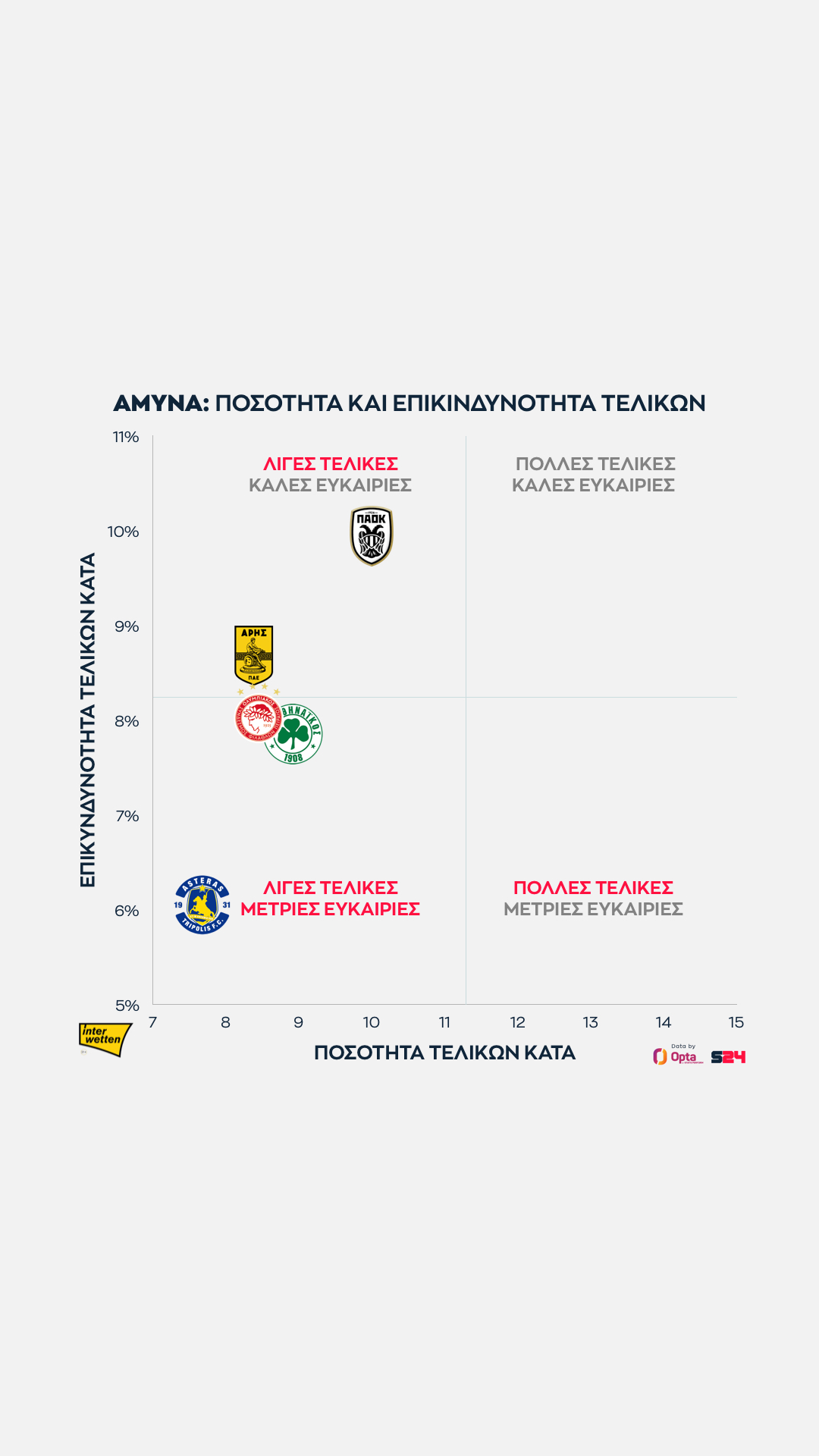 Ο Παναθηναϊκός από την άλλη κάνει κατά μέσο όρο τις πιο επικίνδυνες τελικές του πρωταθλήματος, αλλά αυτές είναι λίγες.