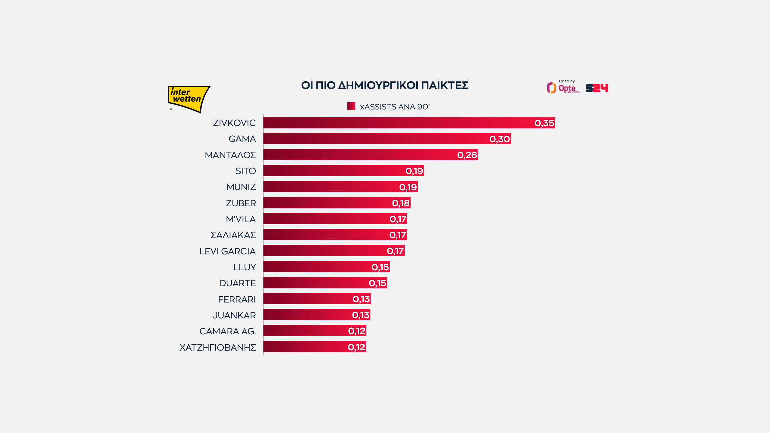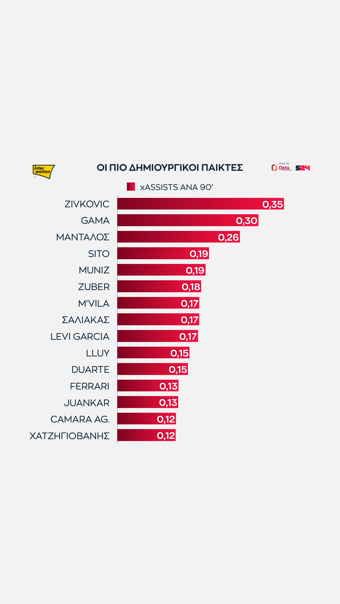 Ο Γκάμα έχει βοηθηθεί από τη μεγαλύτερη διάθεση του Άρη για επίθεση και ο Μάνταλος συμπληρώνει την τριάδα των παικτών που ξεπερνούν το 0.20 στις xAssists.