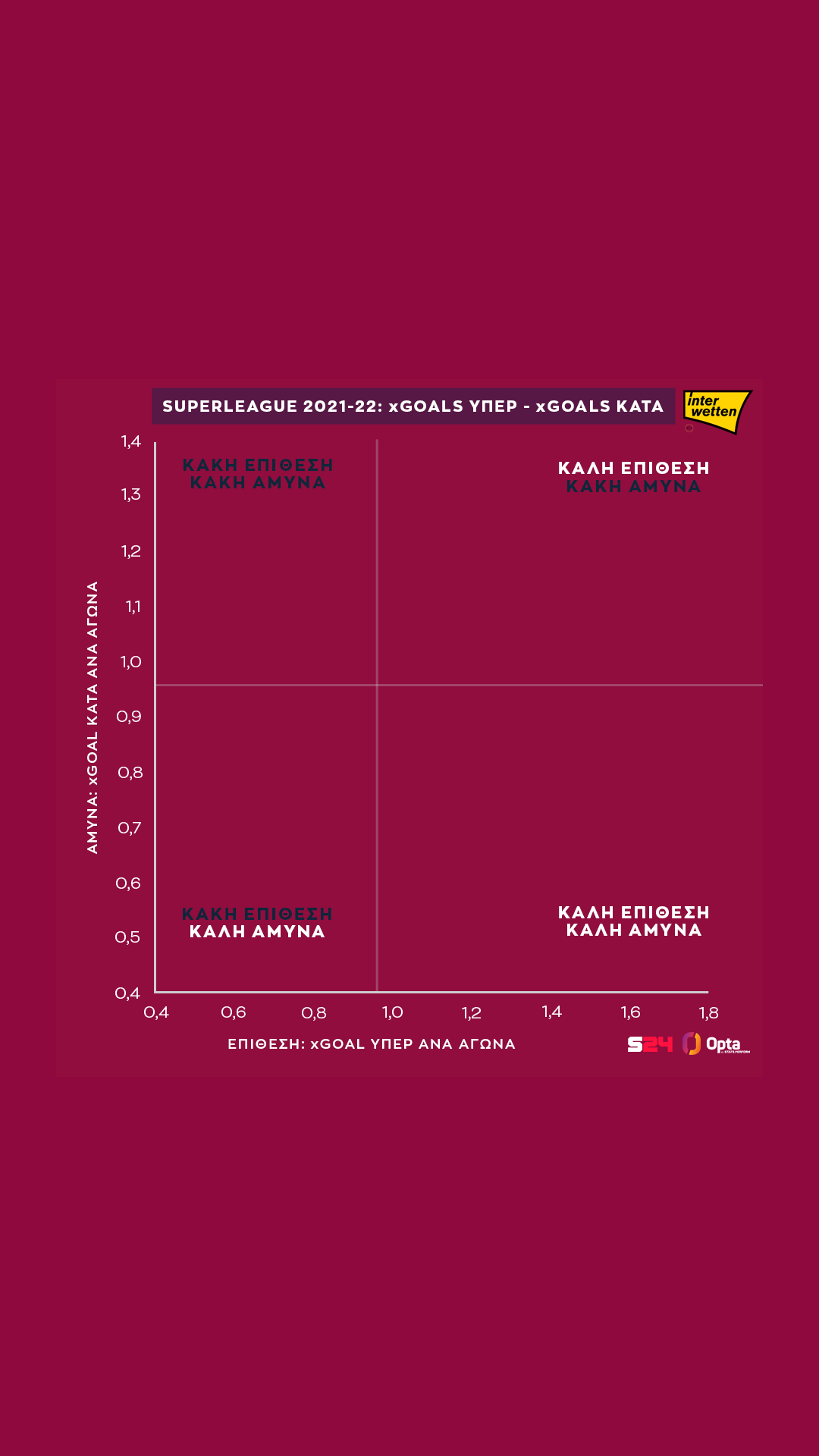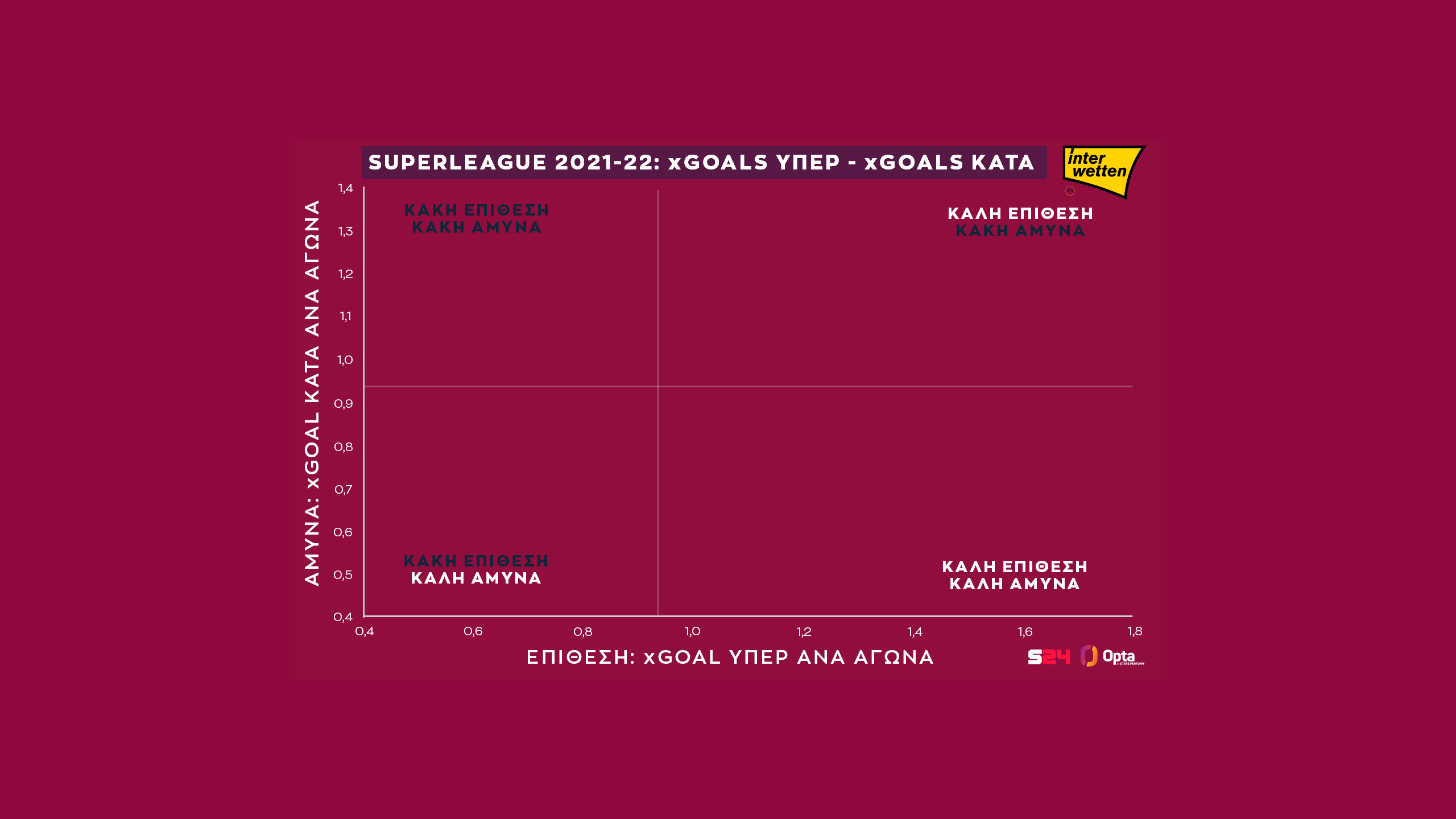 Σ'αυτήν την εικόνα θα τα δούμε όλα. Στον οριζόντιο άξονα είναι η επίθεση, τα xGoals υπέρ, και στον κάθετο η άμυνα, τα xGoals κατά.