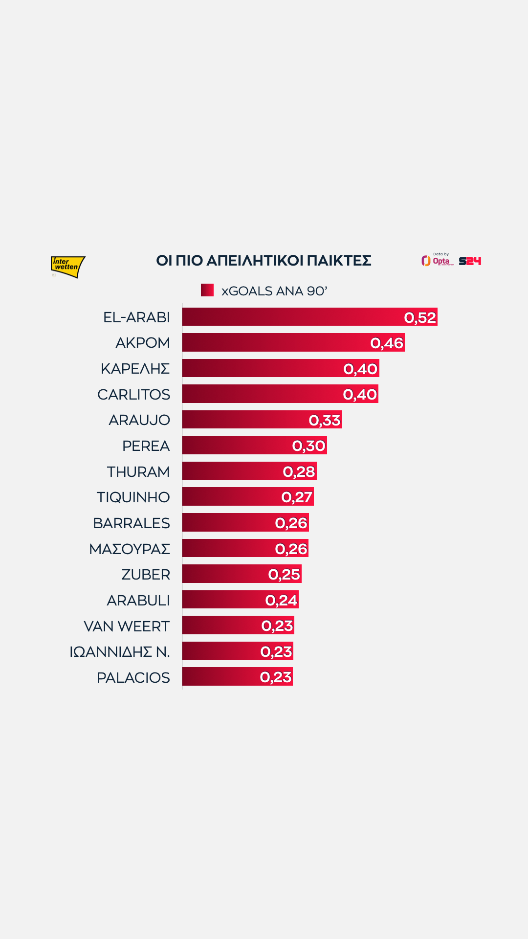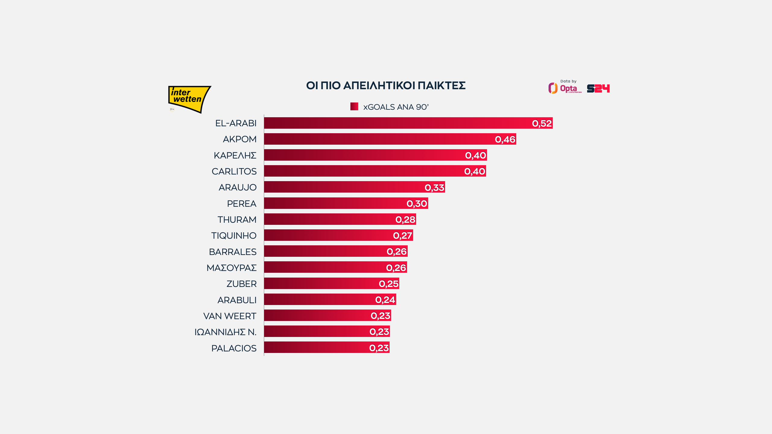 Βασιλιάς ξανά ο Ελ Αραμπί. Ο Μαροκινός του Ολυμπιακού είναι και φέτος ο πιο απειλητικός παίκτης του πρωταθλήματος, παρά την πτώση από το 0.65 xG που είχε πέρυσι.