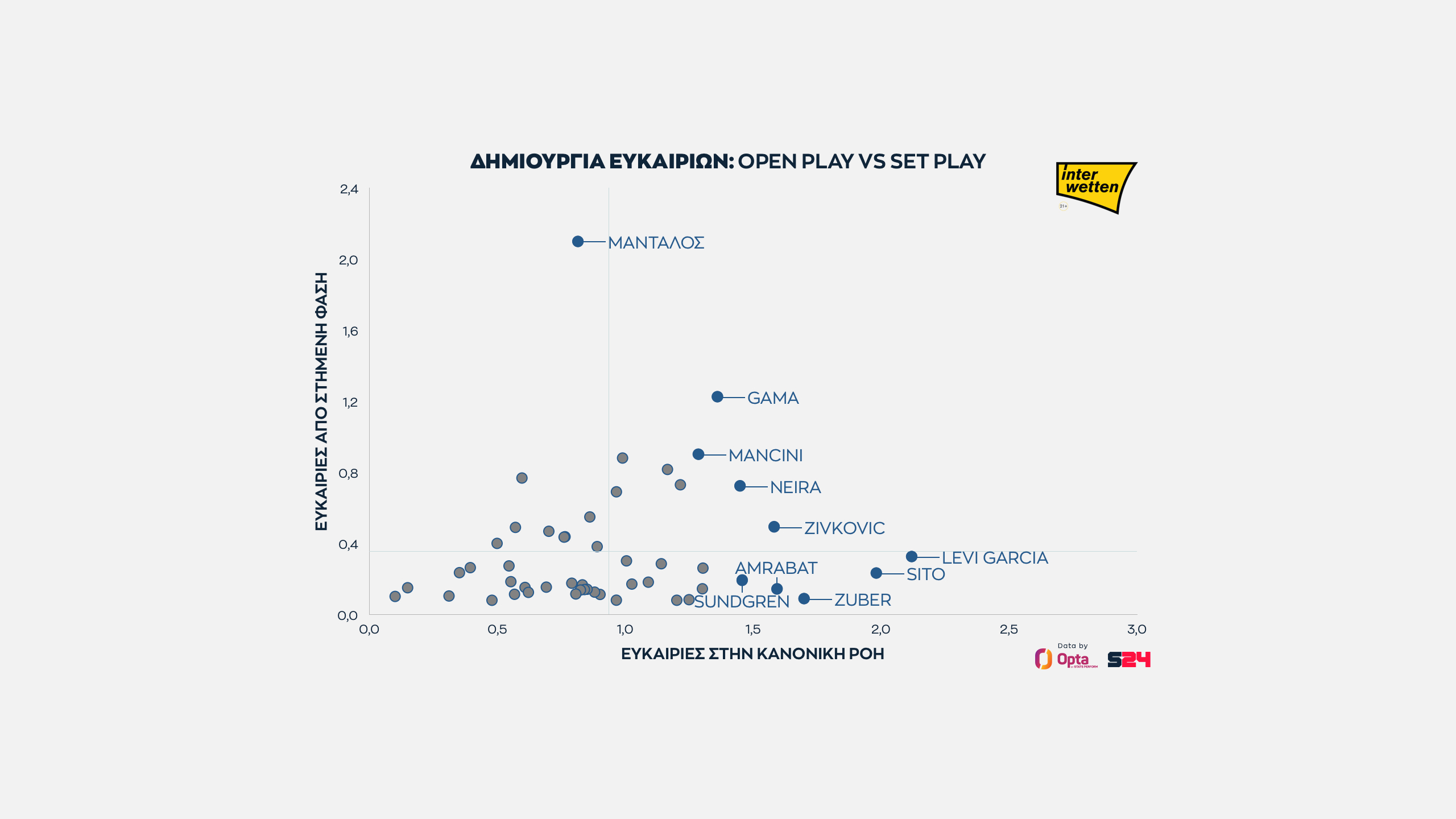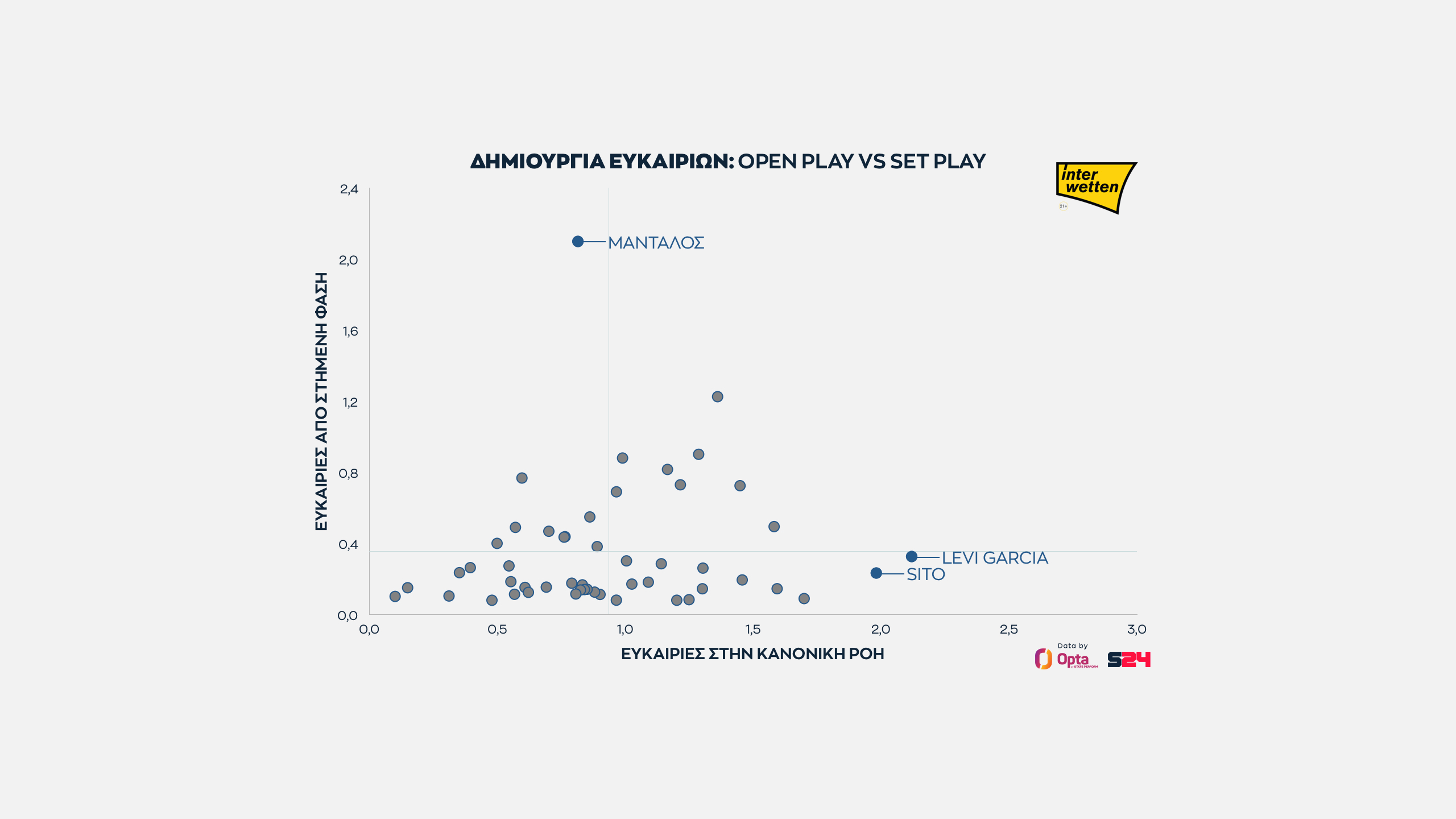 Η ΑΕΚ έχει τις πρωτιές. Στην κορυφή της δημιουργίας από στημένες φάσεις ο Μάνταλος, που όμως είναι κάτω από τον μέσο όρο στη δημιουργία στο open play.